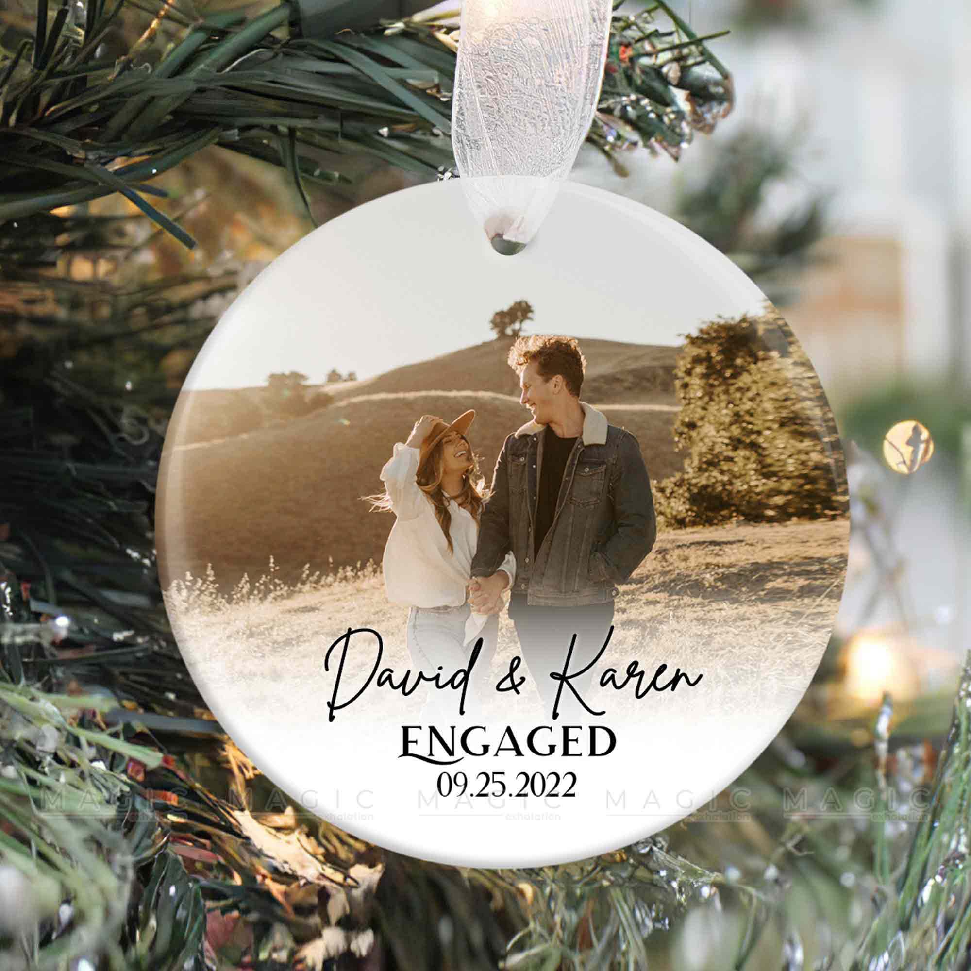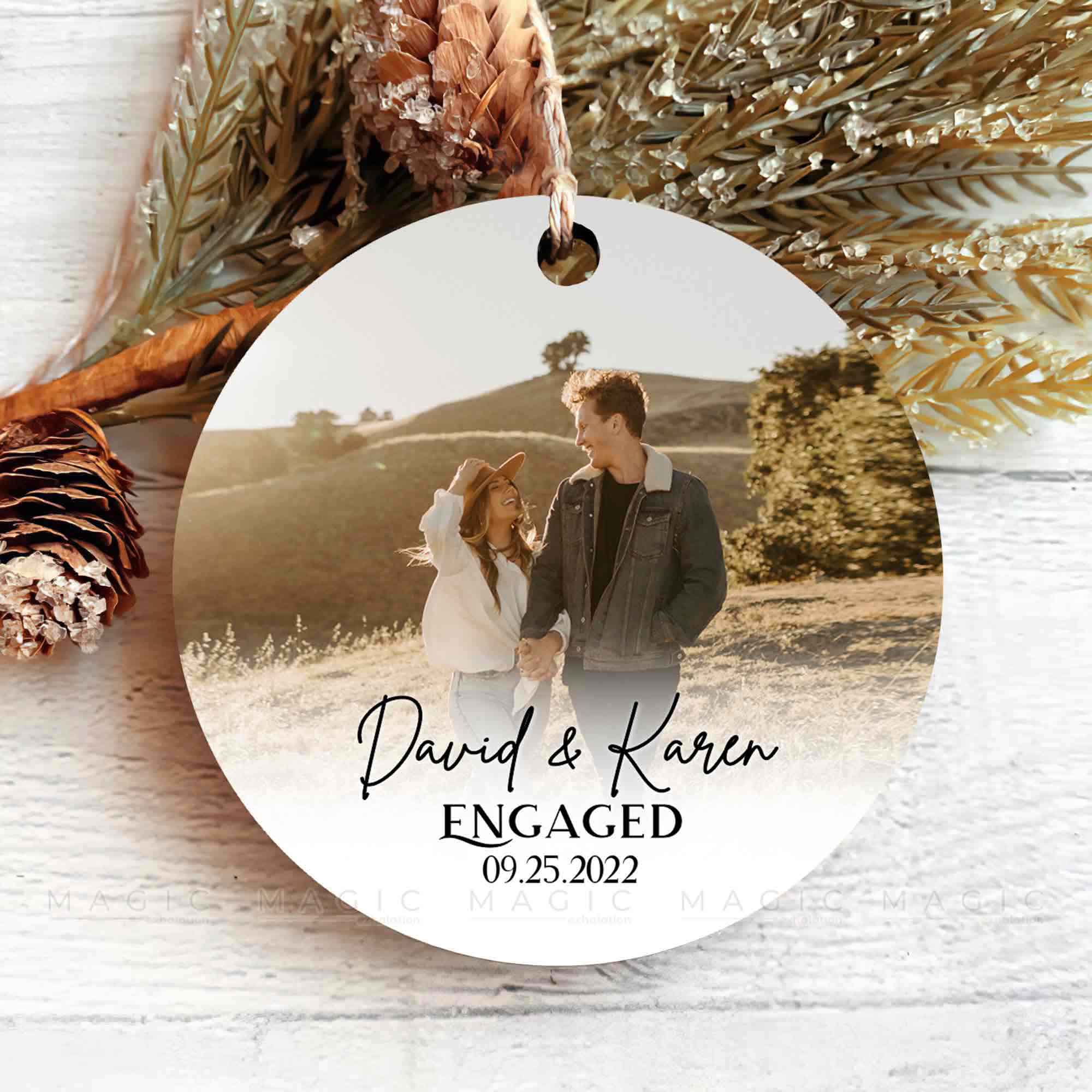 You can personalize it with the couple's name, and wedding date, or even with some designs, you can add a picture of the bride and groom to this engaged Christmas ornament.