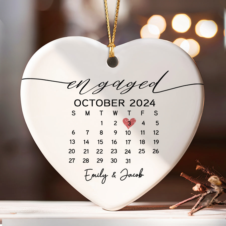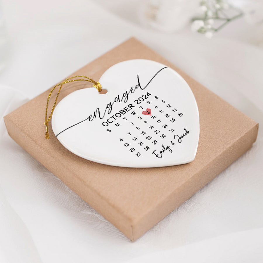 Choose our first christmas engaged ornament | custom name and date ceramic ornament for couple | heart shape to create a meaningful connection, celebrate milestones, and make unforgettable memories. Gift a piece of love today!