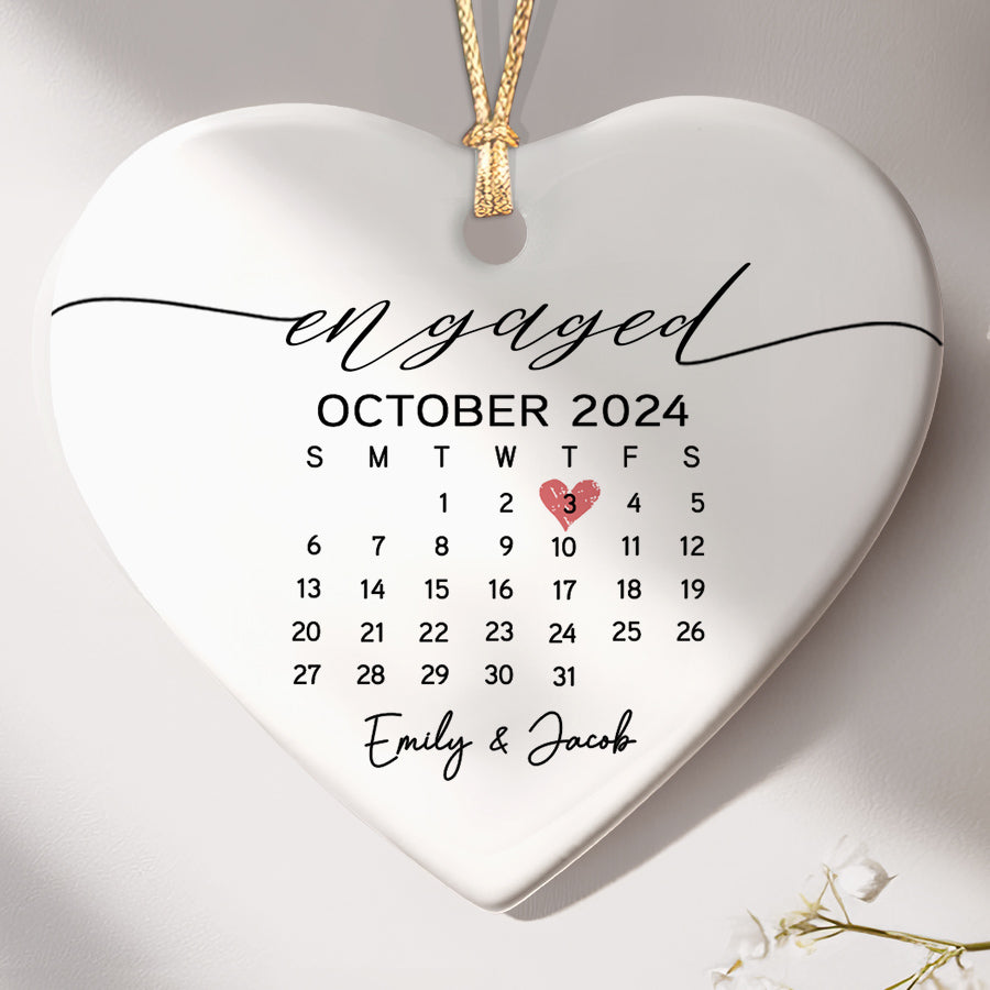 Engagement Xmas Ornament | Custom Name and Date Ceramic Ornament For Couple | Heart Shape