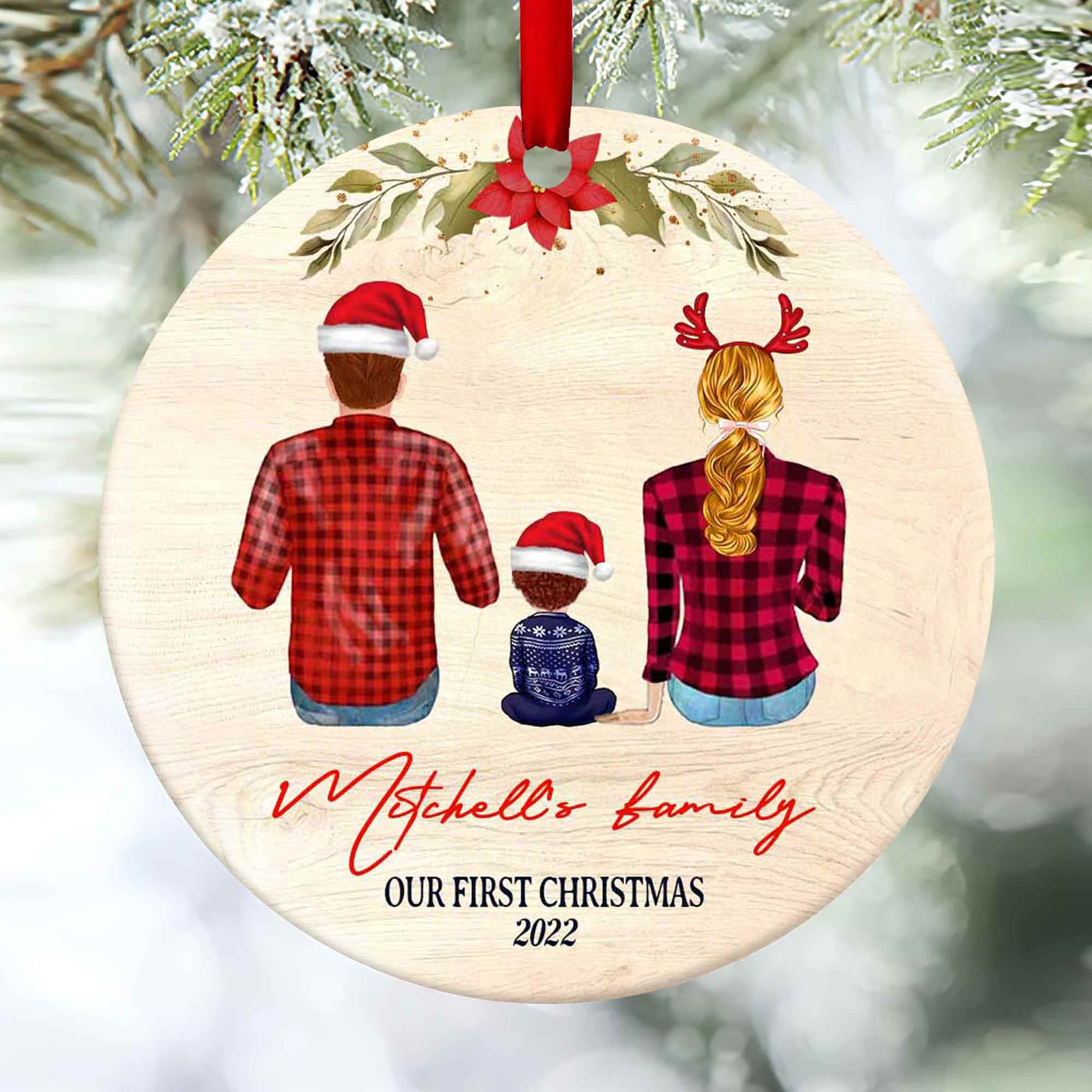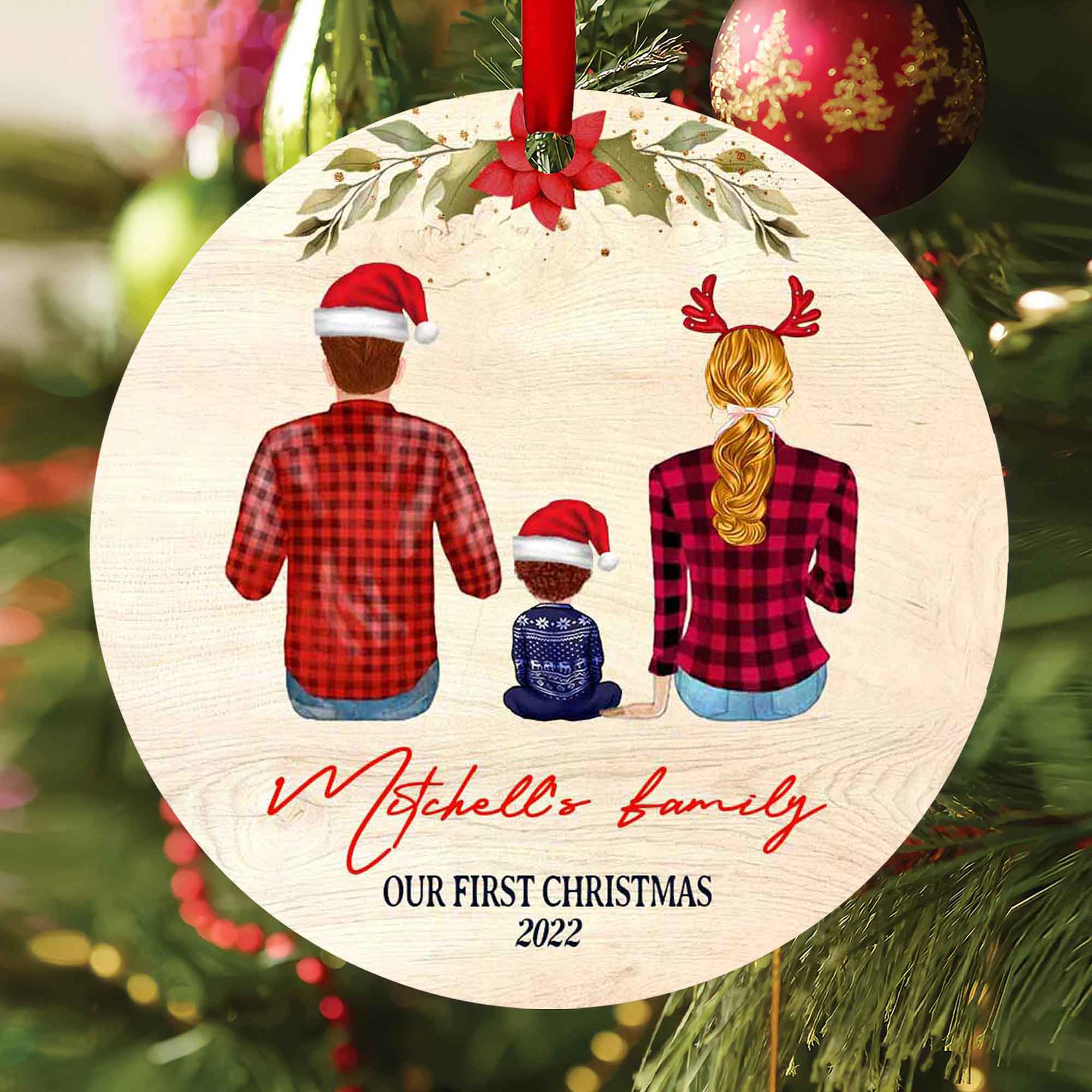 With this lovely family of 3 christmas ornaments, you can customize the appearance of the happy couple by choosing their hairstyles, outfits, and accessories. These personalized couples Christmas ornaments are perfect for decorating your tree or giving as a kind gift to loved ones. They'll brighten up any holiday gathering. Additionally, these ornaments are fantastic keepsakes that will be treasured for years to come thanks to the opportunity.