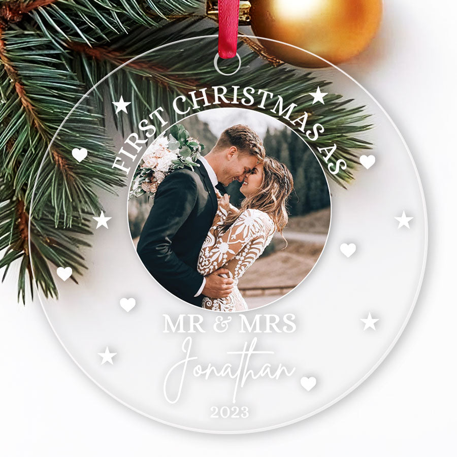 This holiday season, our 1st christmas as mr and mrs ornament | custom photo wedding christmas ornaments | acrylic shape is the perfect way to honor your first Christmas as a married couple.