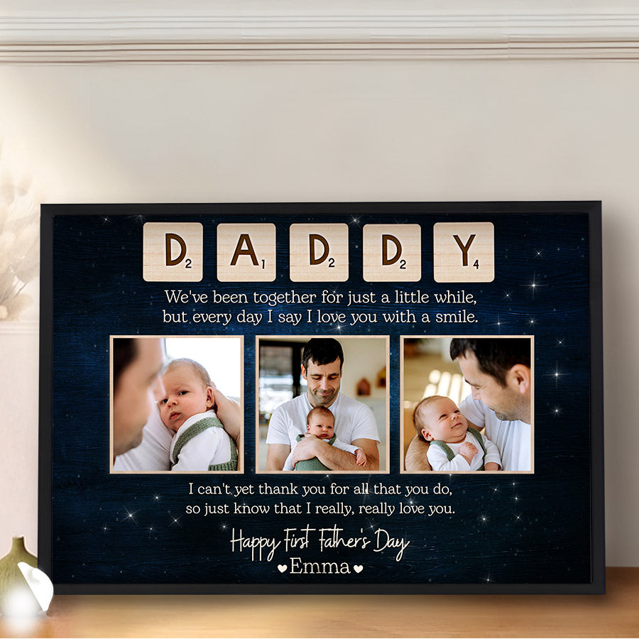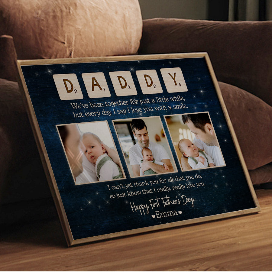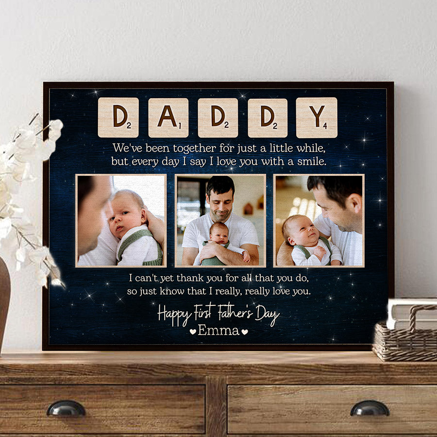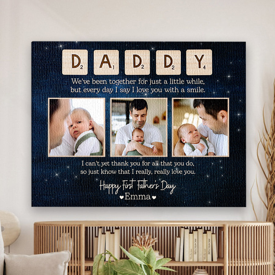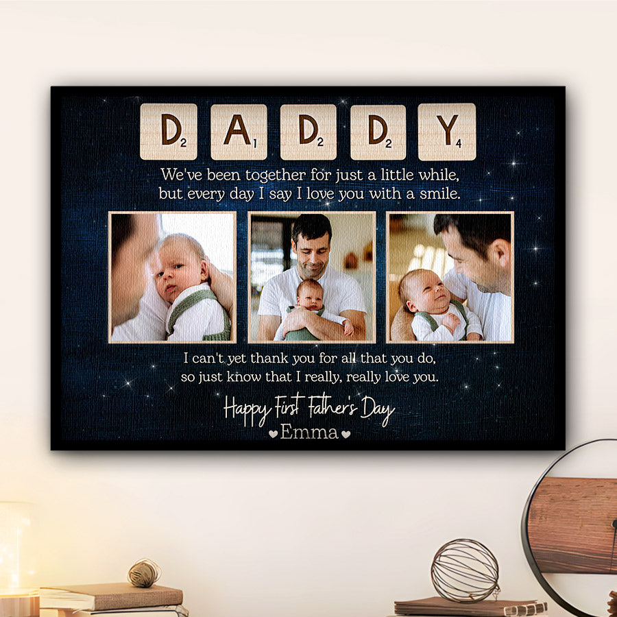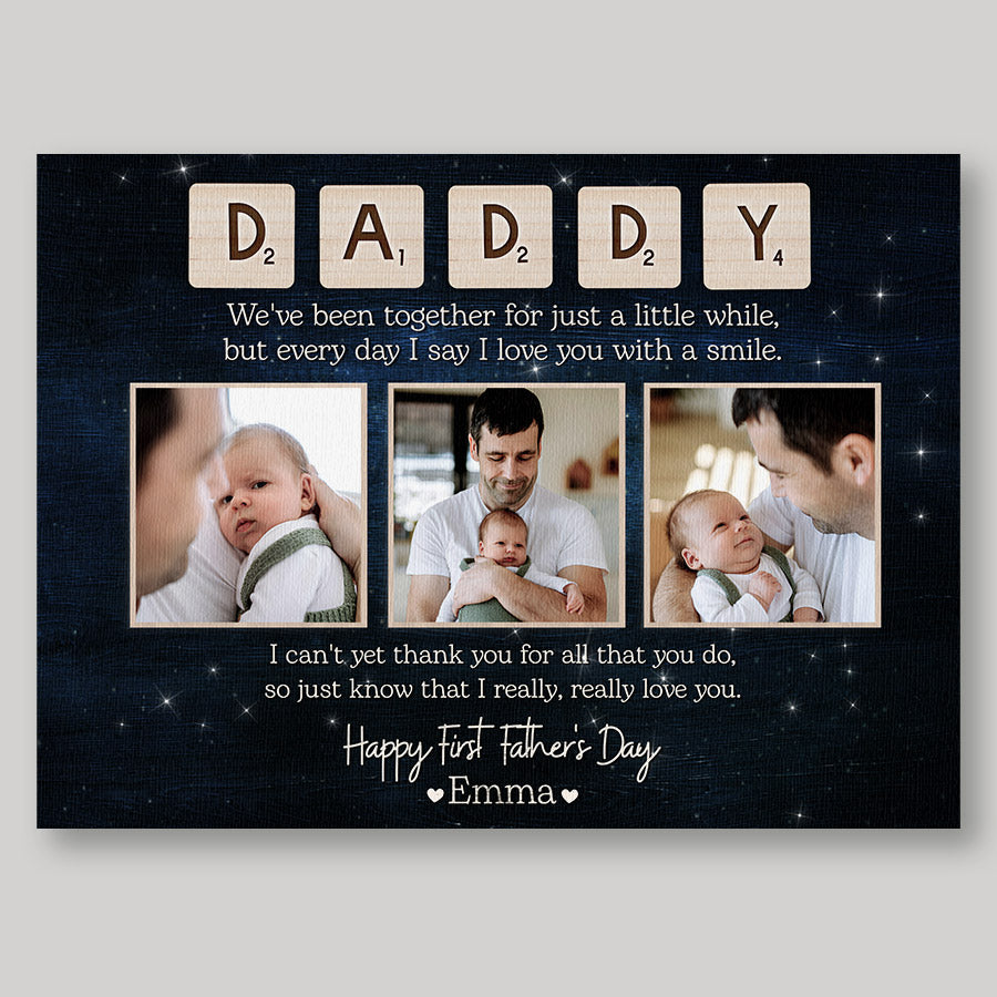 Treat the new dad in your life to 1st fathers day gift | 1st time fathers day gift | father’s day collage canvas that commemorates the baby's arrival and his first Father's Day. Our personalized photo canvas is sure to bring a smile seeing little ones grow up before their eyes. Customize it FREE now - he will love displaying this treasured memory for many years to come.