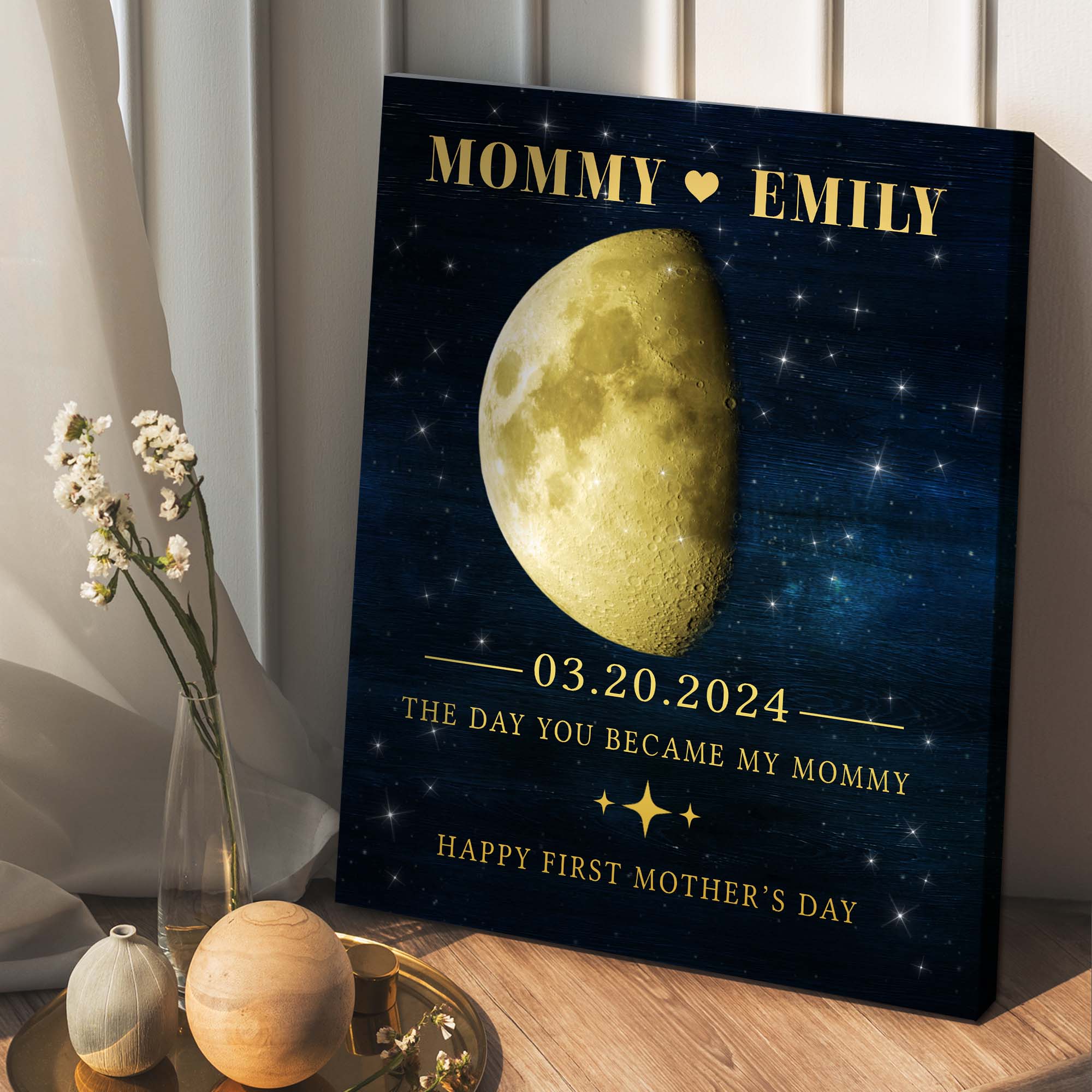 This 1st mothers day gift | personalized moon phase canvas mothers day gifts celebrates your transition into motherhood - a journey that awakens feelings of tenderness, strength and purpose unlike any before.