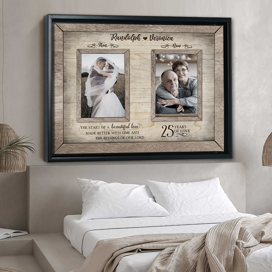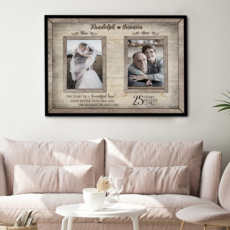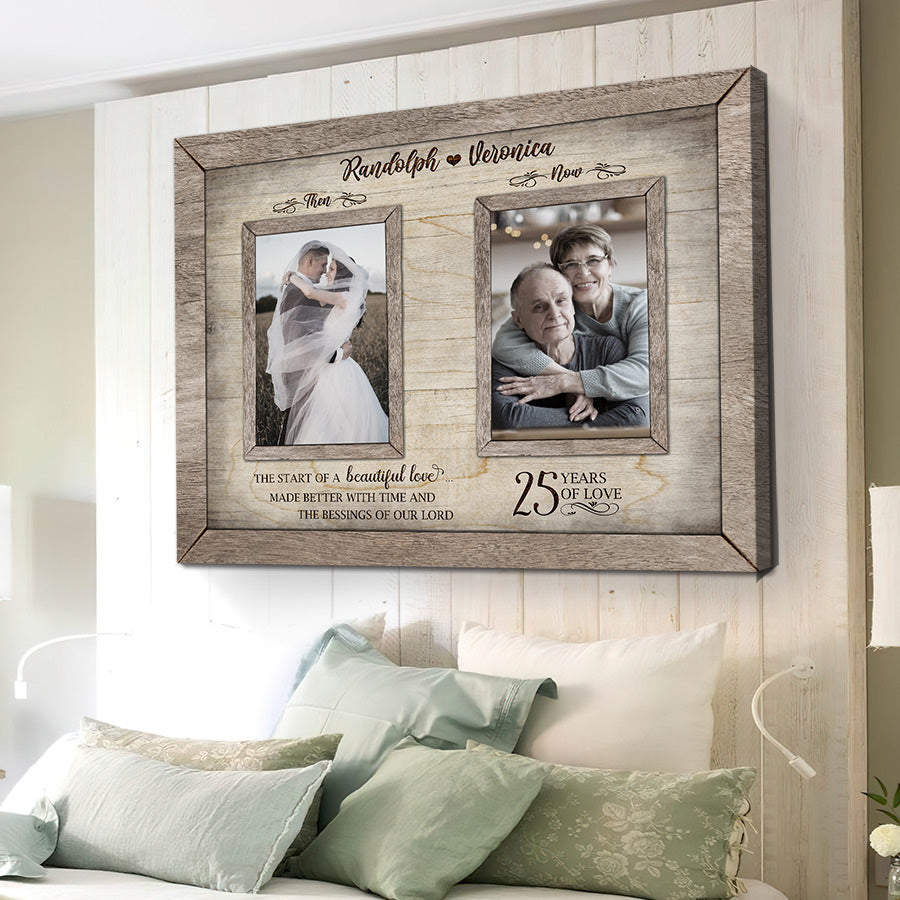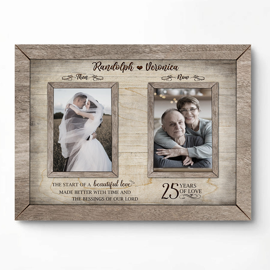 A personalized 25 year anniversary gift | then and now 25th anniversary canvas prints captures a snapshot of your relationship history in a tangible, visually compelling form. Every time your eyes meet the artwork, you'll be transported back to those precious scenes and feelings from your years developing inside jokes, weathering hardships, and creating a home and family together.