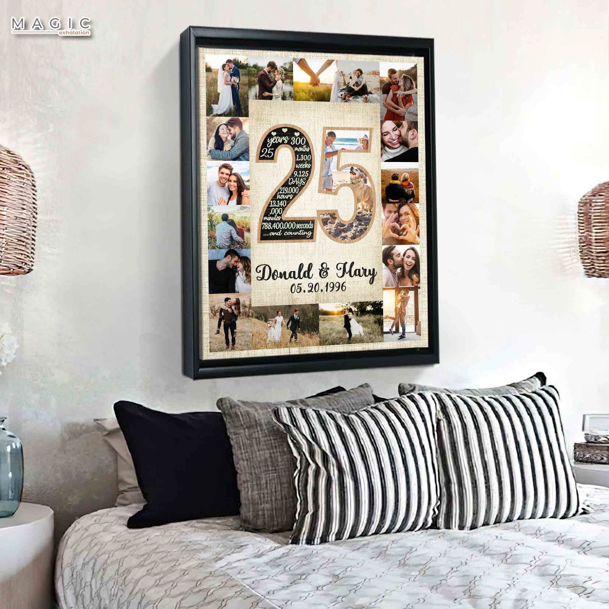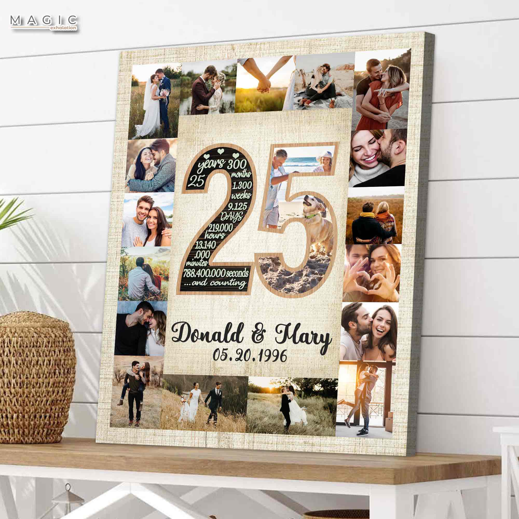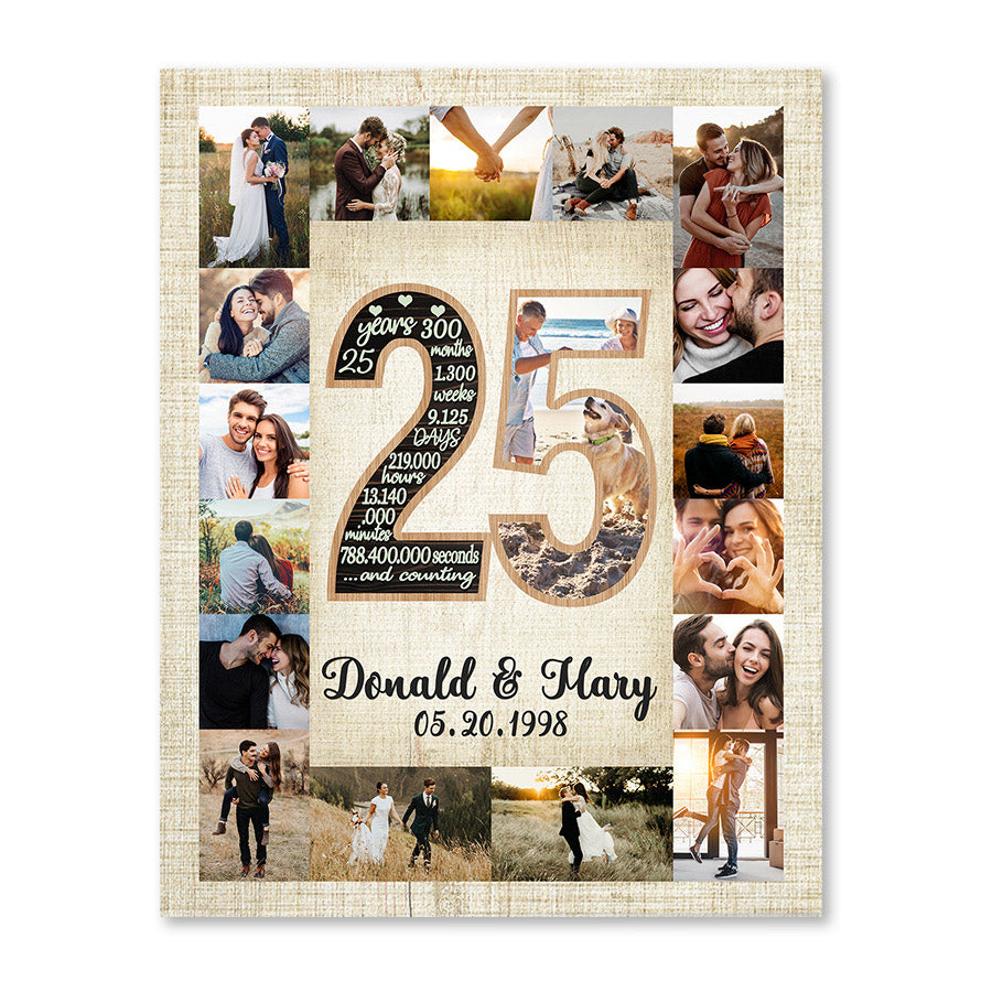 A personalized 25th anniversary gifts for husband | personalized photo collage canvas print captures a snapshot of your relationship history in a tangible, visually compelling form. Every time your eyes meet the artwork, you'll be transported back to those precious scenes and feelings from your years developing inside jokes, weathering hardships, and creating a home and family together.