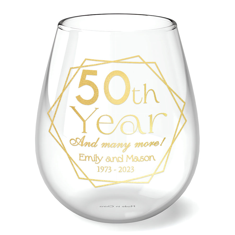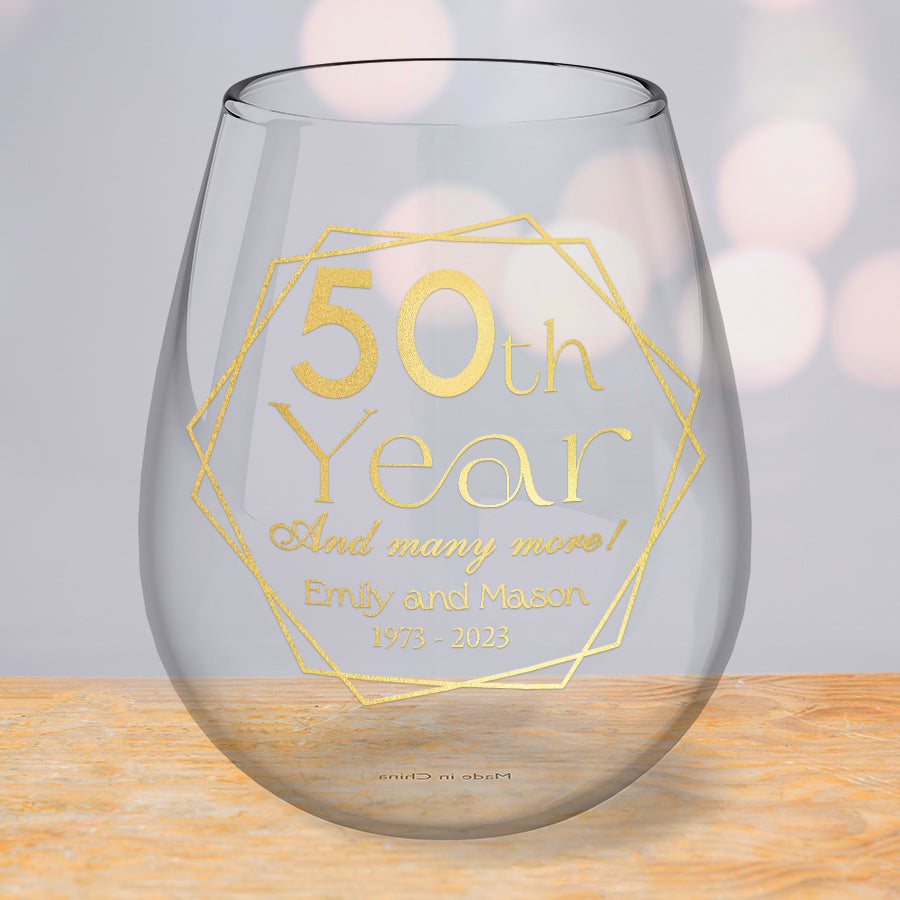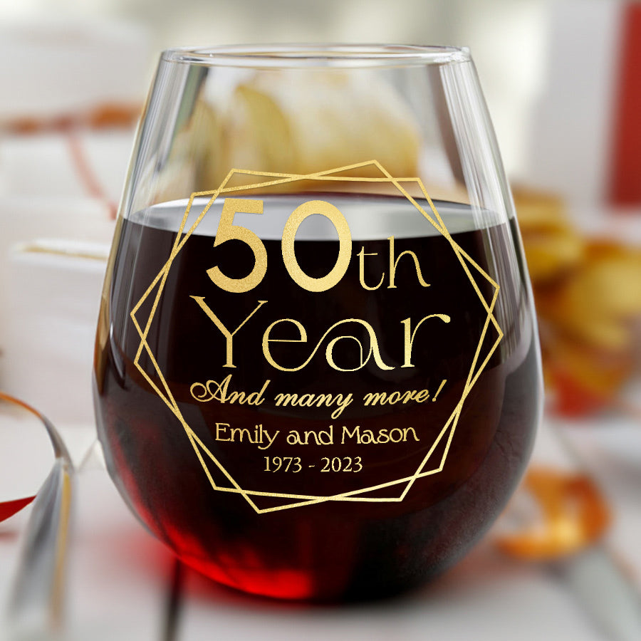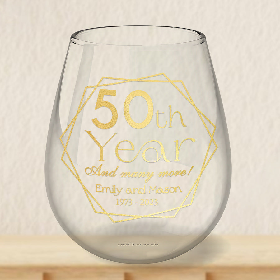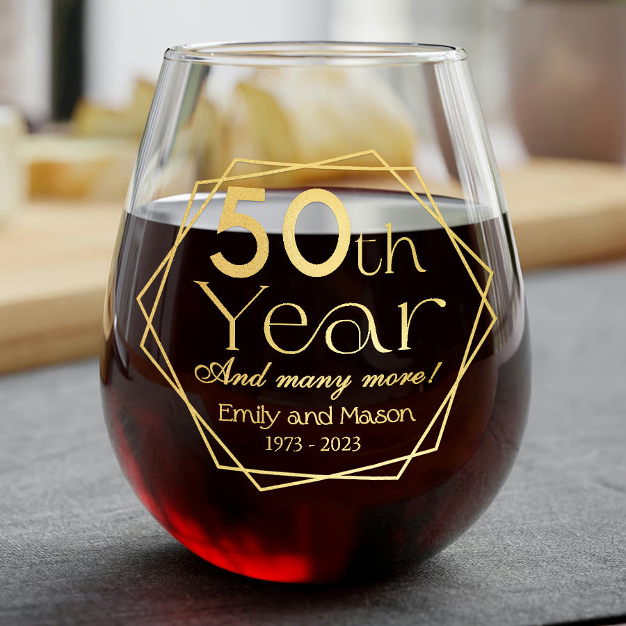 Fifty years of marriage is an accomplishment worth celebrating. The 50 year anniversary gifts | personalized wine glasses for anniversary symbolize the unity, love and companionship you and your spouse have found in each other. They serve as a lasting reminder of the decades of memories you've created together, from starting a family to helping the kids navigate life's challenges. Anniversary glasses honor the laughter you've shared, the hardship you've overcome and the joy you continue to find in each other's company after all these years.