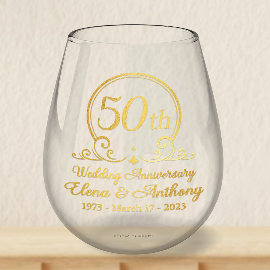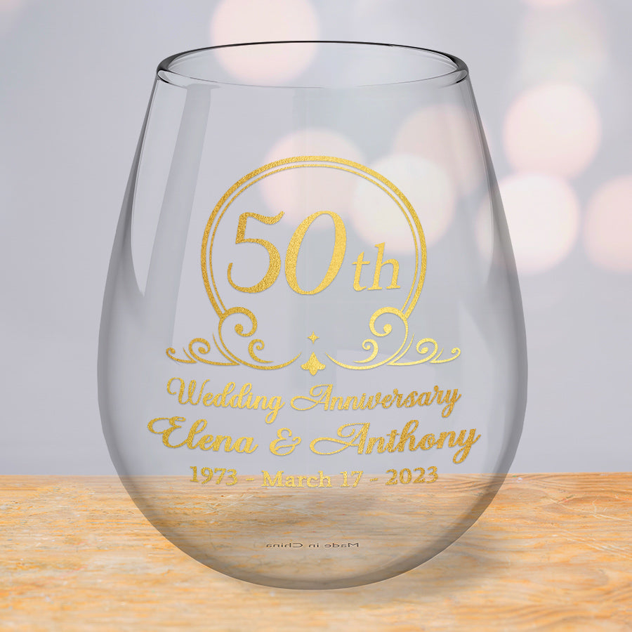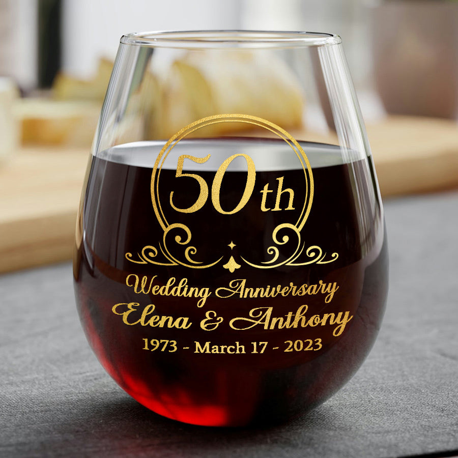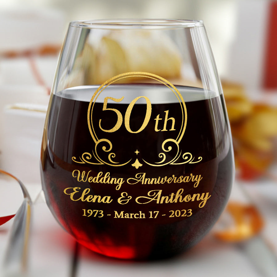 Fifty years of marriage is an accomplishment worth celebrating. The 50th wedding anniversary gift | personalized 50th anniversary wine glasses symbolize the unity, love and companionship you and your spouse have found in each other. They serve as a lasting reminder of the decades of memories you've created together, from starting a family to helping the kids navigate life's challenges. Anniversary glasses honor the laughter you've shared, the hardship you've overcome and the joy you continue to find in each other's company after all these years.