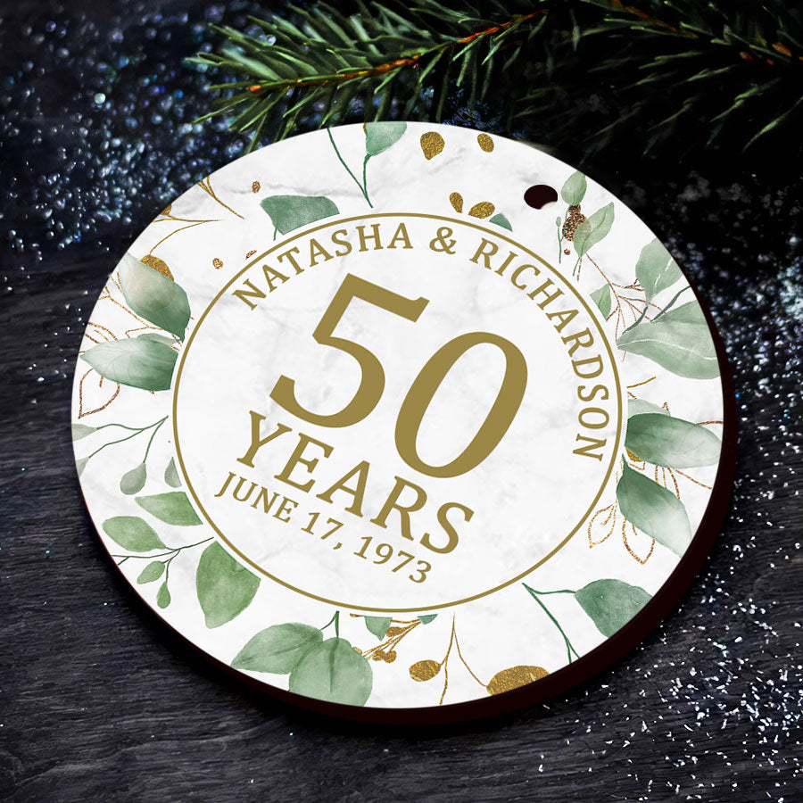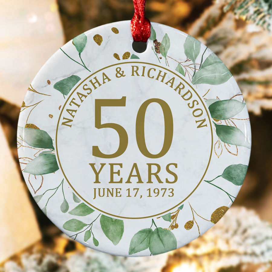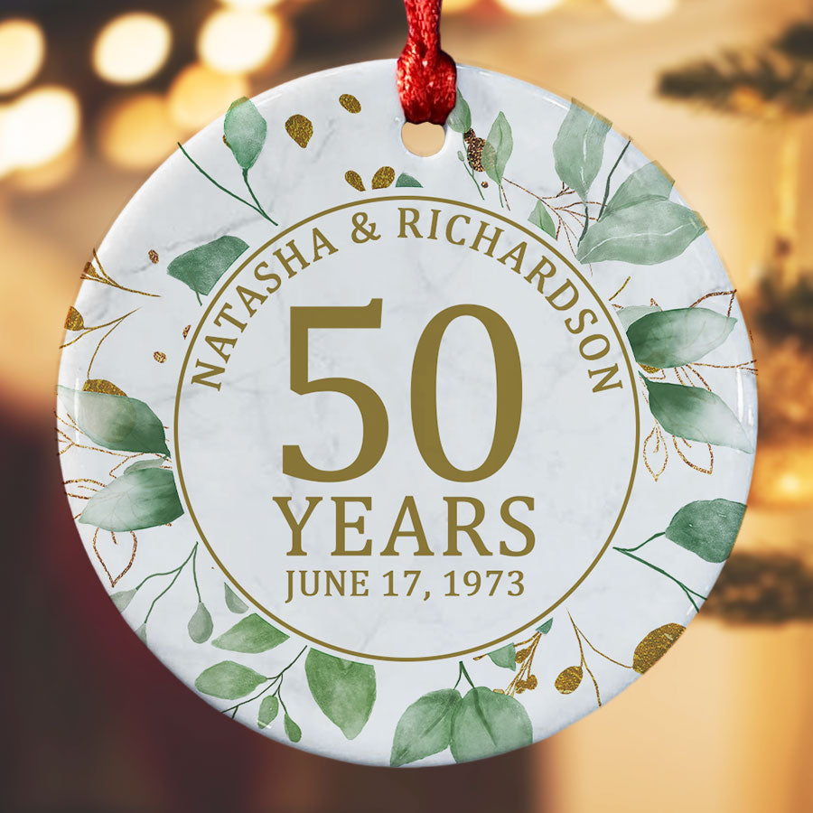 Celebrating 50 years of love and partnership is truly special. Gift your parents a 50th wedding anniversary ornament | personalized 50th anniversary ornament to commemorate their gold anniversary. Hanging on the tree each Christmas will serve as a meaningful reminder of the couple's lifelong commitment. The beautiful Anniversary gifts - they capture the love, memories, and joy that have been shared by the couple. The 50th Anniversary Gifts symbolize the bond that has lasted through five decades together.