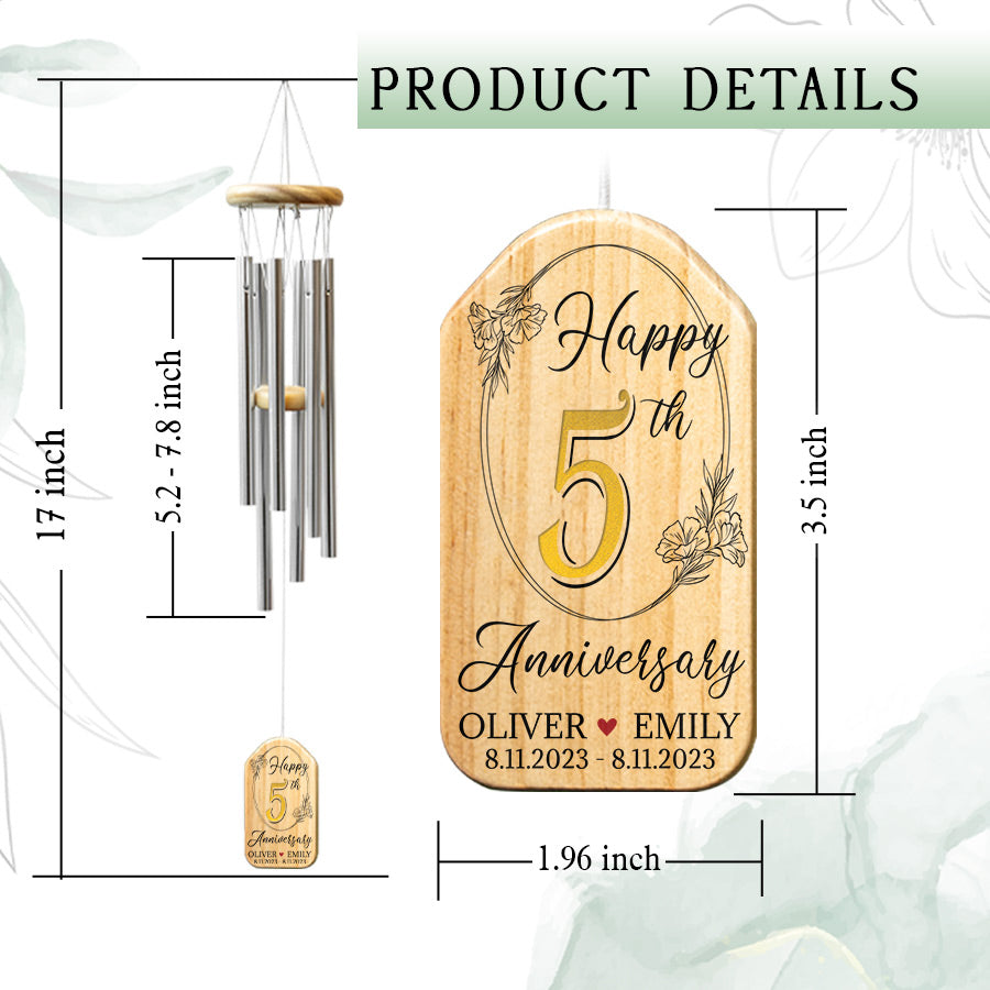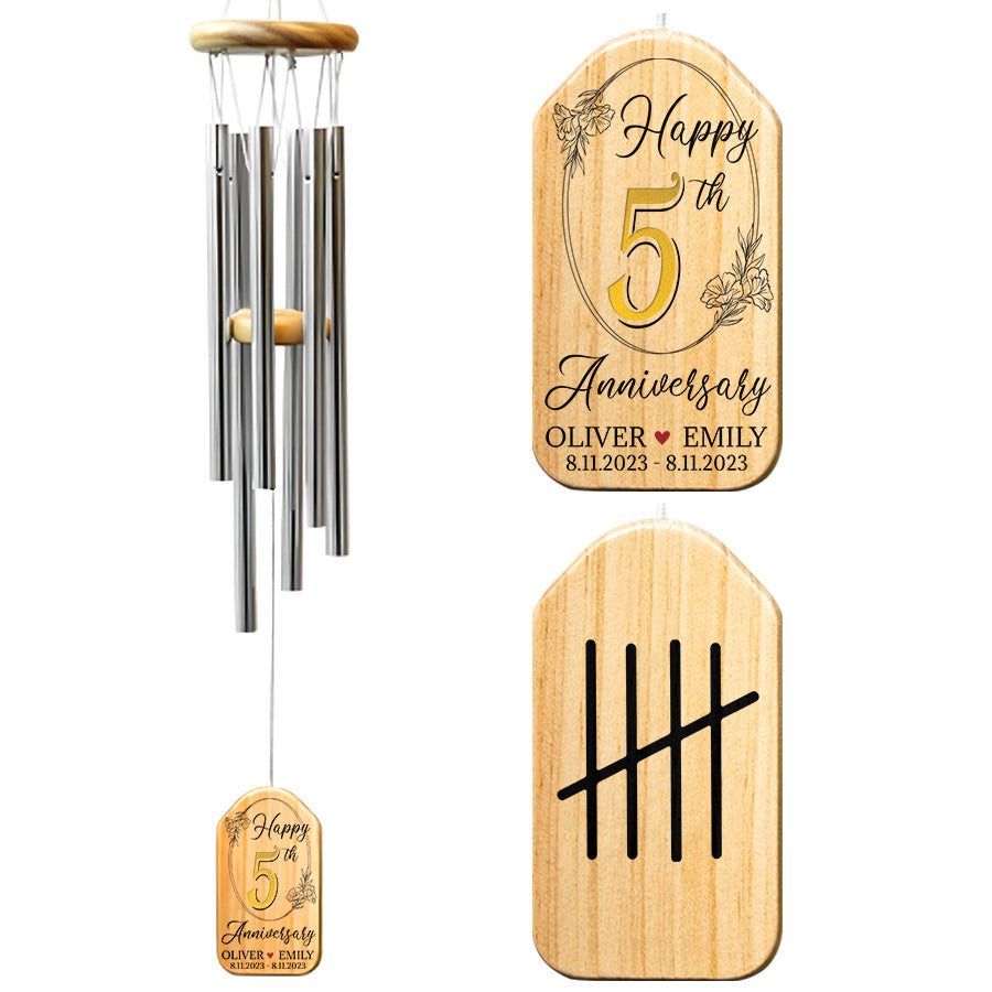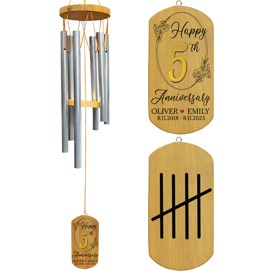 Anniversary Gifts Wood | Personalized Wind Chimes Anniversary | Wind Chimes With Names | 5 Years TogetherShop now 5th wedding anniversary gift for him | personalized anniversary wind chimes to give your loved one an anniversary wind chime that represents the memories being made, year after year. The music will remain long after the gift, evoking a lifetime of love with each gentle note.
