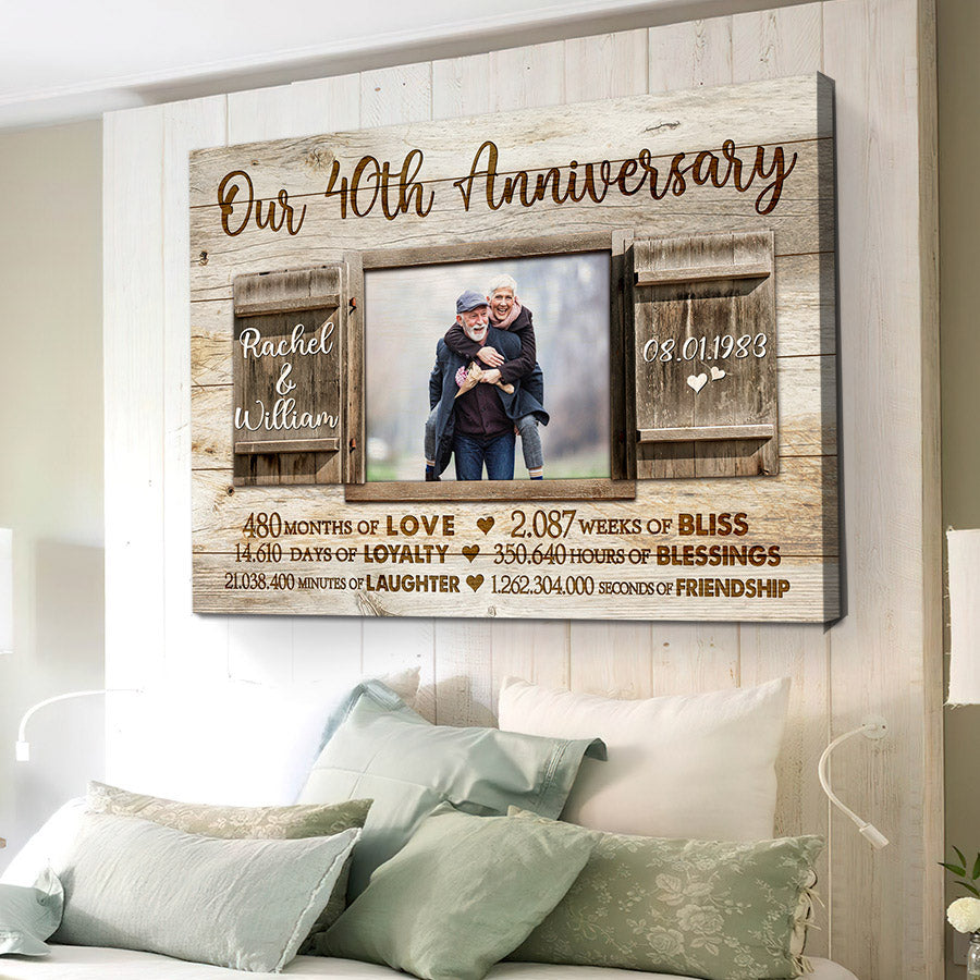 A personalized canvas print perfectly celebrates your 40th wedding anniversary by encapsulating four decades of love, joy, and partnership in a truly treasured gift. As a family heirloom, it allows future generations to witness the happiness and constancy that define your love story.