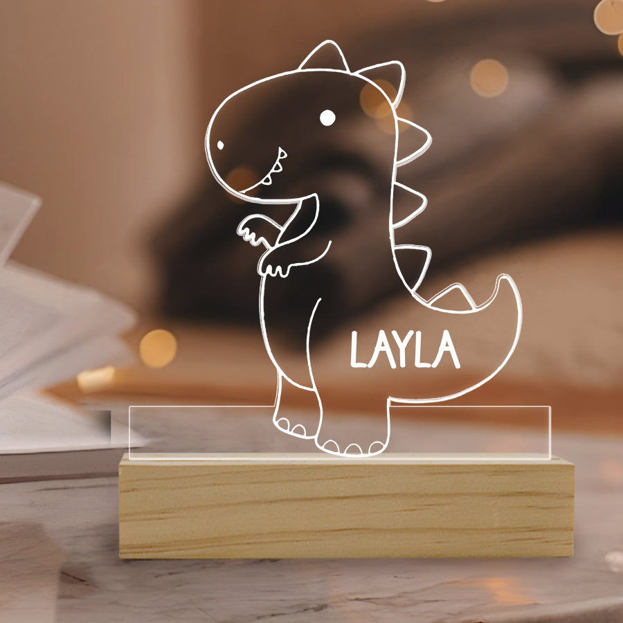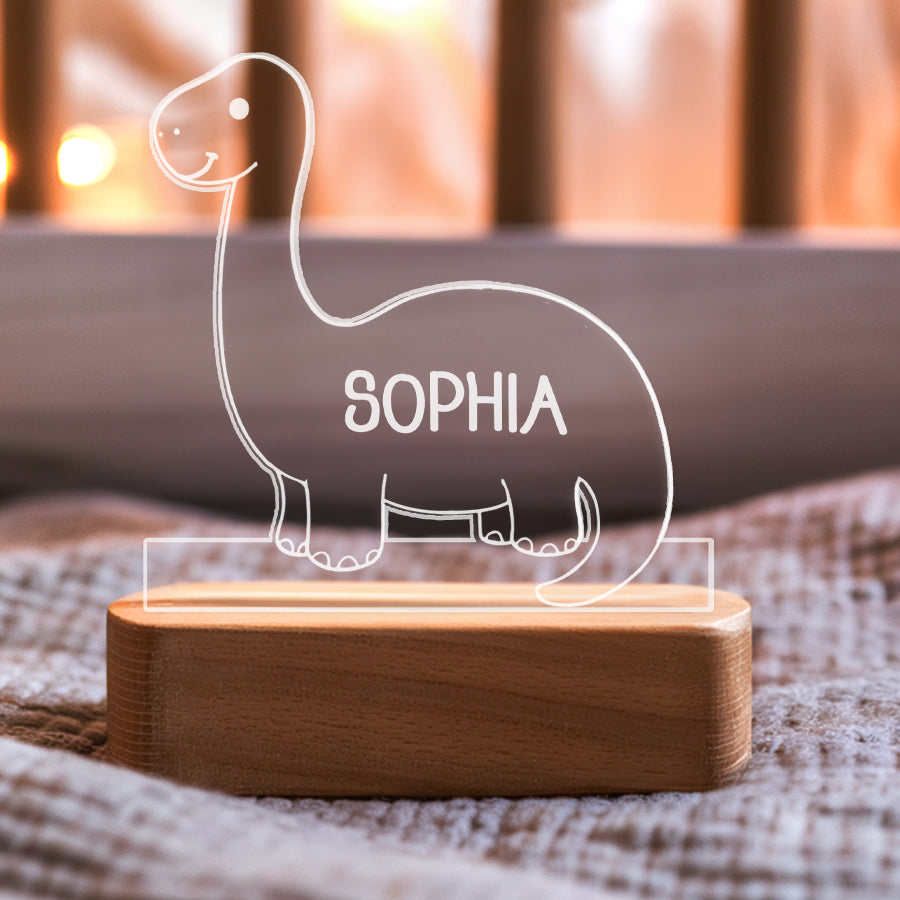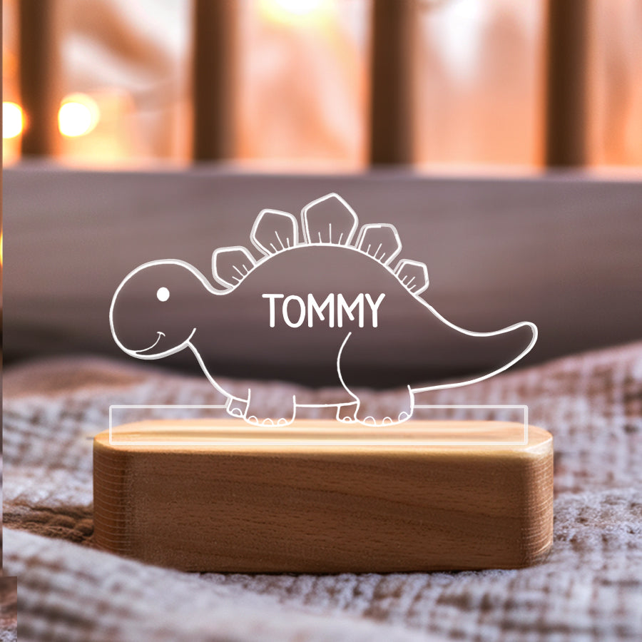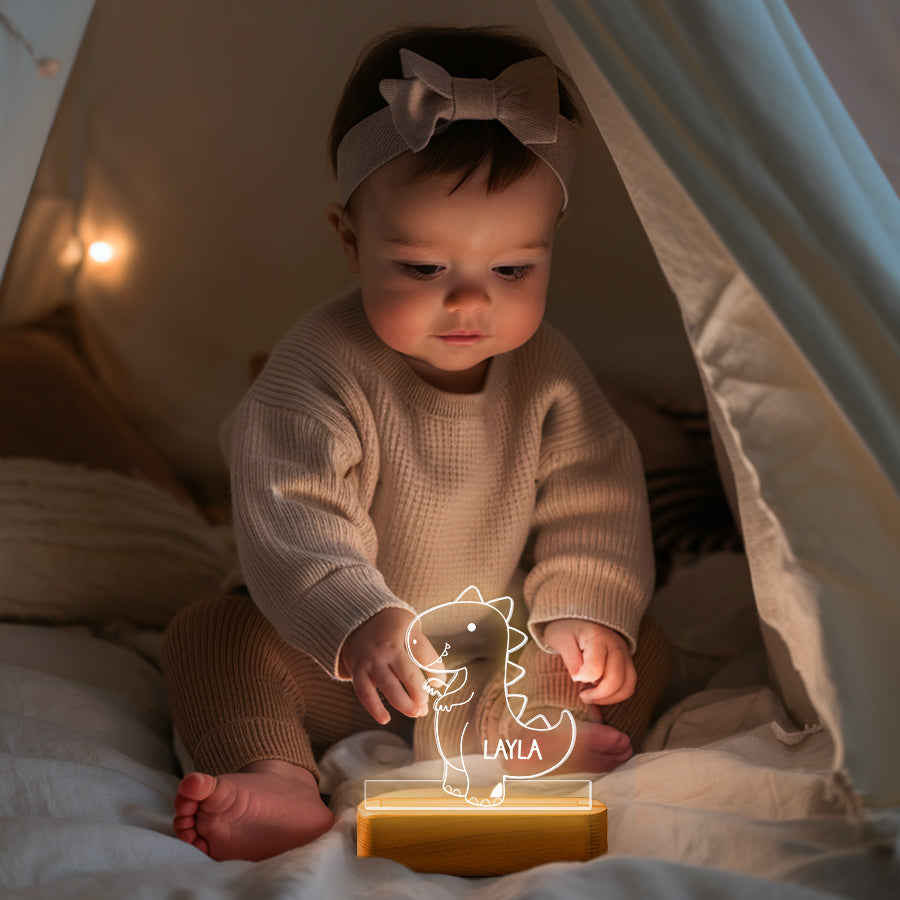 Instead of bright overhead lights that could disrupt sleep, a baby night light | kids personalized acrylic night light dinosaur casts a dim ambient glow. It allows tired parents to see well enough to care for a baby without full brightness. The low-level light is also less startling if the baby wakes.