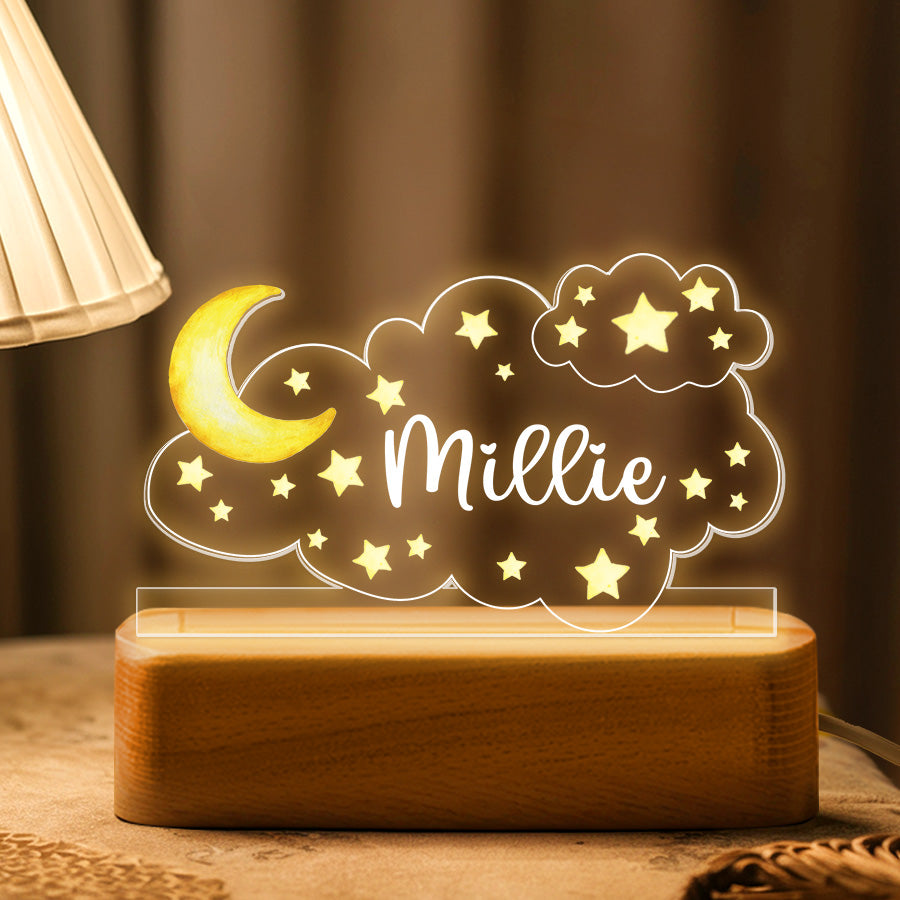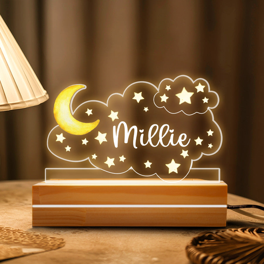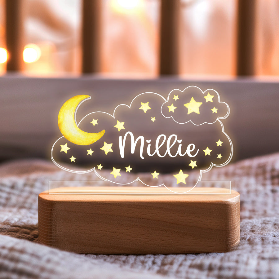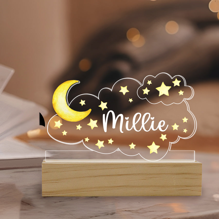 Instead of bright overhead lights that could disrupt sleep, a baby night light | personalized night light with moon & stars casts a dim ambient glow. It allows tired parents to see well enough to care for a baby without full brightness. The low-level light is also less startling if the baby wakes.