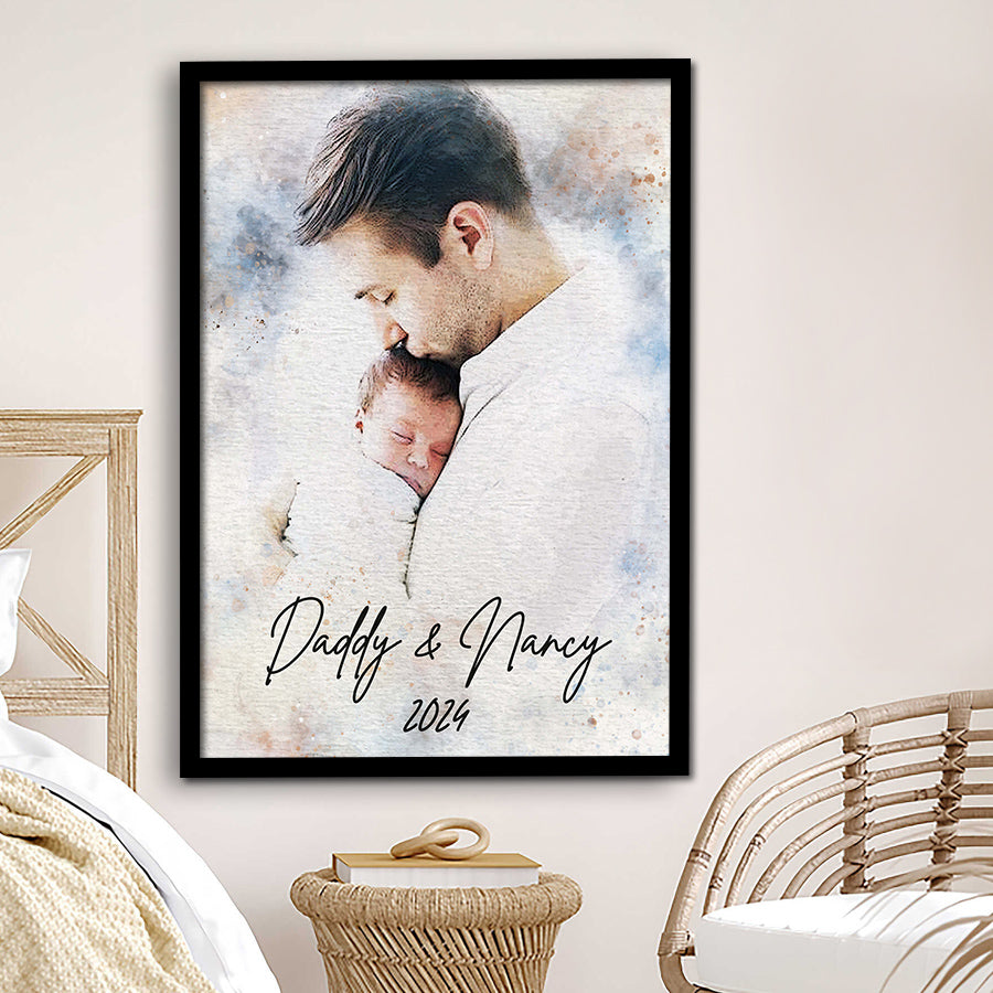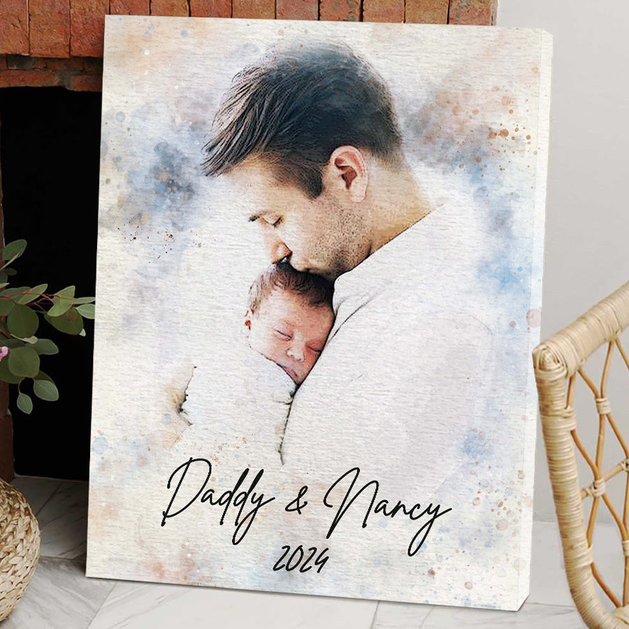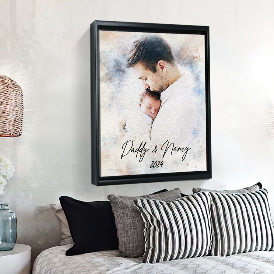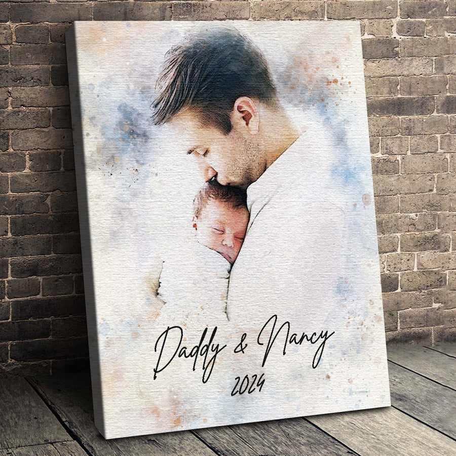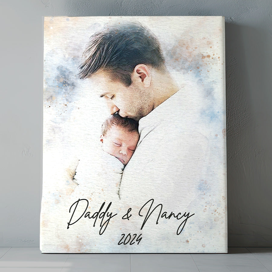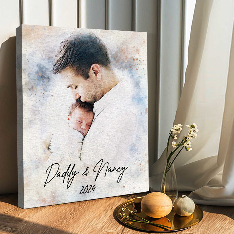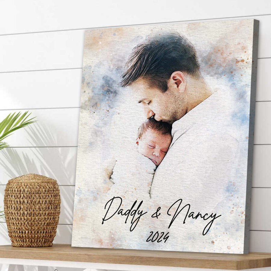 Our personalized canvas décor makes the perfect watercolor portrait from photo | 1st fathers day gift. For a new father, nothing compares to the joy, love, and responsibility that comes with embracing his new role.