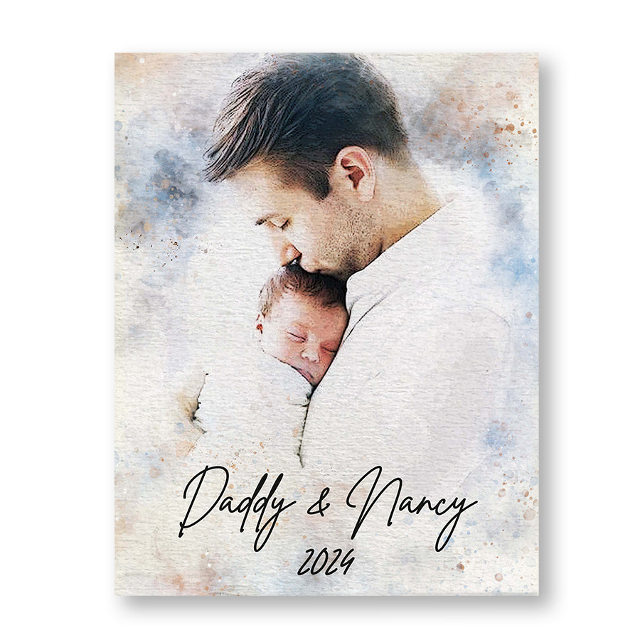 Treat the new dad in your life to watercolor portrait from photo | 1st fathers day gift that commemorates the baby's arrival and his first Father's Day. Our personalized photo canvas is sure to bring a smile seeing little ones grow up before their eyes. Customize it FREE now - he will love displaying this treasured memory for many years to come.