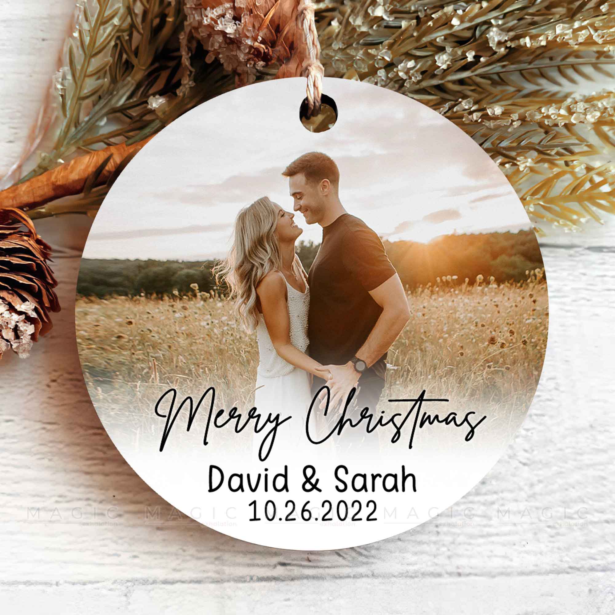 You can personalize it with the couple's name, and wedding date, or even with some designs, you can add a picture of the bride and groom to this engaged Christmas ornament.