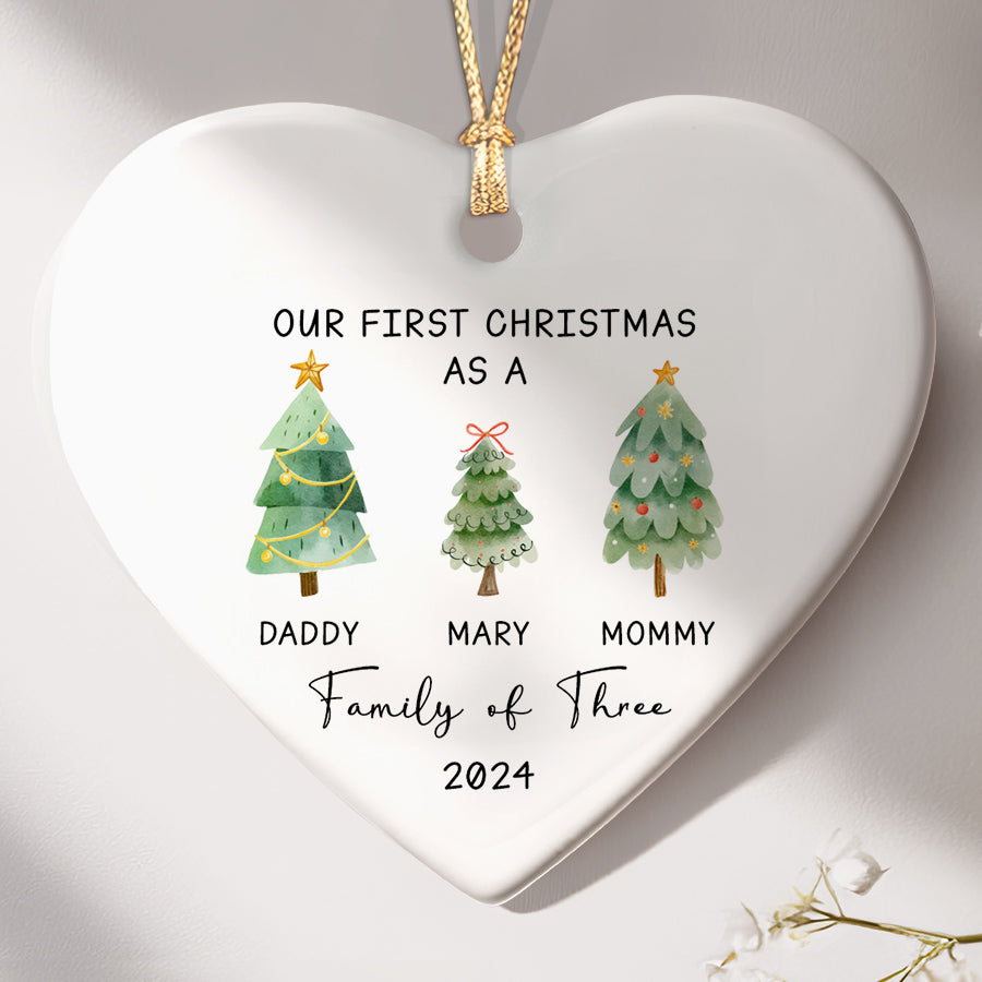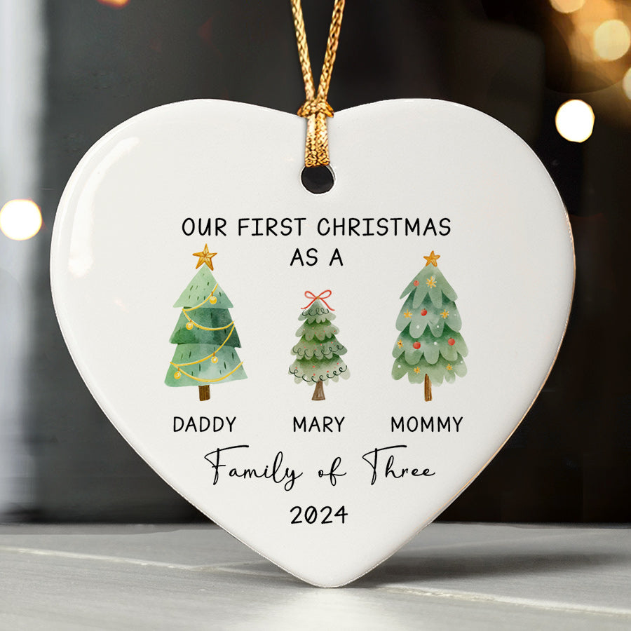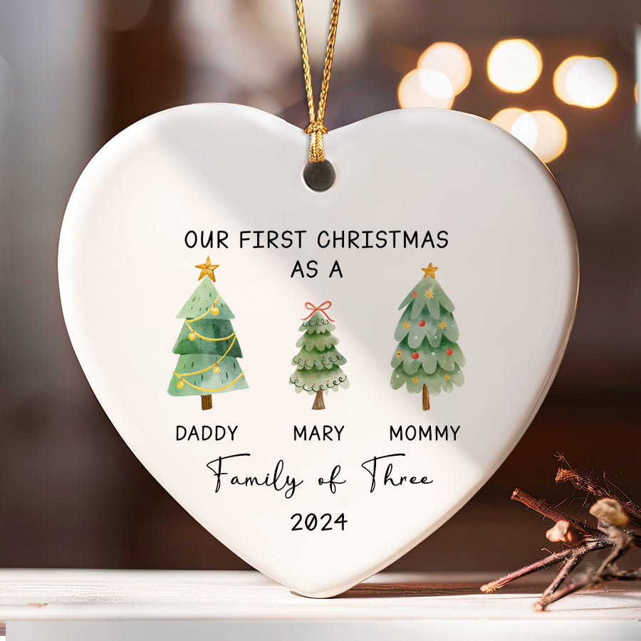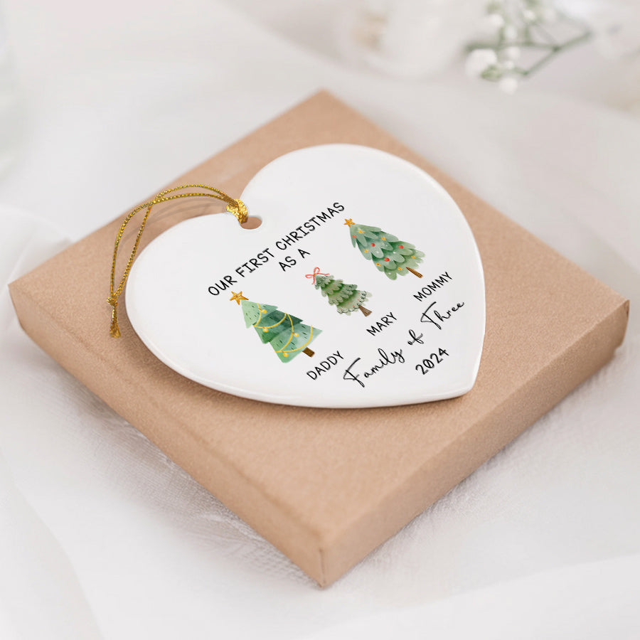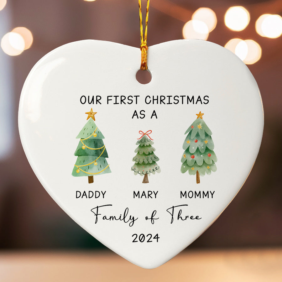 Every family has special moments. Let this custom family ornament | first christmas family of 3 ceramic ornament | heart shape become a symbol of love and cherished memories in your family!