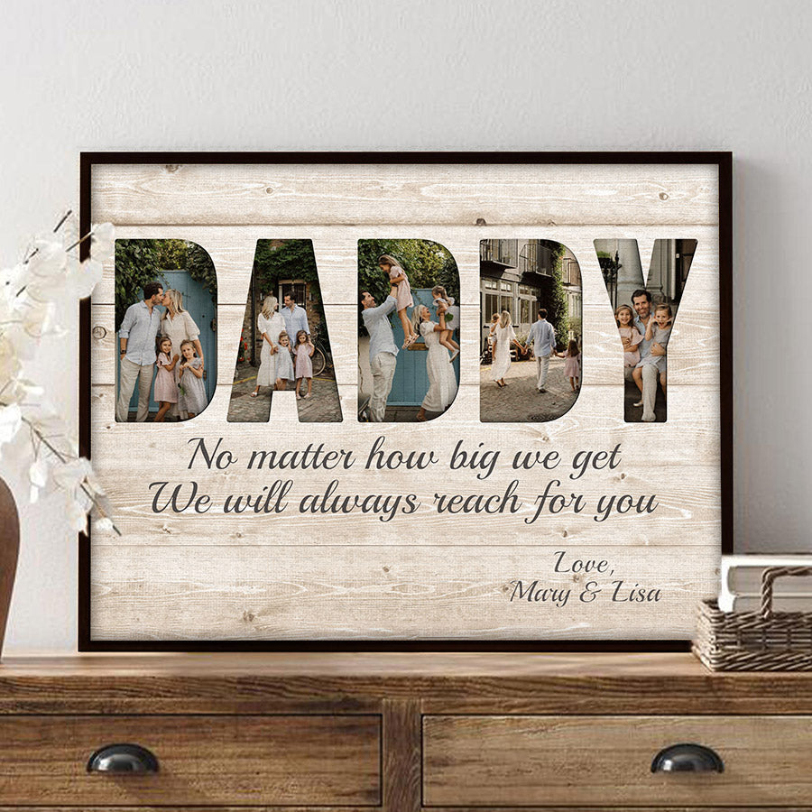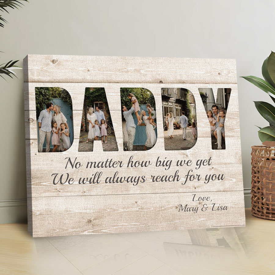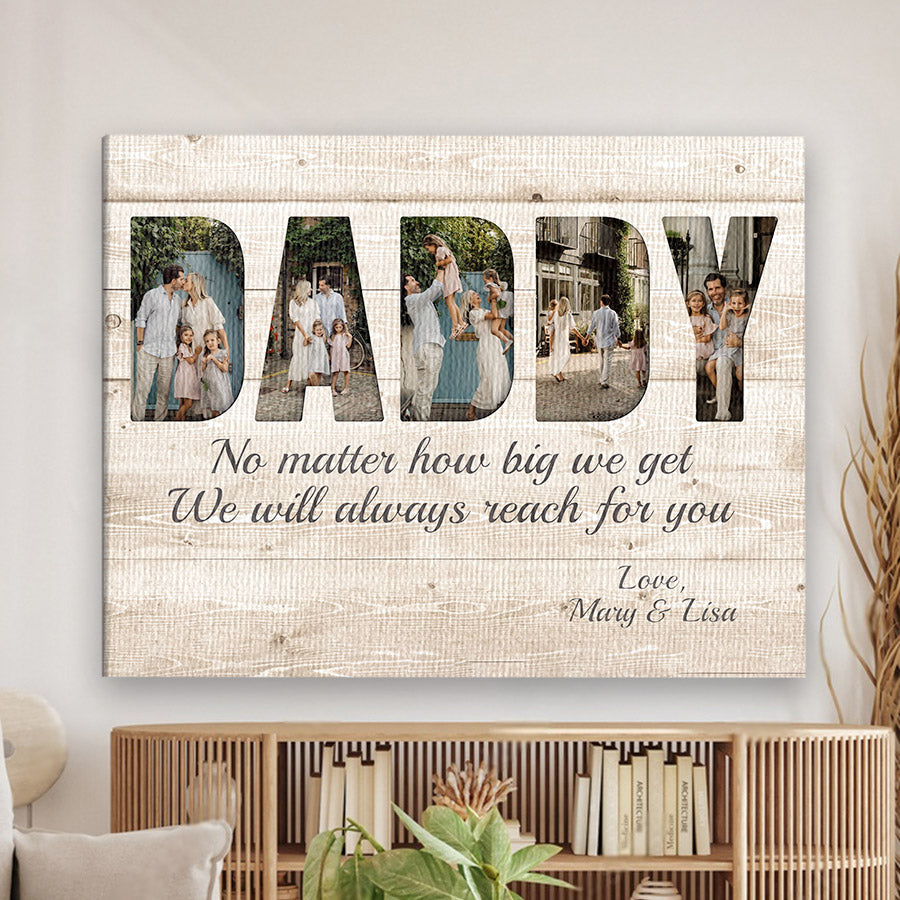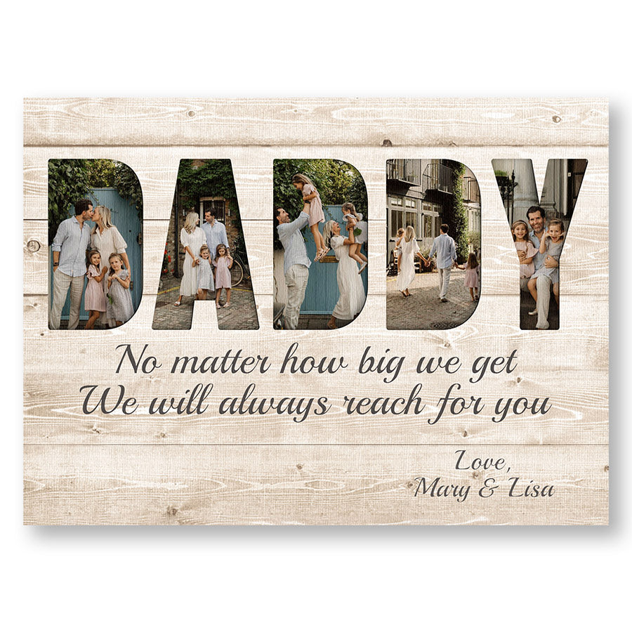 The crisp resolution of this custom fathers day gift | personalized fathers day gift allows you to select photos with fine details that will be preserved for years to come. But more than just pictures, this gift conveys the deep love, gratitude and respect you feel for everything Dad has done for you. On Father's Day, a day set aside to honor fatherhood and all the hard work dads do every day, this personalized canvas is a thoughtful way to let him know how much you value him and celebrate all he has provided throughout the years.