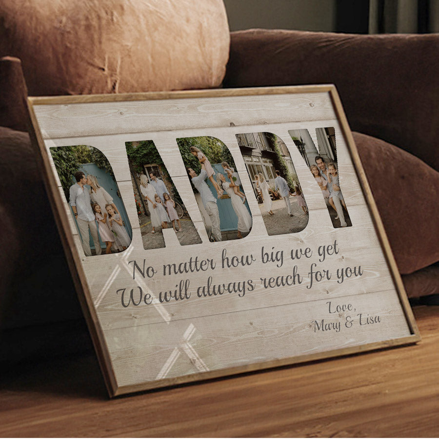What better way to show your appreciation for Dad than a custom fathers day gift | personalized fathers day gift | canvas father’s day gift that captures memories you've created together over the years? This high-quality gift comes ready to be customized with photos that will bring a smile to his face each time he looks at it. From childhood pictures to recent family vacations, you can select images that remind him of how much he means to you and your family.