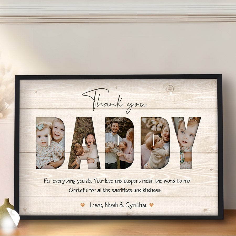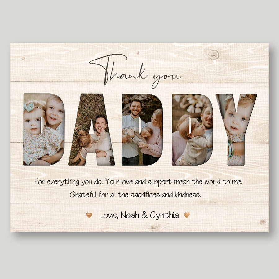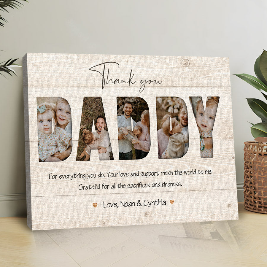 The crisp resolution of this custom fathers day gift | personalized fathers day gift | fathers day gift for dad allows you to select photos with fine details that will be preserved for years to come. But more than just pictures, this gift conveys the deep love, gratitude and respect you feel for everything Dad has done for you. On Father's Day, a day set aside to honor fatherhood and all the hard work dads do every day, this personalized canvas is a thoughtful way to let him know how much you value him and celebrate all he has provided throughout the years.
