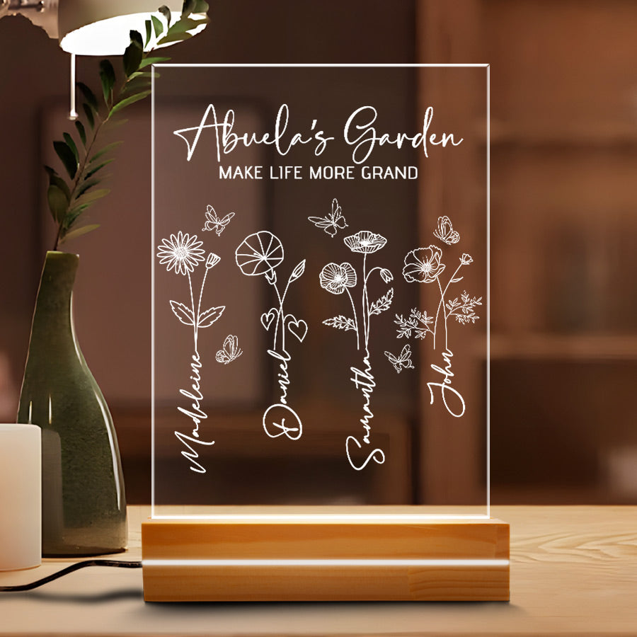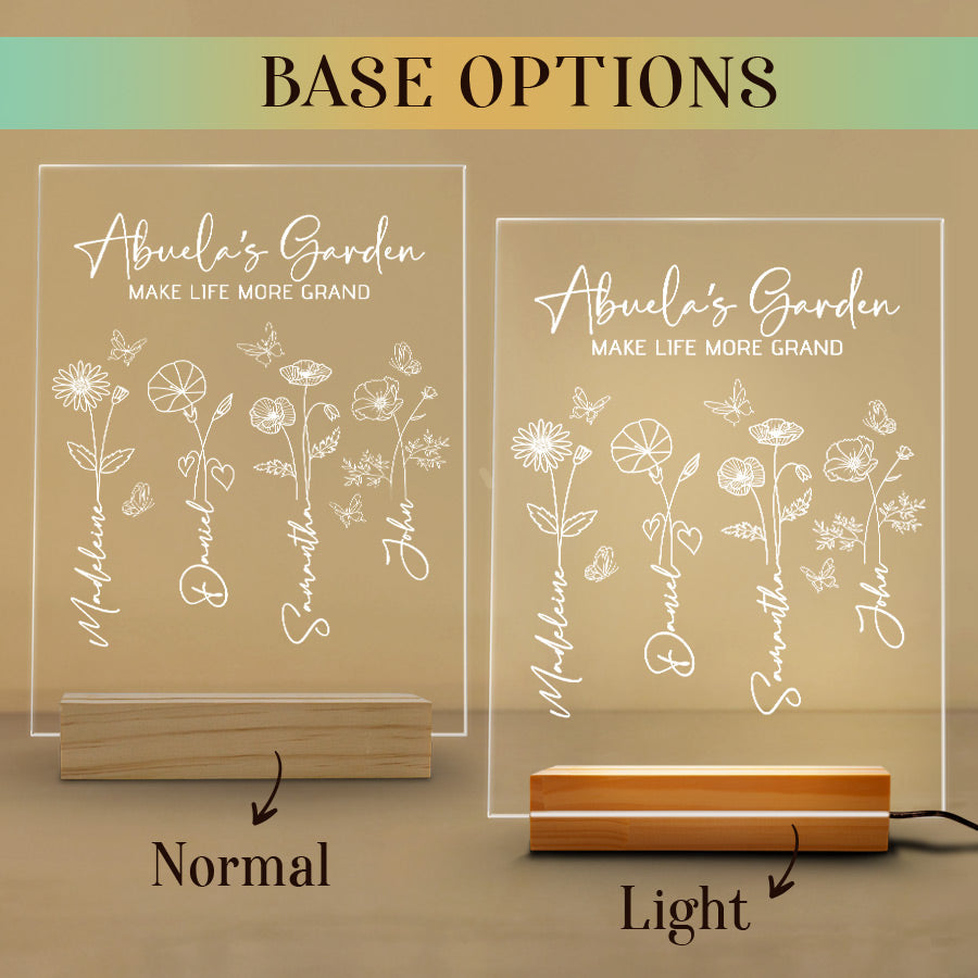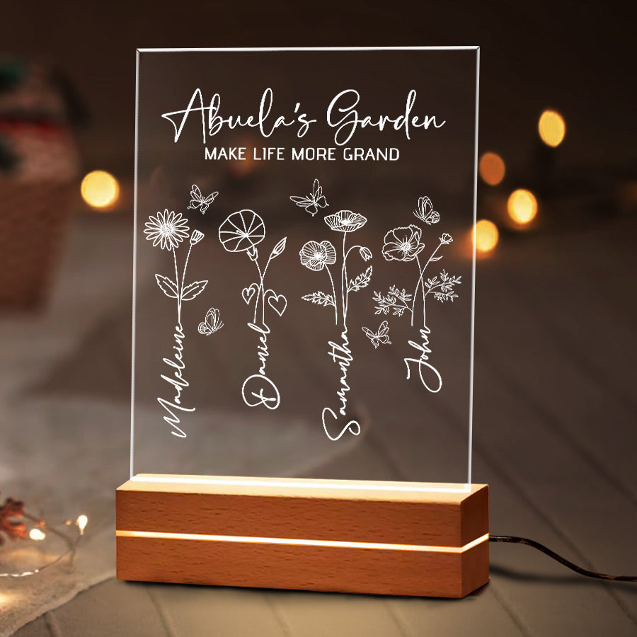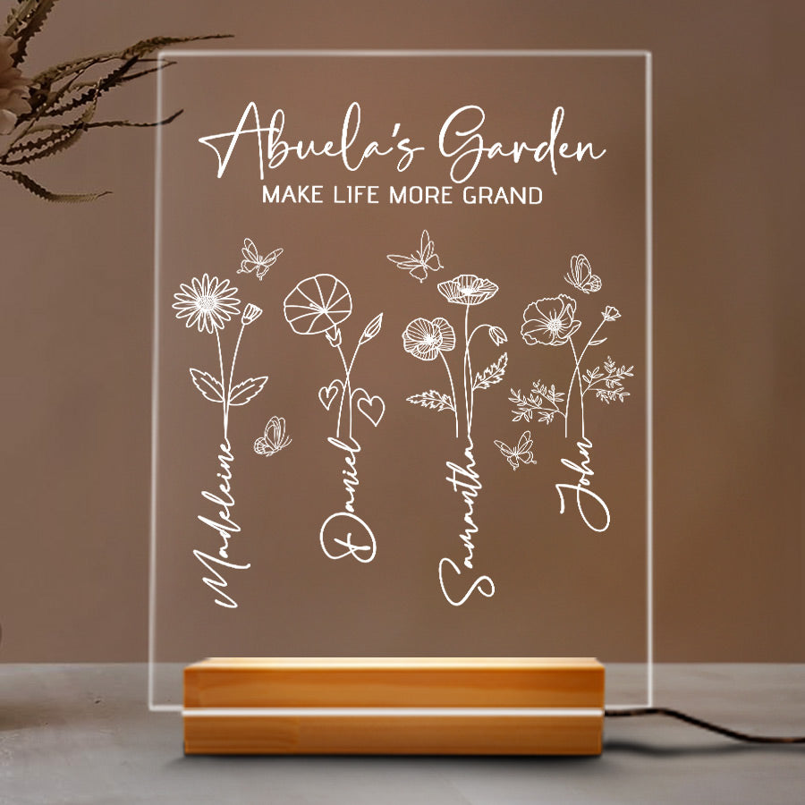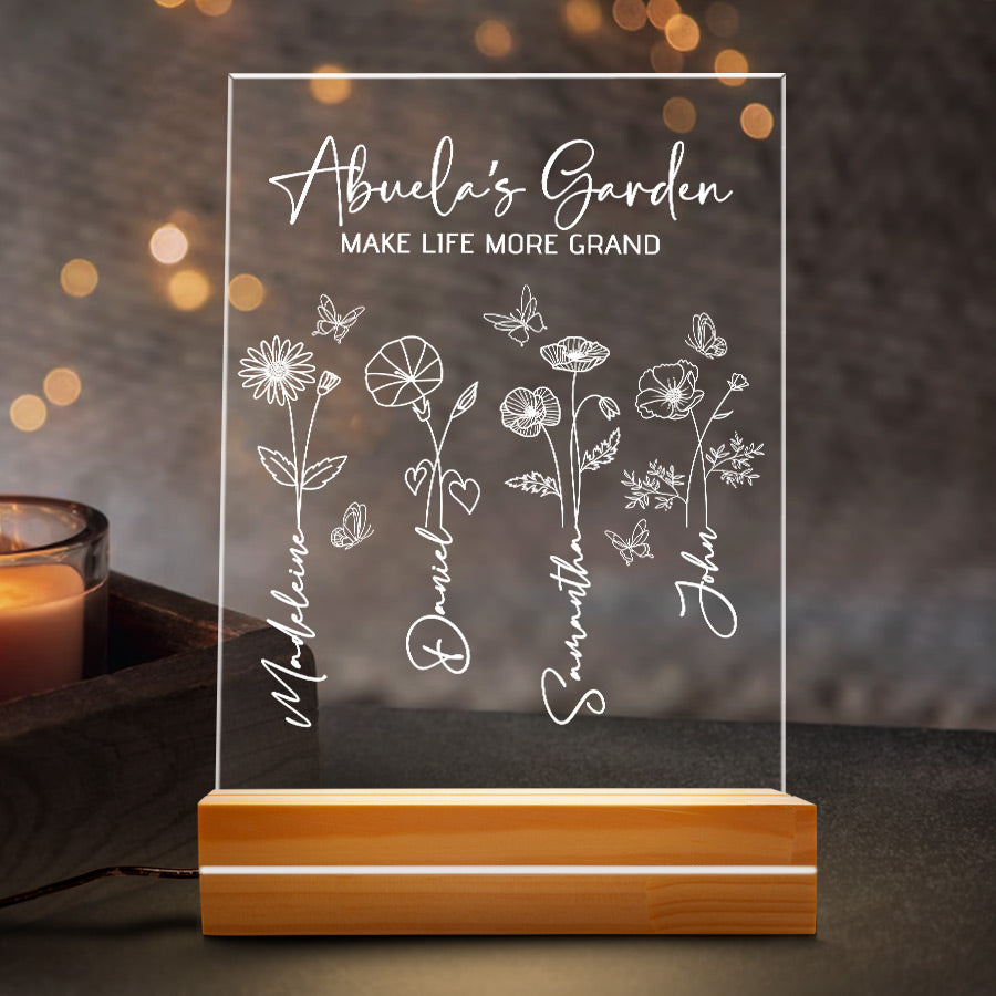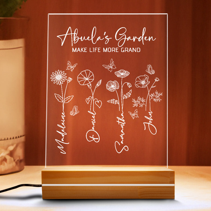 Welcome thoughtful garden art into Grandma's garden with our acrylic plaque. The beautiful custom gift for grandma | mothers day personalised gifts for grandma are laser engraved with your child's name and birth month, alongside a detailed illustration of their representative birth month flower. This extraordinary grandma garden gift is more than just a piece of art; it's a heartfelt tribute to the incredible woman who has made a lasting impact on your life.