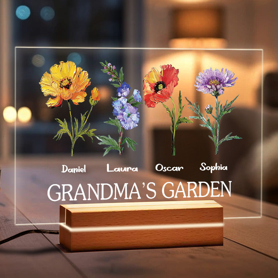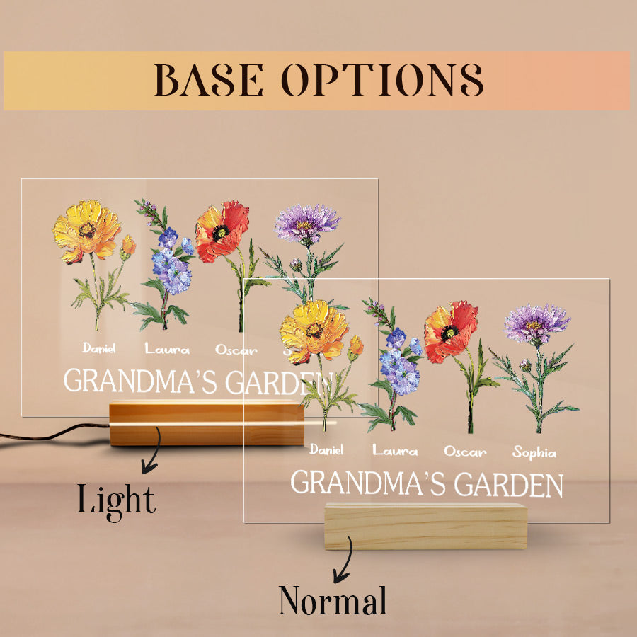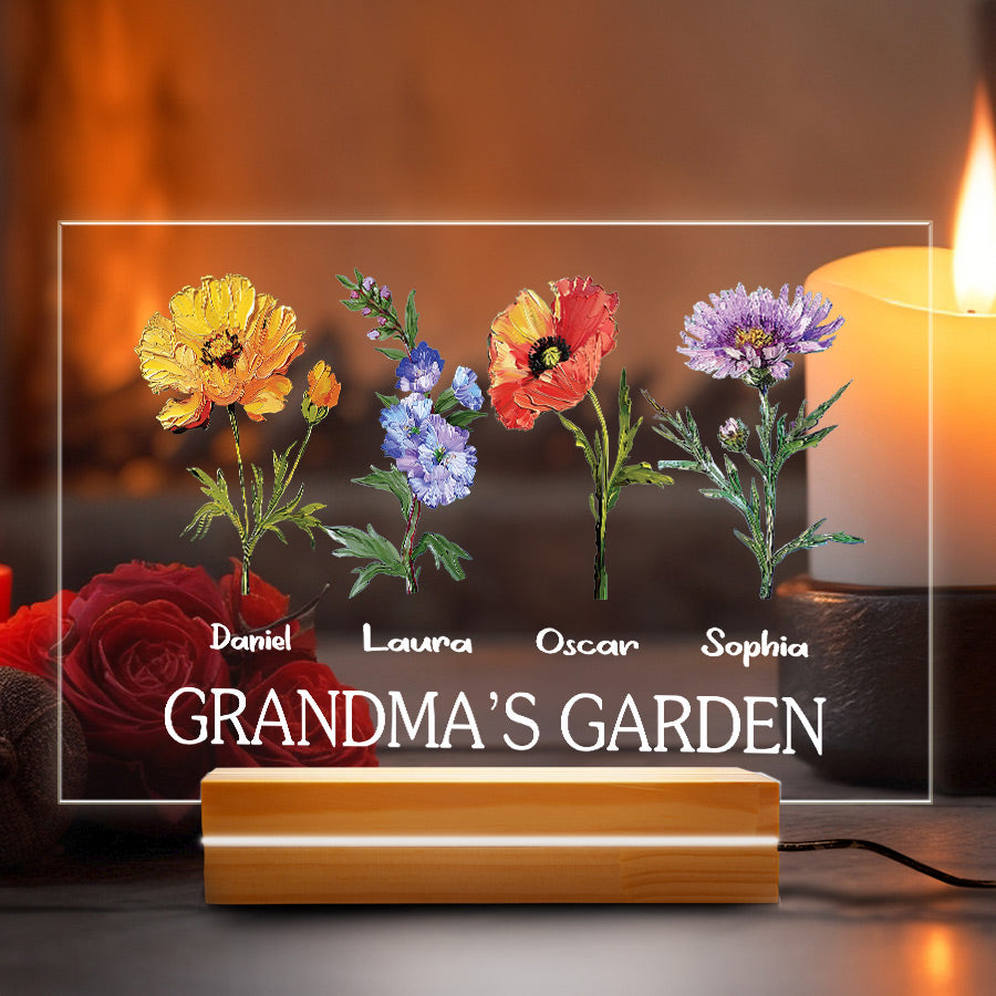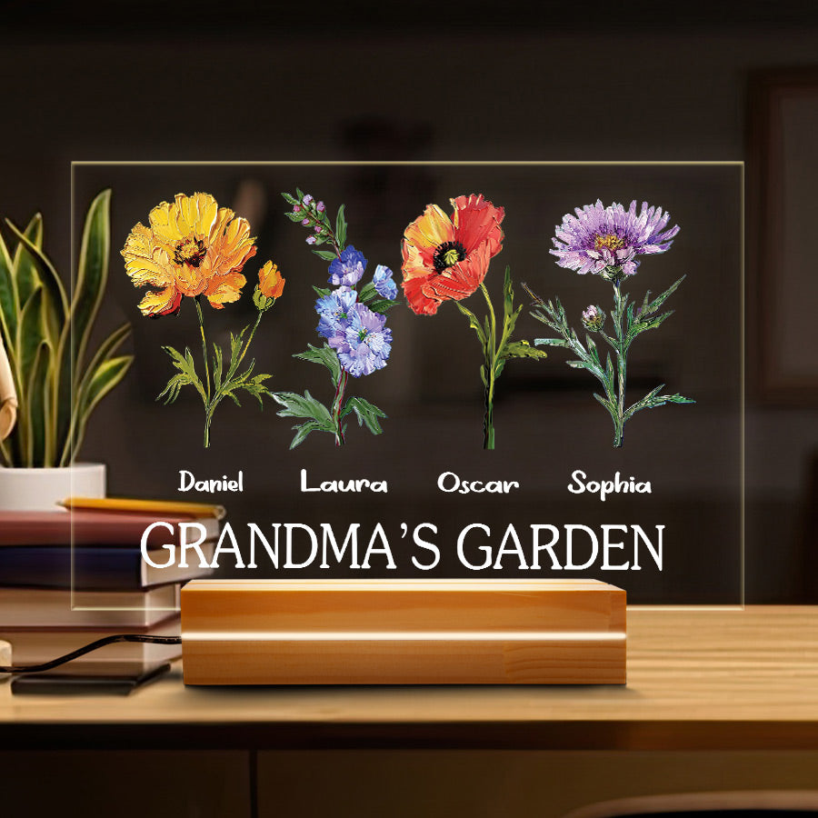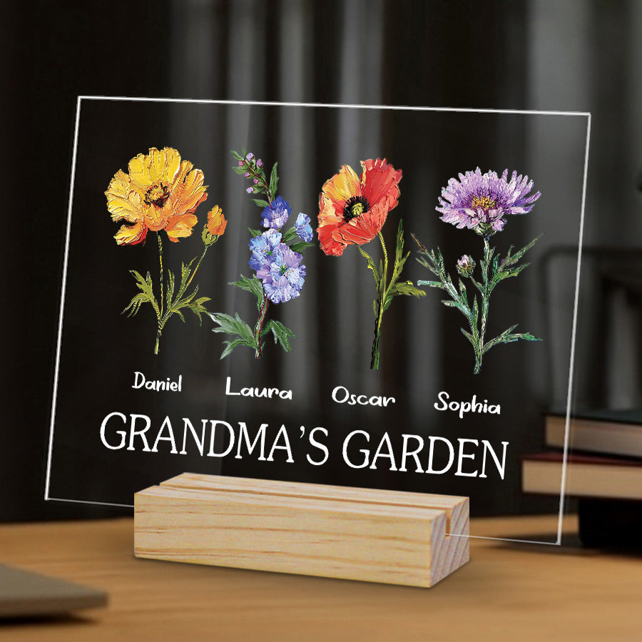 Welcome thoughtful garden art into Grandma's garden with our acrylic plaque. The beautiful custom grandma gifts | best custom mothers day gifts are laser engraved with your child's name and birth month, alongside a detailed illustration of their representative birth month flower. This extraordinary grandma garden gift is more than just a piece of art; it's a heartfelt tribute to the incredible woman who has made a lasting impact on your life.