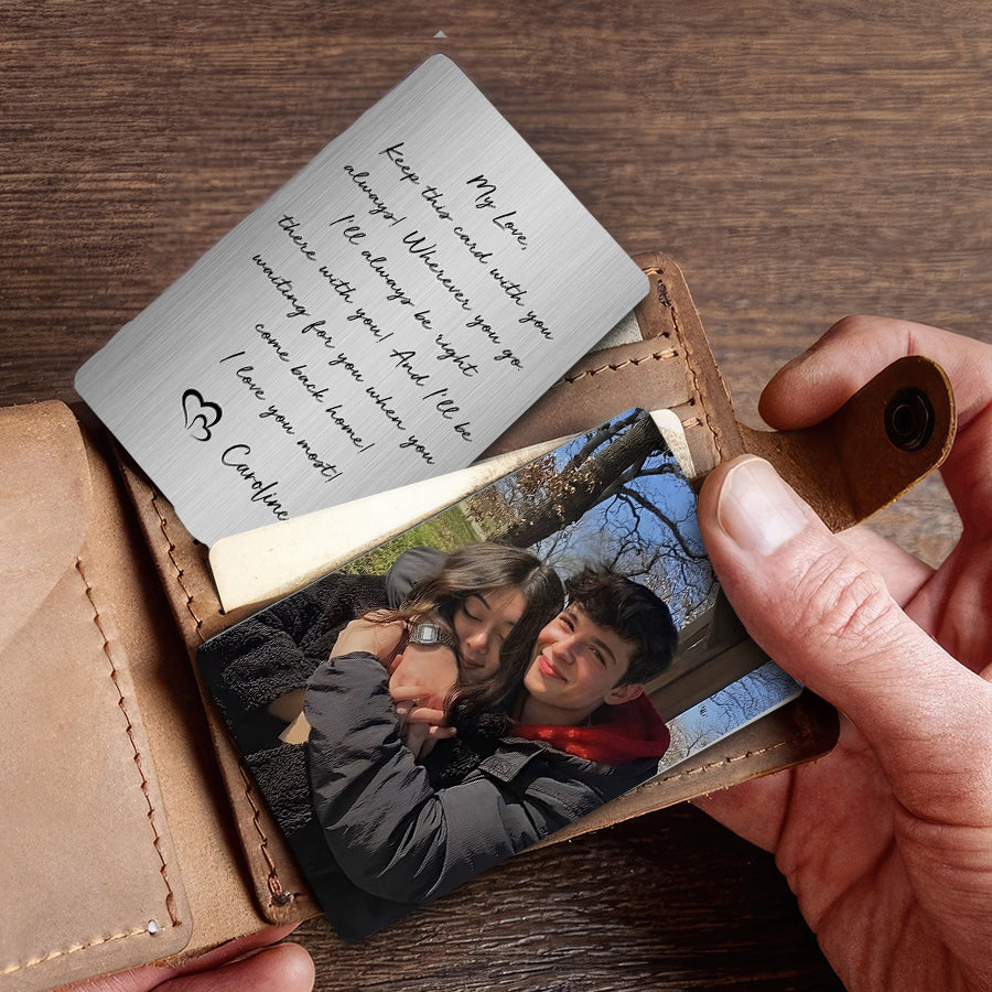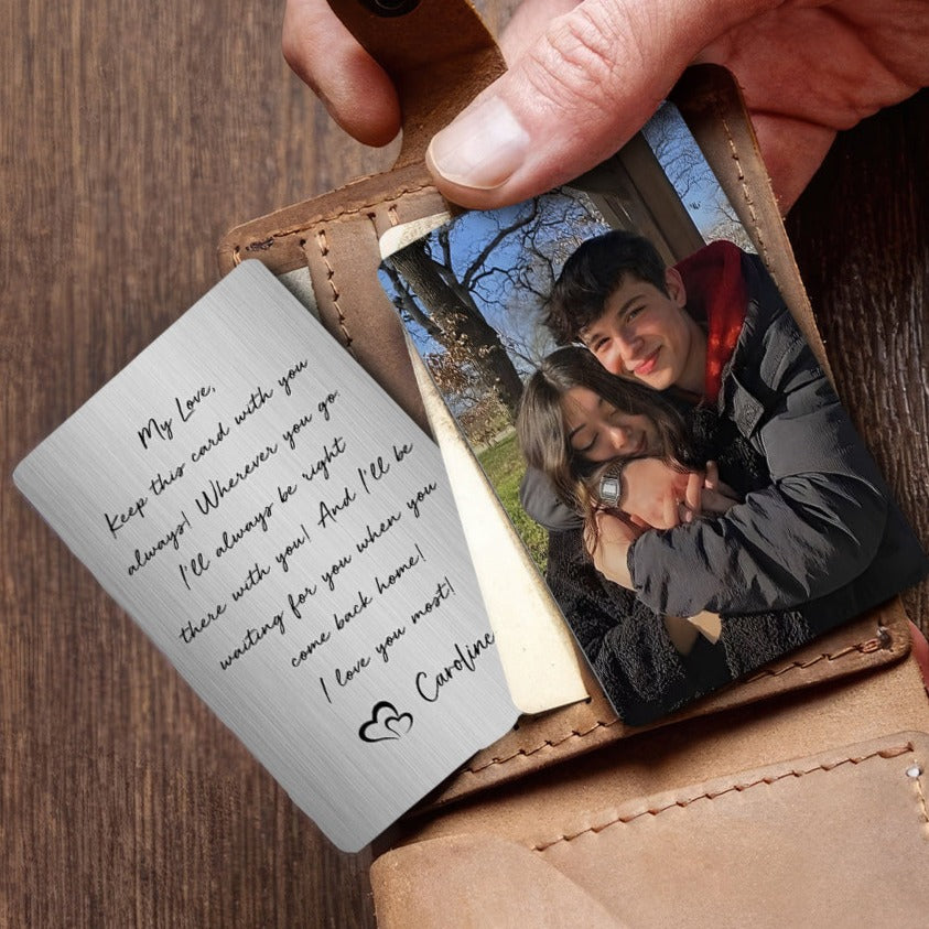 Imagine the look of surprise and delight on his face when he discovers this hidden treasure in his wallet. As he reads the heartfelt message engraved on the card, he will be reminded of the love you share and the moments you've cherished together. It is a personal and intimate gift that speaks directly to his heart.