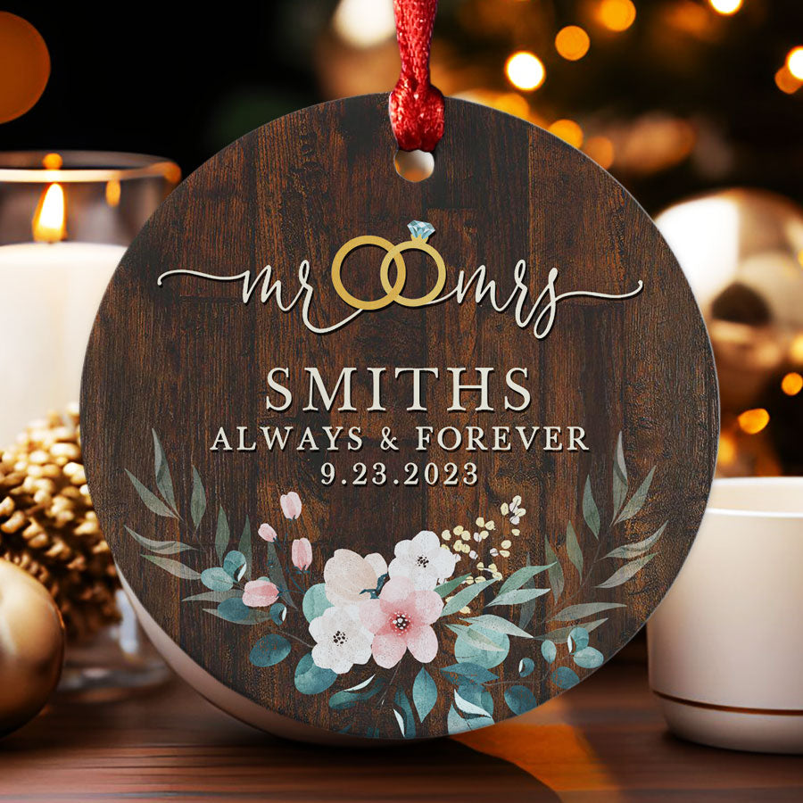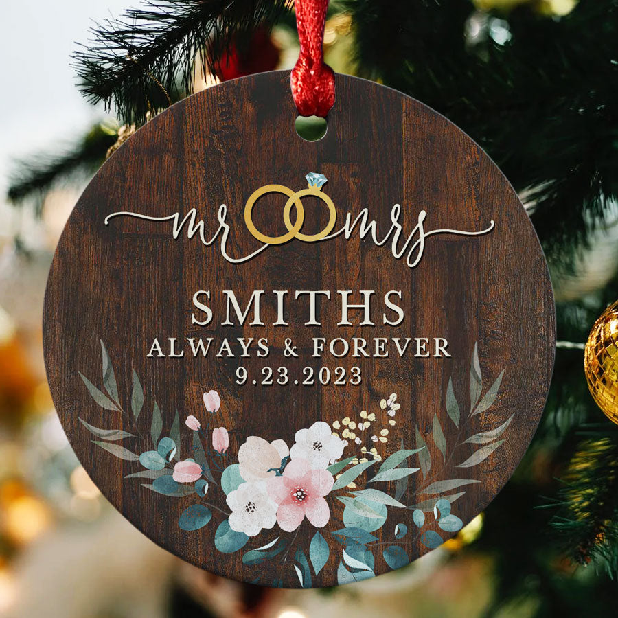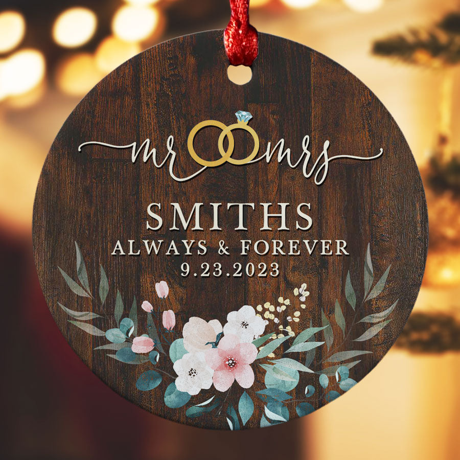 Celebrate your love and special day with custom wedding ornaments | mr & mrs ornament for your tree. The wedding gift Christmas ornaments display your names, wedding date, or a short message to immortalize your marriage for the holidays to come. Hanging proudly year after year, these Personalized Christmas Ornaments will become a treasured tradition reminding you of your commitment to one another.