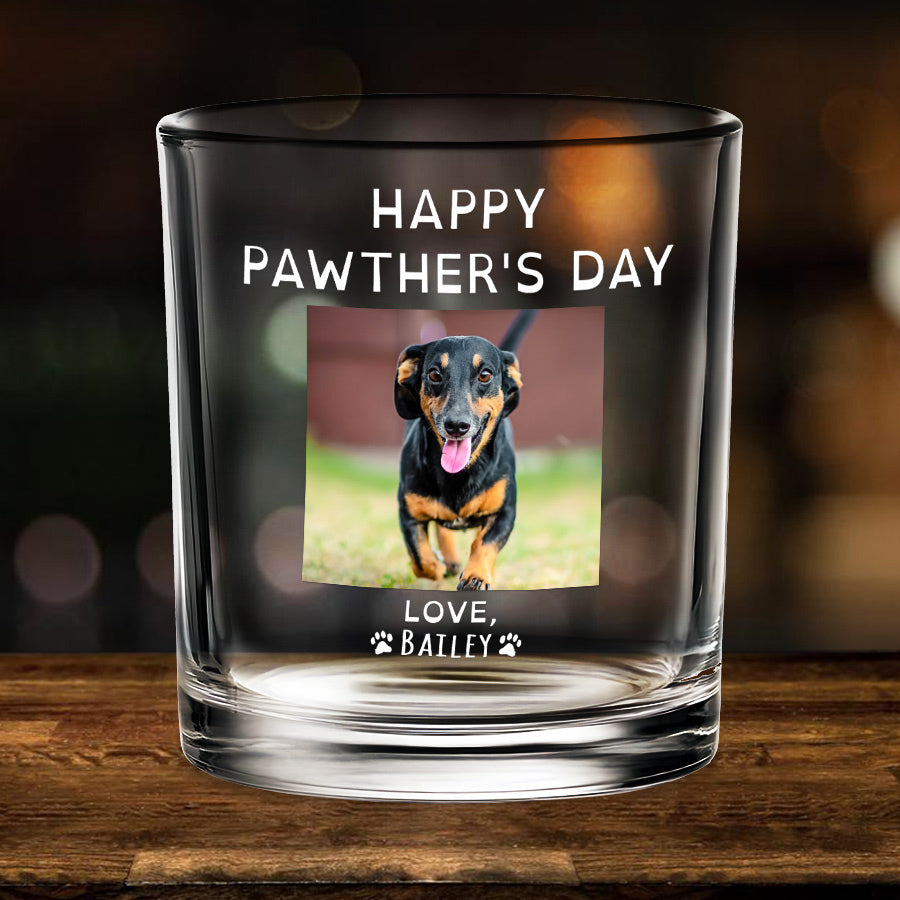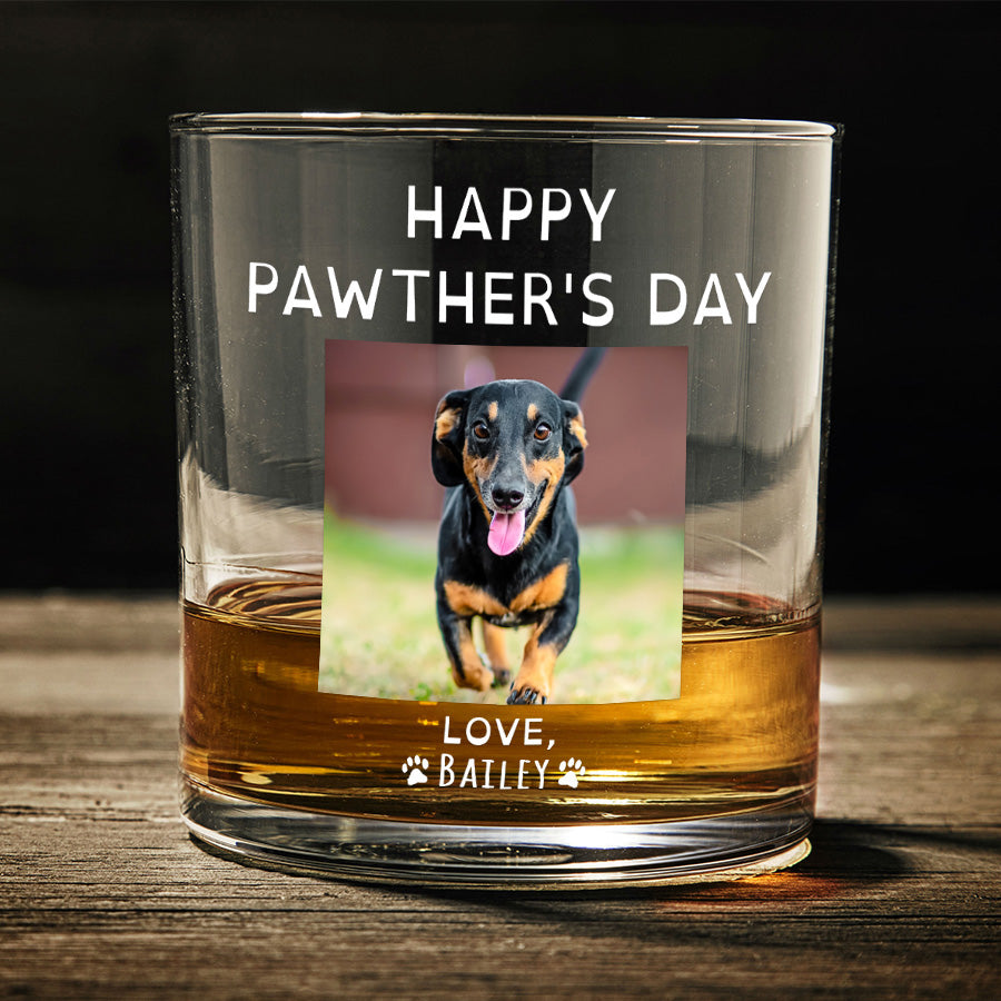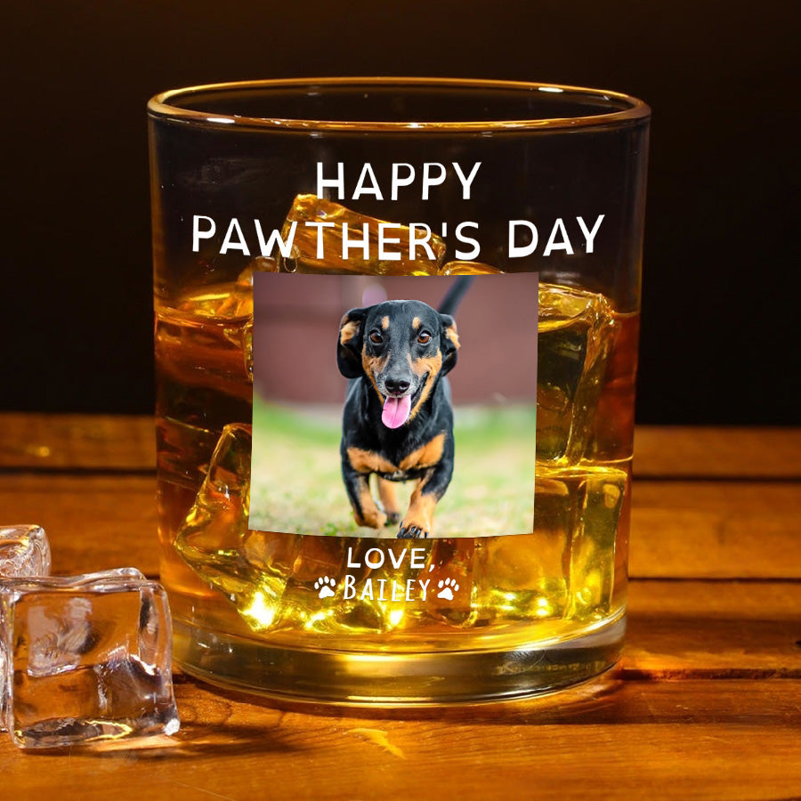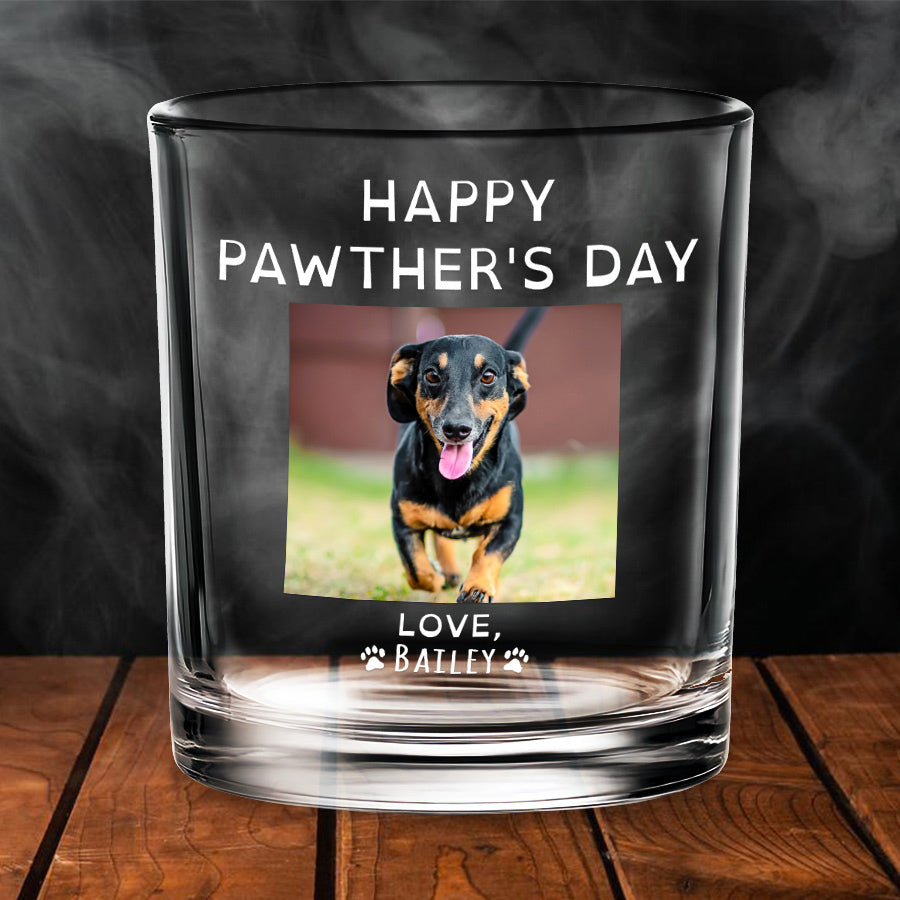 Fathers will smile when they see their face looking back at them from this one-of-a kind whiskey glass, surrounded by paw prints and images of their loyal dog companions.