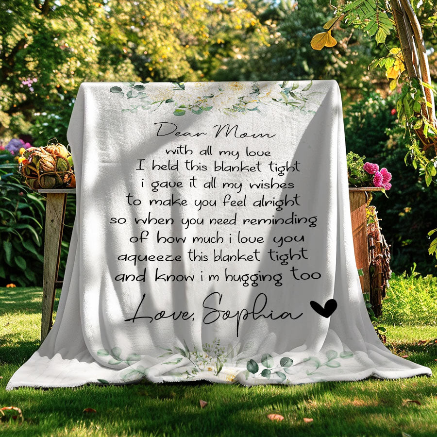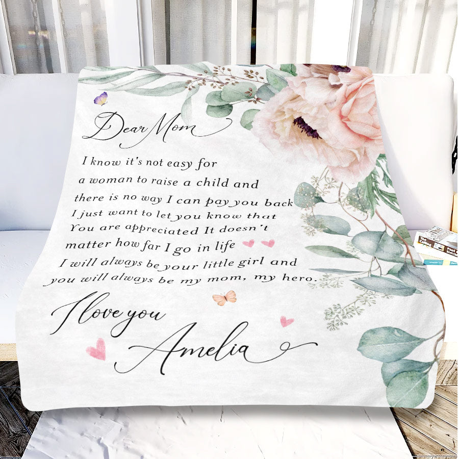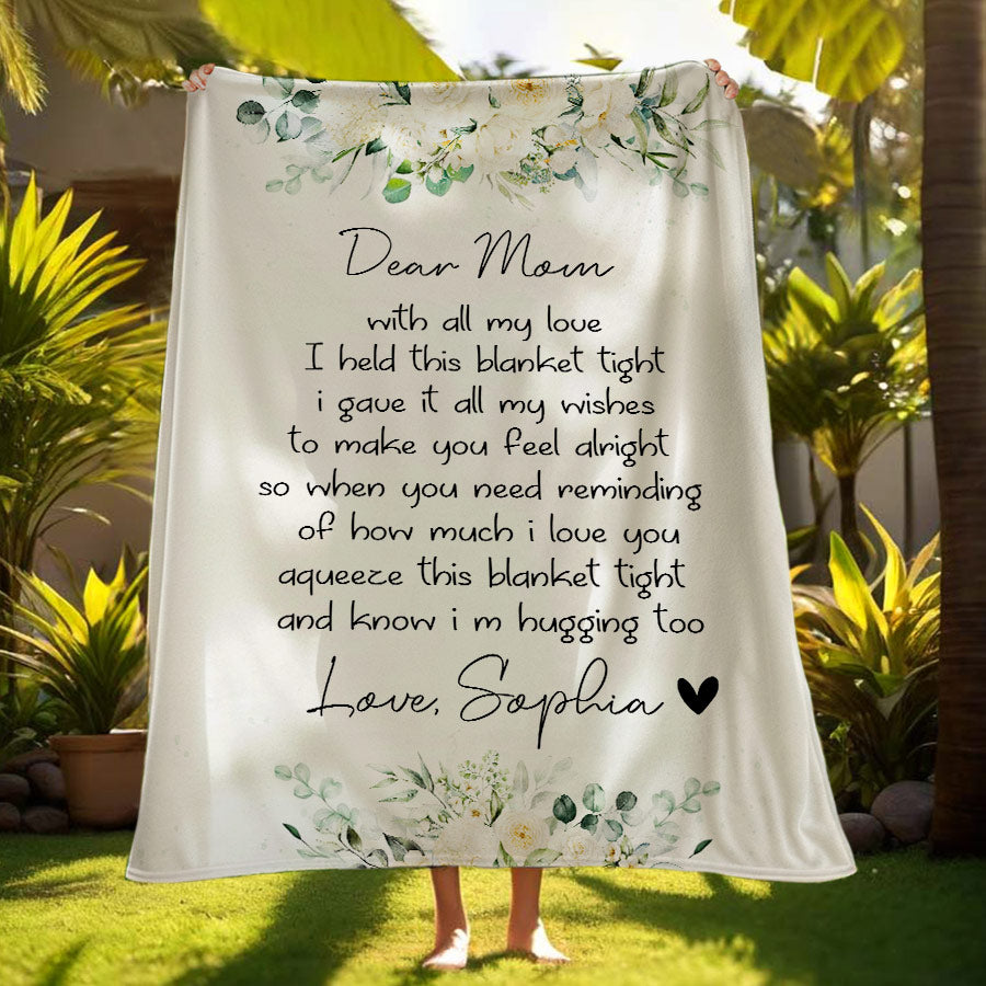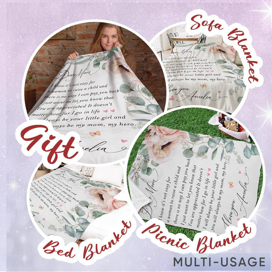 More than dear mom blanket | custom mothers day presents for chilly evenings, this customized blanket offers mom moments of joy throughout her day. Whether resting between errands or soothing her with after-dinner relaxation, your special blanket acts as a hug whenever she needs it most. Its timeless fleece design also makes it a cozy companion for many Mother's Days to come.