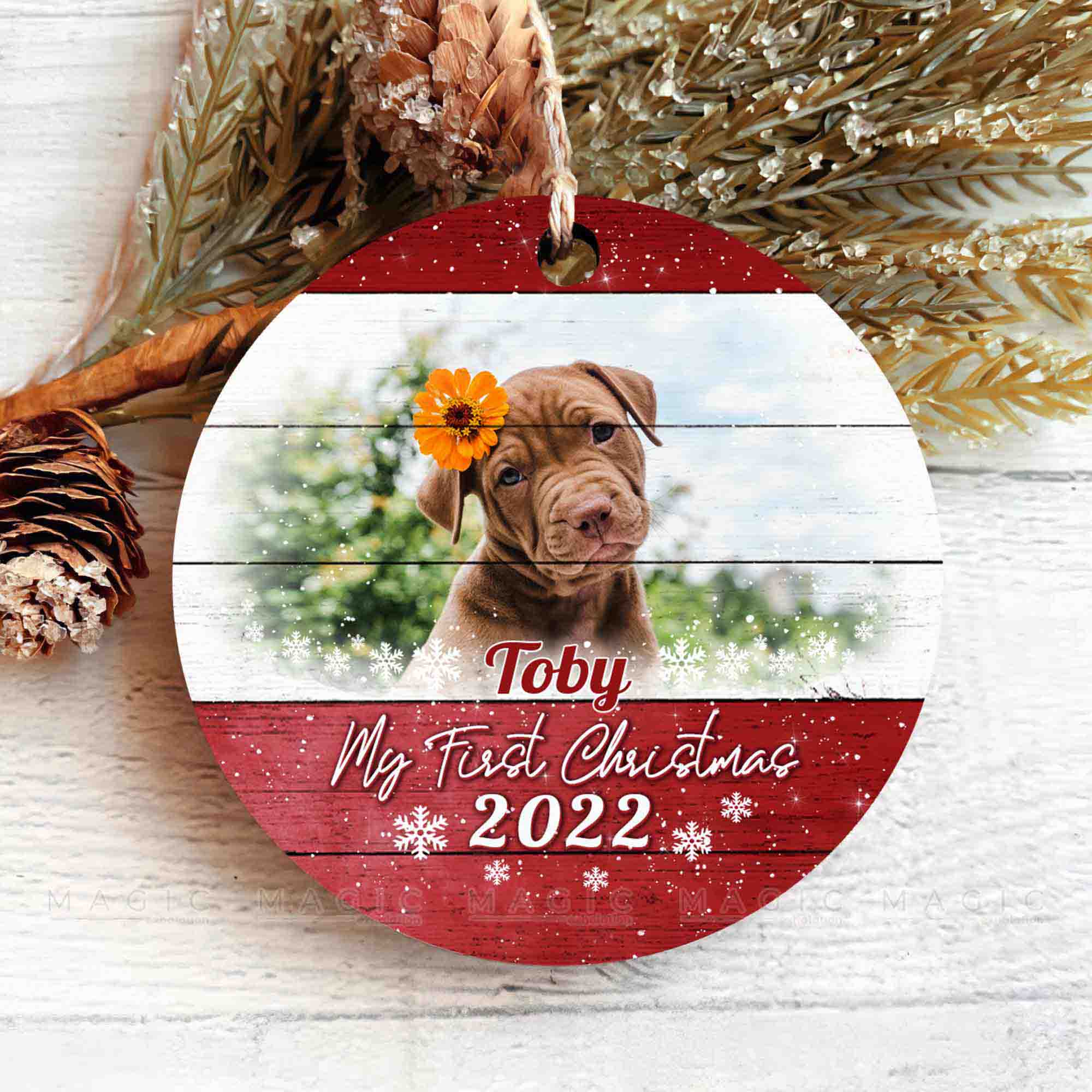 Dogs First Christmas Ornament | Magic Exhalation is one of the perfect Personalized Christmas Ornaments to commemorate your furry friend. Custom Pet Ornaments make the perfect celebration of the little joys your pet brings to your life.