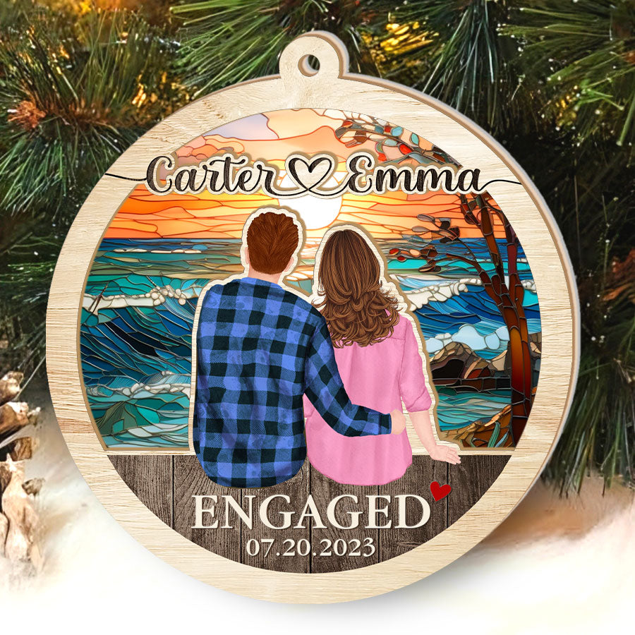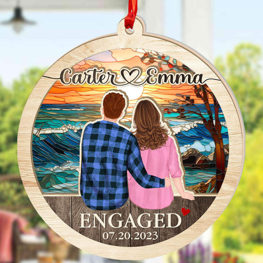 The engaged ornaments | customized wooden engagement ornament add a feeling of warmth, joy, and magic to any window. As the sun streams through during the day, a kaleidoscope of colors is cast all around. Reds, oranges, yellows, and more will dance on your walls and brighten up even the dreariest of days.