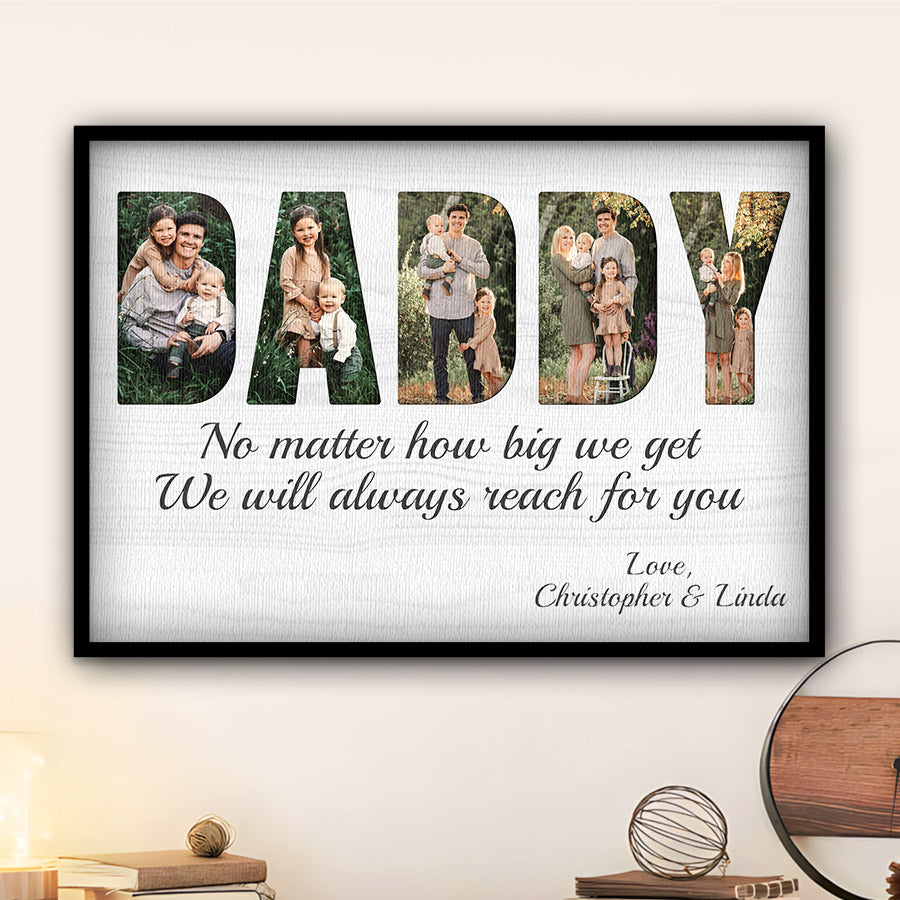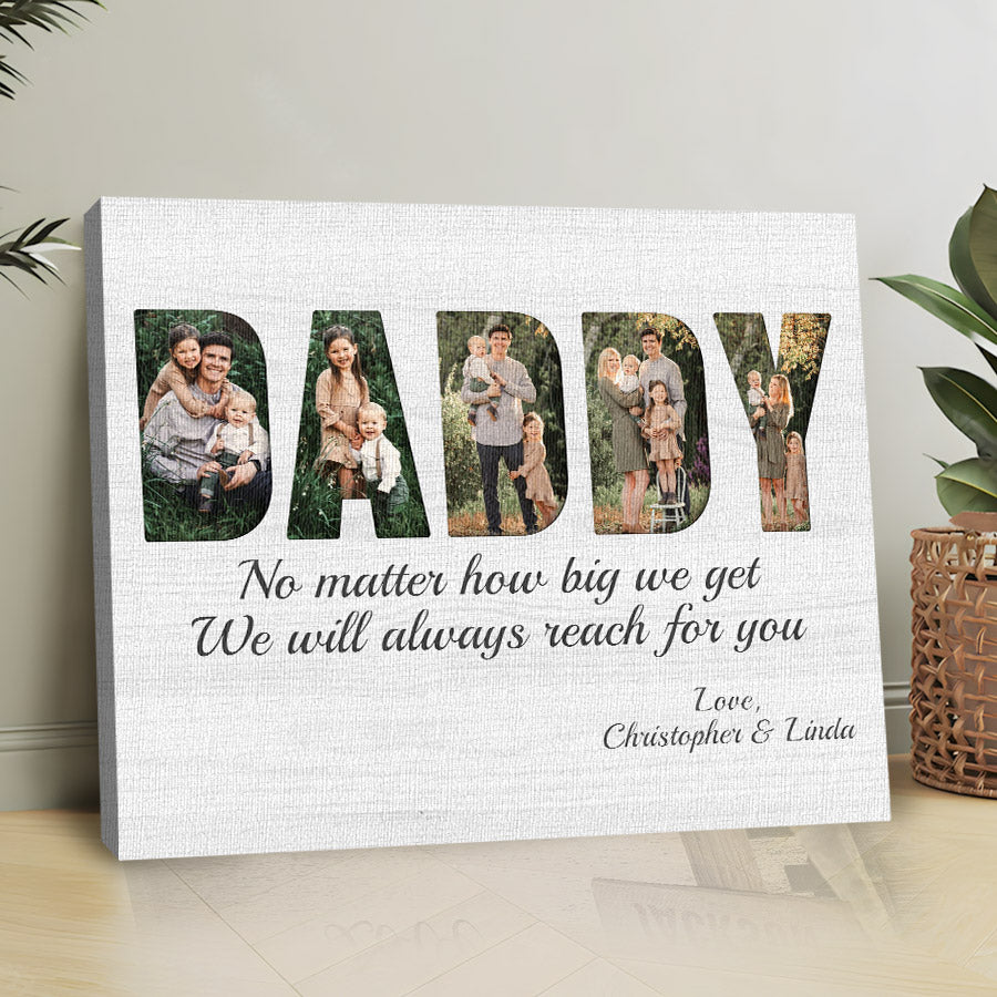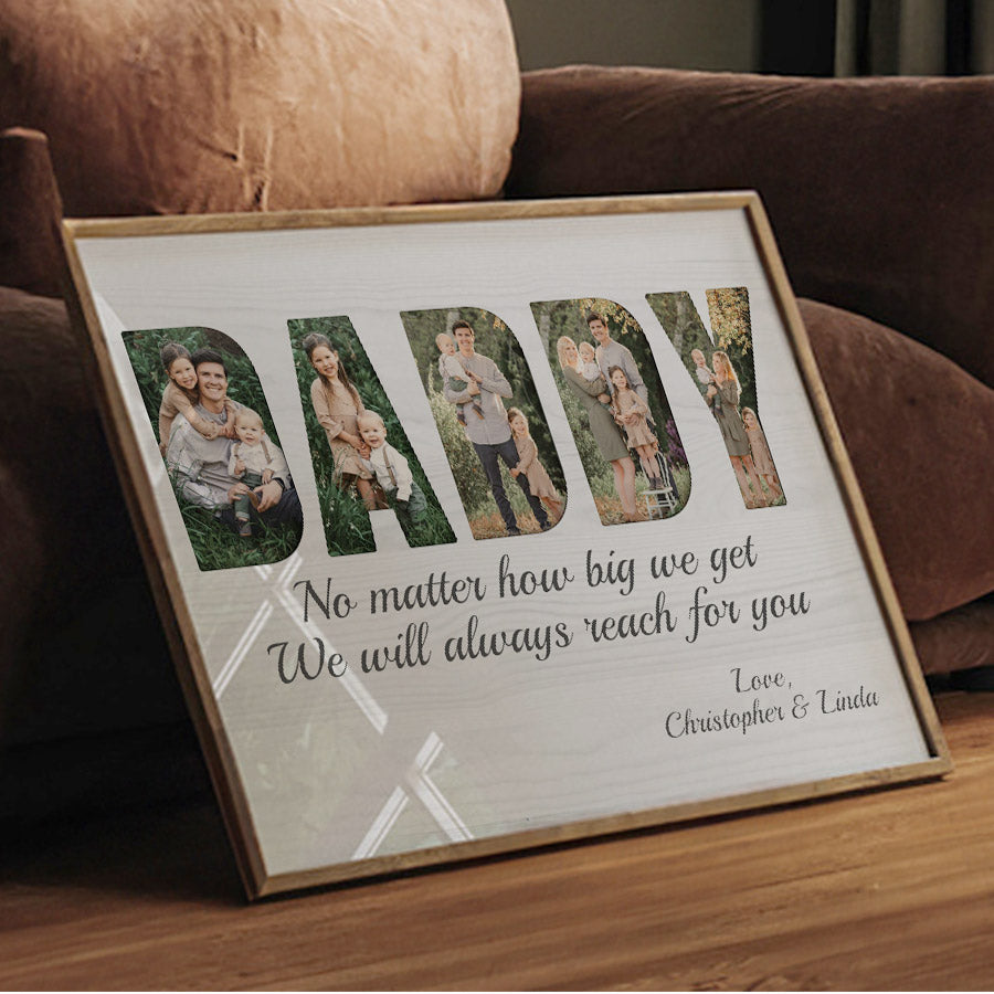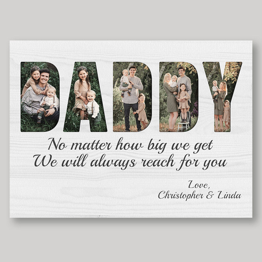 The crisp resolution of this father’s day gift custom | personalized fathers day gift allows you to select photos with fine details that will be preserved for years to come. But more than just pictures, this gift conveys the deep love, gratitude and respect you feel for everything Dad has done for you. On Father's Day, a day set aside to honor fatherhood and all the hard work dads do every day, this personalized canvas is a thoughtful way to let him know how much you value him and celebrate all he has provided throughout the years.