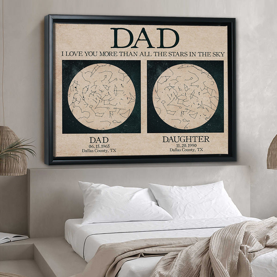 The crisp resolution of this custom father daughter gift | father and daughter star map allows you to select photos with fine details that will be preserved for years to come. But more than just pictures, this gift conveys the deep love, gratitude and respect you feel for everything Dad has done for you. On Father's Day, a day set aside to honor fatherhood and all the hard work dads do every day, this personalized canvas is a thoughtful way to let him know how much you value him and celebrate all he has provided throughout the years.