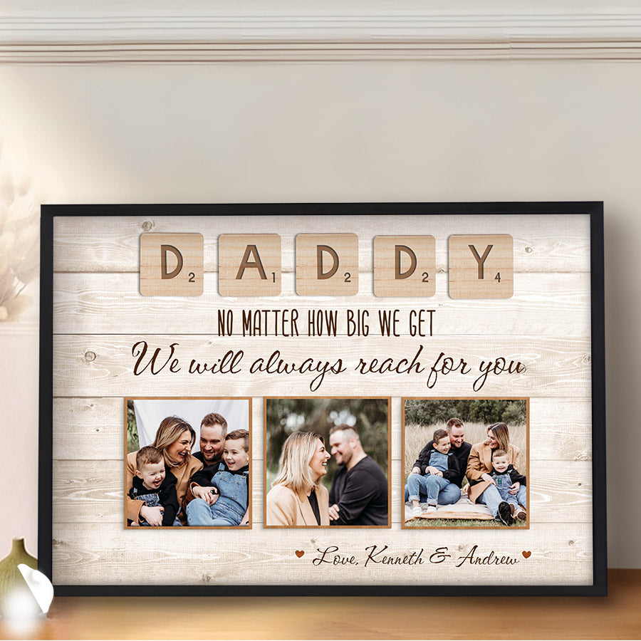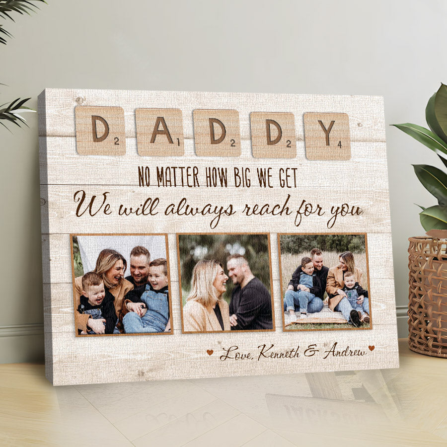 Treat the new dad in your life to Fathers Day Gift that commemorates the baby's arrival and his first Father's Day. Our personalized photo canvas is sure to bring a smile seeing little ones grow up before their eyes. Customize it FREE now - he will love displaying this treasured memory for many years to come.