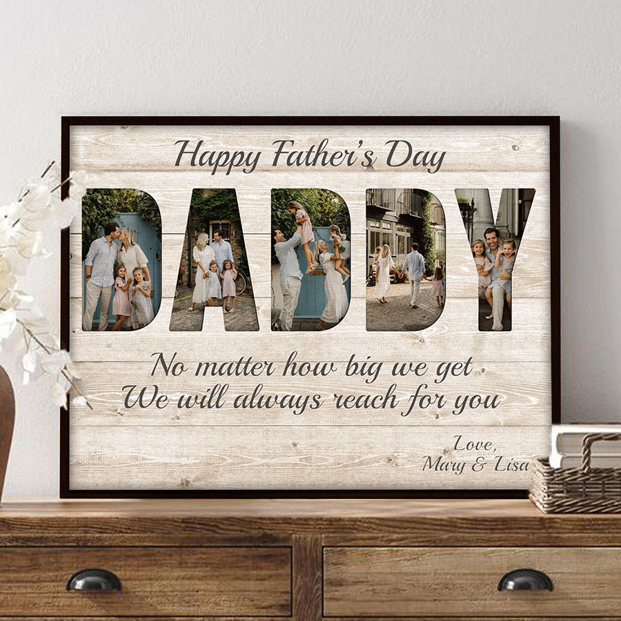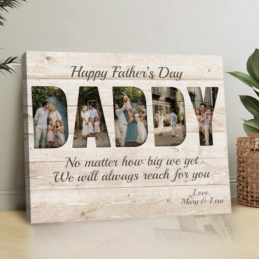What better way to show your appreciation for Dad than a fathers day gift | father’s day gift custom | father's day canvas that captures memories you've created together over the years? This high-quality gift comes ready to be customized with photos that will bring a smile to his face each time he looks at it. From childhood pictures to recent family vacations, you can select images that remind him of how much he means to you and your family.