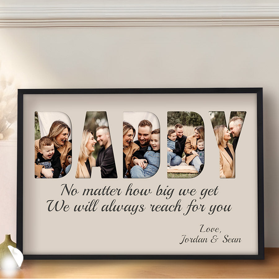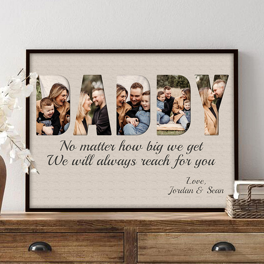 What better way to show your appreciation for Dad than a fathers day gift | fathers day gift for dad | personalized canvas for dad that captures memories you've created together over the years? This high-quality gift comes ready to be customized with photos that will bring a smile to his face each time he looks at it. From childhood pictures to recent family vacations, you can select images that remind him of how much he means to you and your family.
