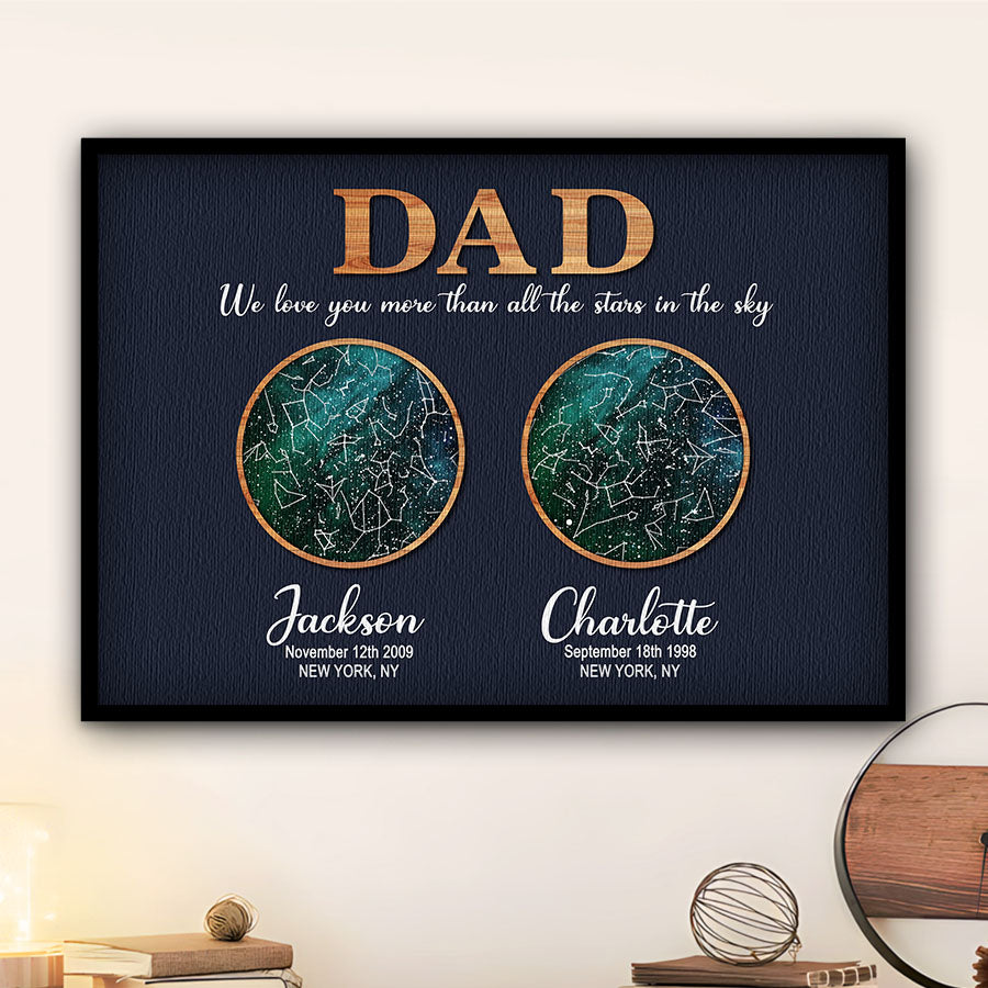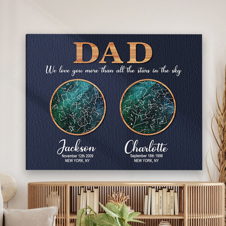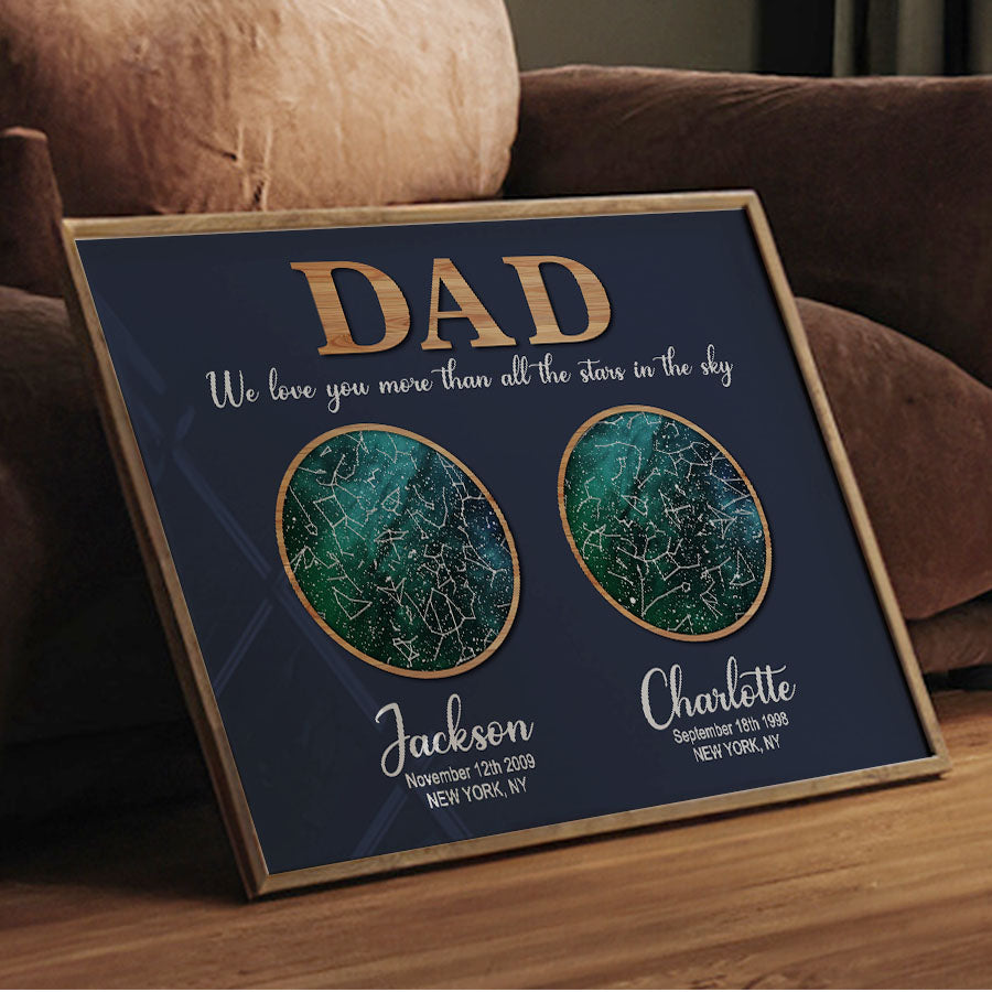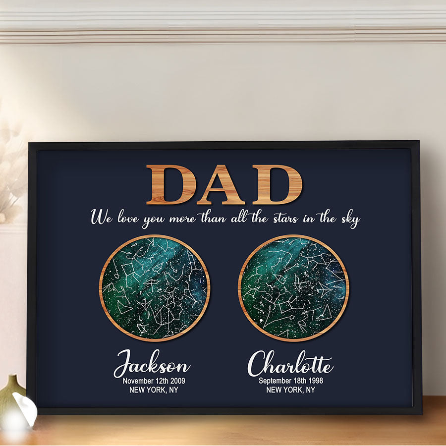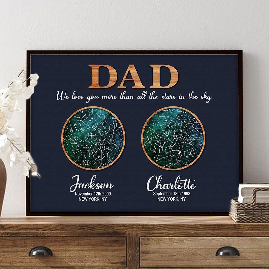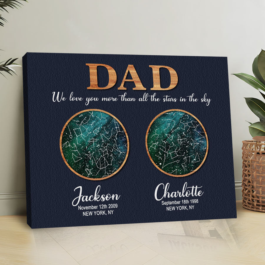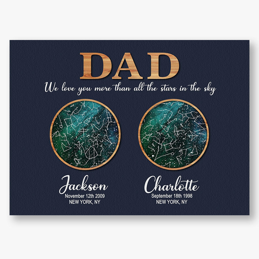 The crisp resolution of this fathers day gift for dad | custom fathers day gift for dad | starmap gift allows you to select photos with fine details that will be preserved for years to come. But more than just pictures, this gift conveys the deep love, gratitude and respect you feel for everything Dad has done for you. On Father's Day, a day set aside to honor fatherhood and all the hard work dads do every day, this personalized canvas is a thoughtful way to let him know how much you value him and celebrate all he has provided throughout the years.