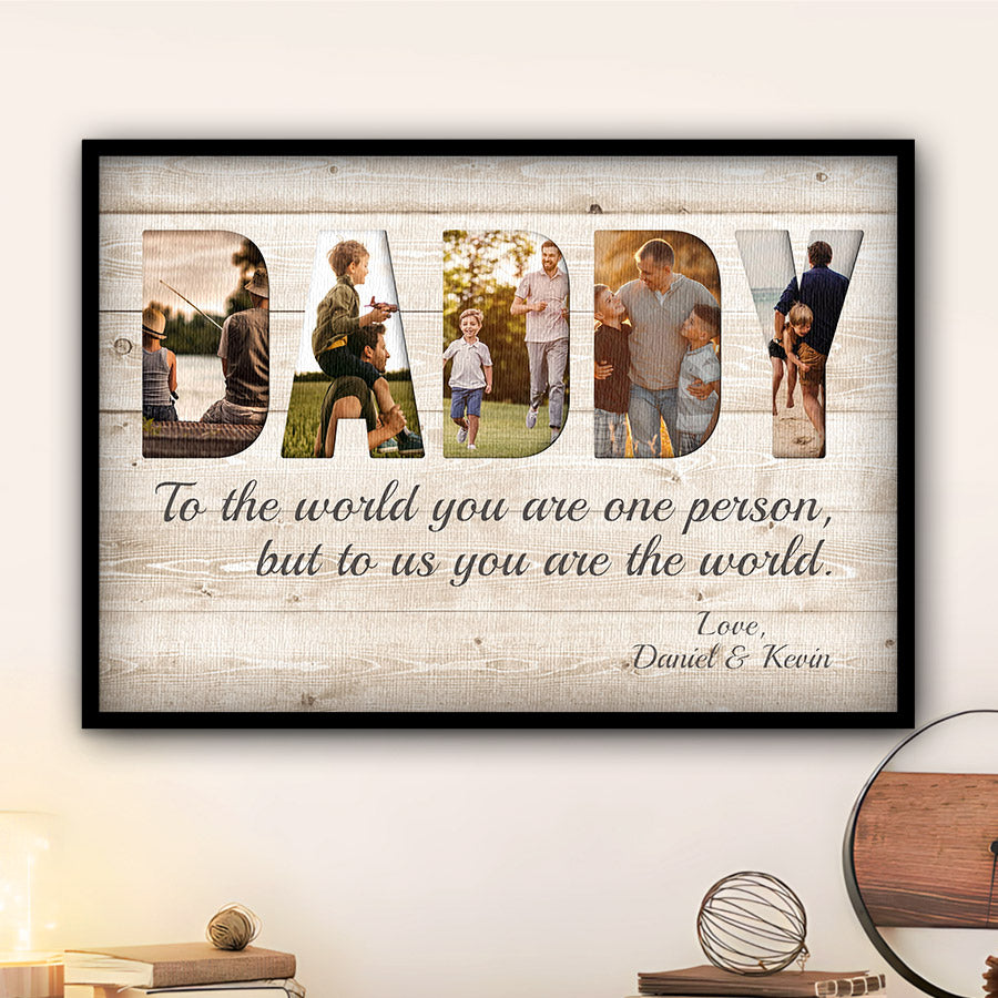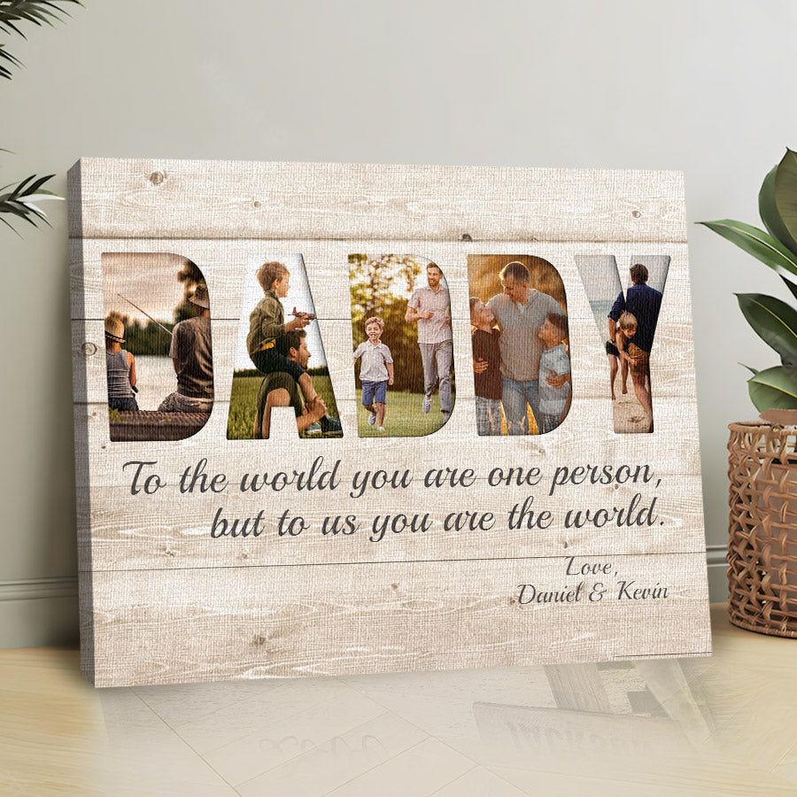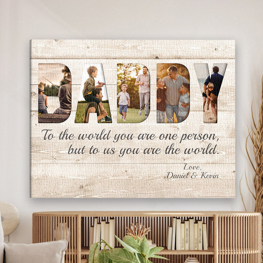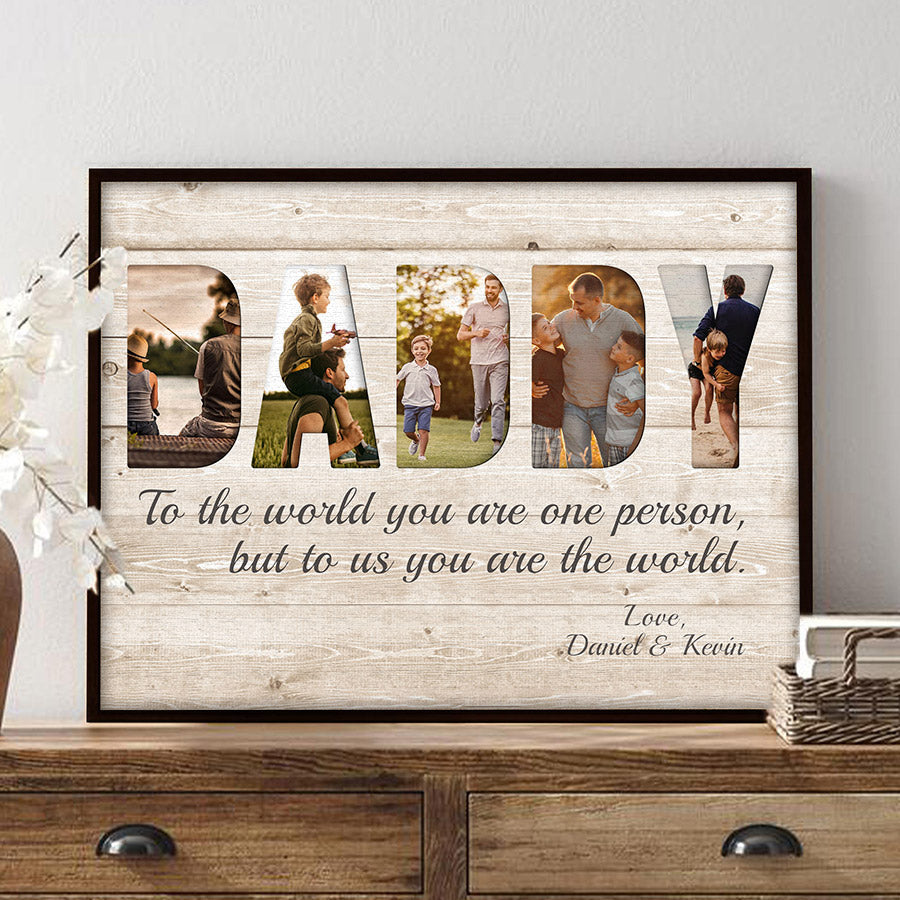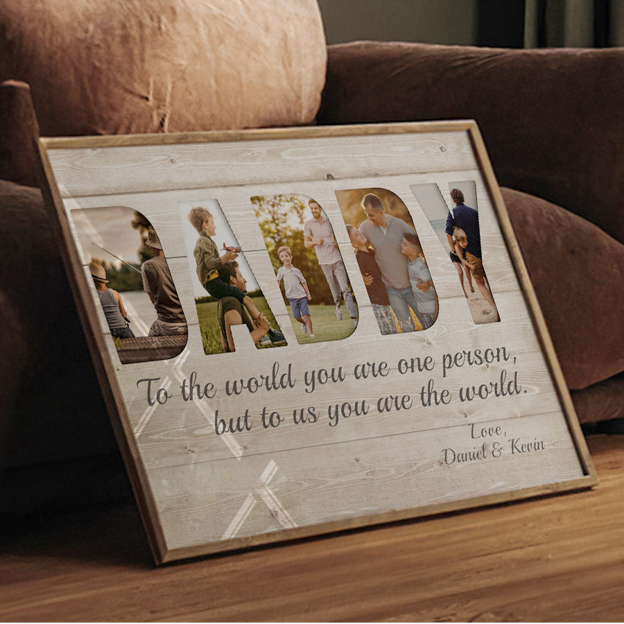 What better way to show your appreciation for Dad than a fathers day gift for dad | father’s day gift custom | fathers day wall art that captures memories you've created together over the years? This high-quality gift comes ready to be customized with photos that will bring a smile to his face each time he looks at it. From childhood pictures to recent family vacations, you can select images that remind him of how much he means to you and your family.