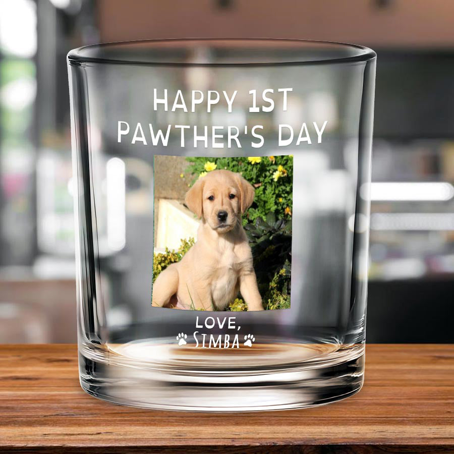 Fathers will smile when they see their face looking back at them from this one-of-a kind whiskey glass, surrounded by paw prints and images of their loyal dog companions.