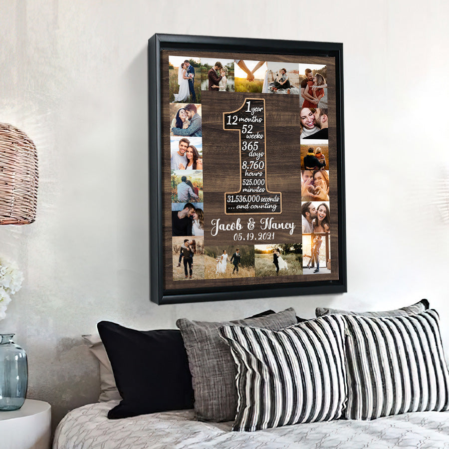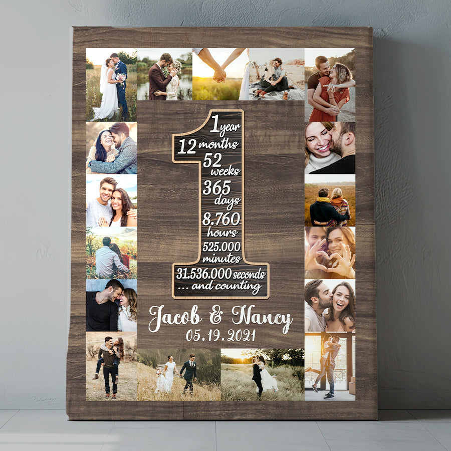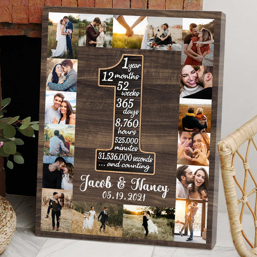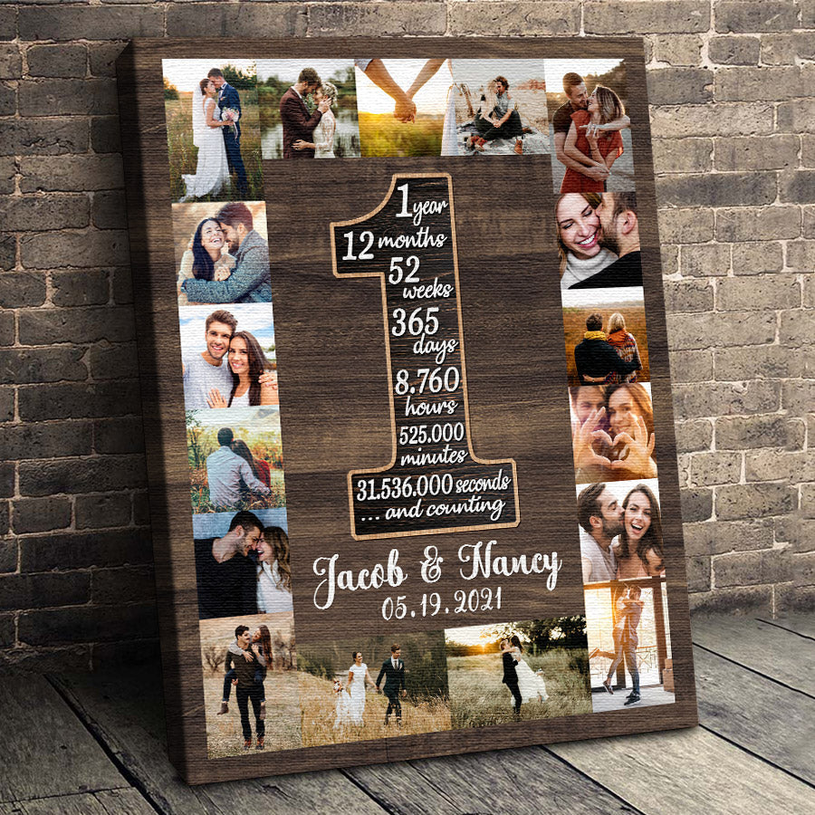 Unlike traditional first anniversary gift | 1 year anniversary gift | 1 year anniversary canvas like jewelry or flowers, a custom canvas lets you celebrate your relationship in a creative way she can enjoy for years. By selecting meaningful photos from your time together, an anniversary canvas becomes a heartfelt artistic representation of the memories you've built.