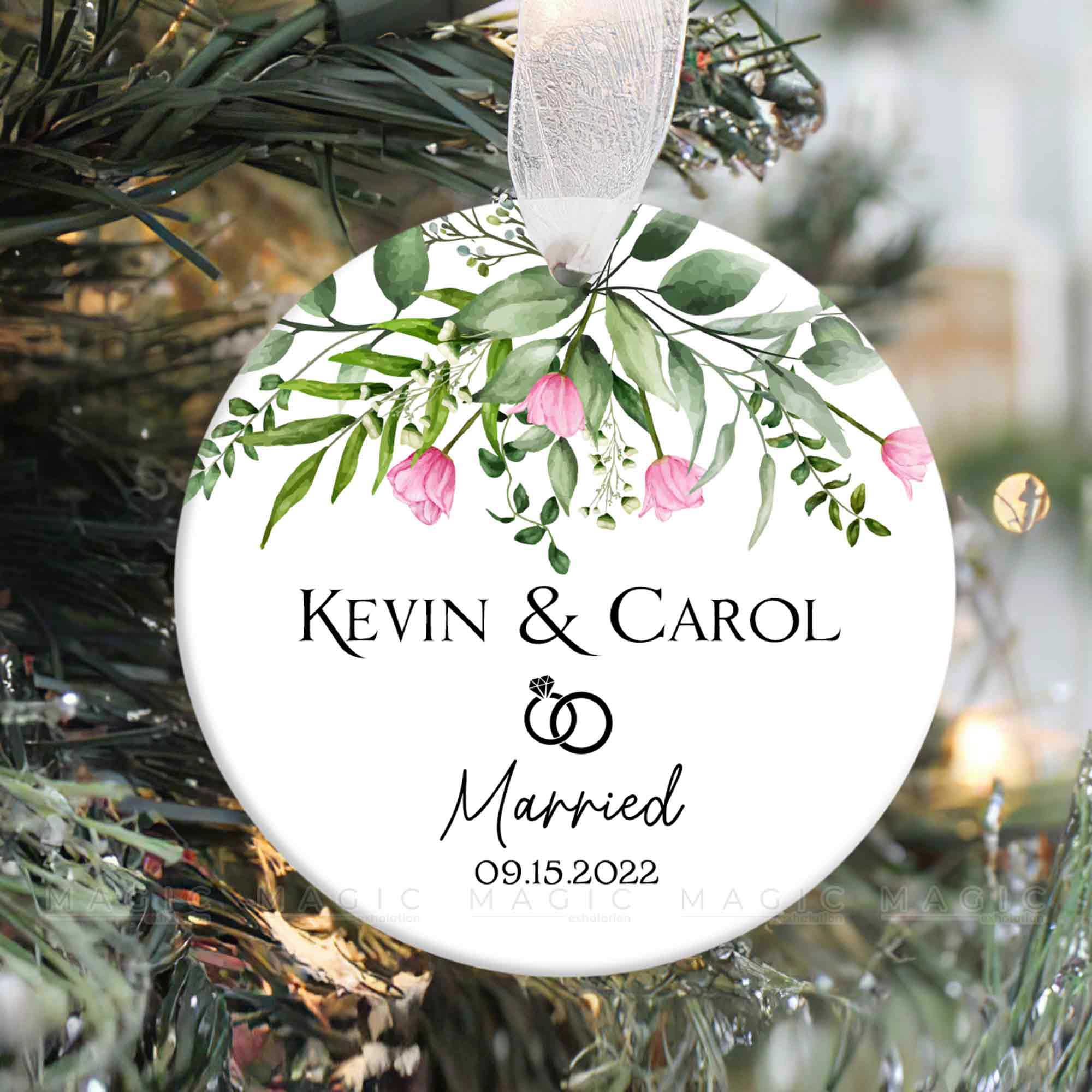 You can find beautiful first christmas married gifts that can be personalized with the couple's name and wedding date. You can even find some with a picture of the bride and groom that is personalized in this design.