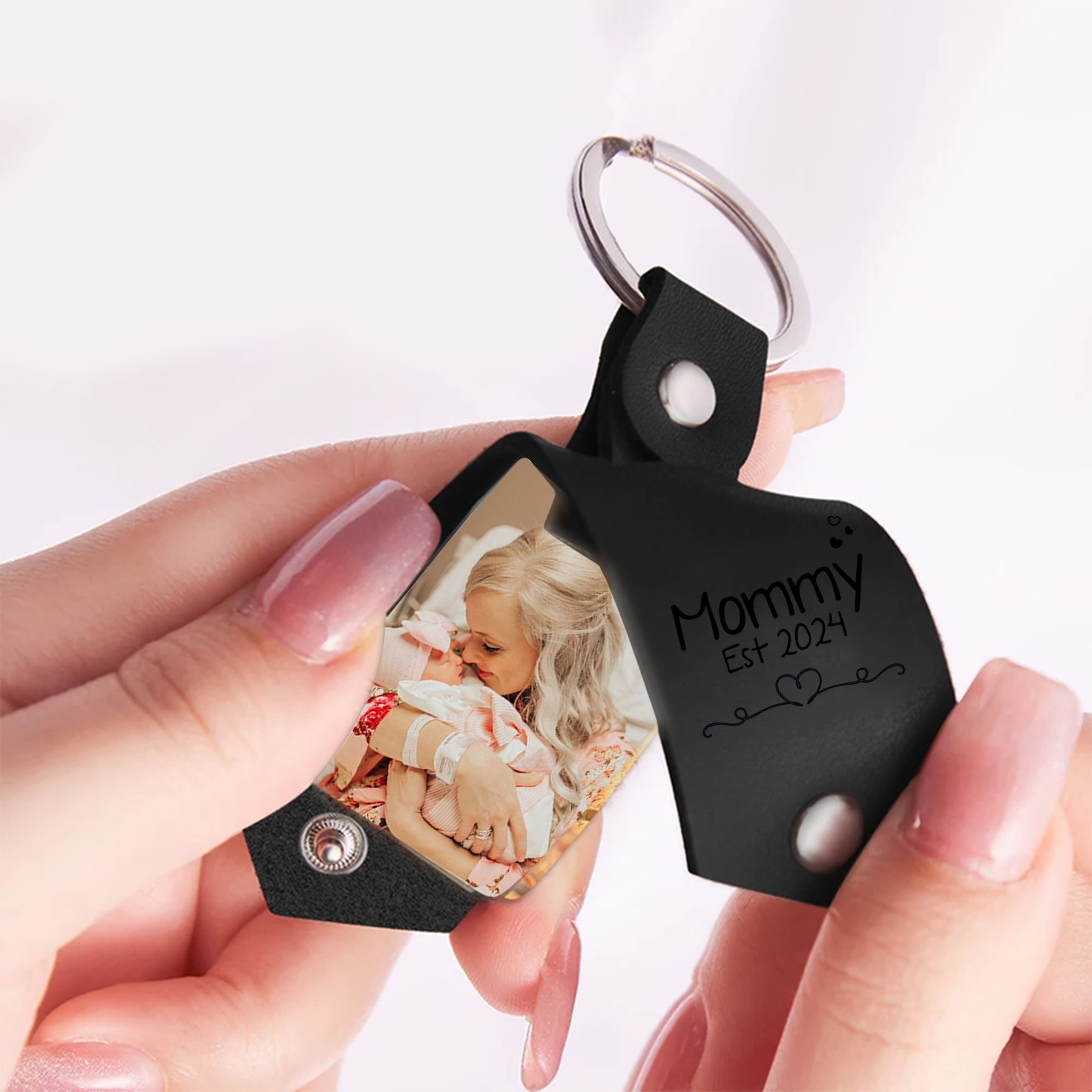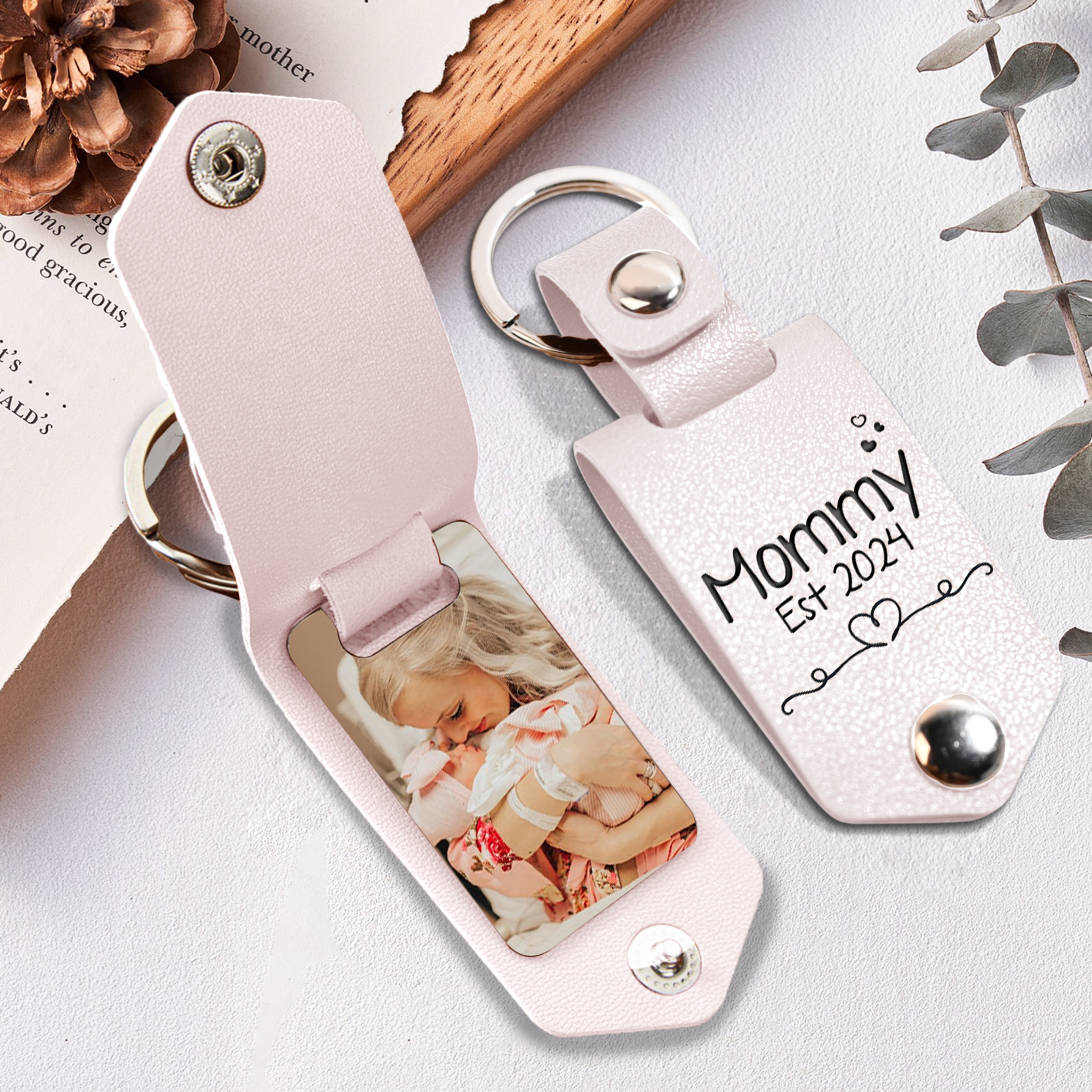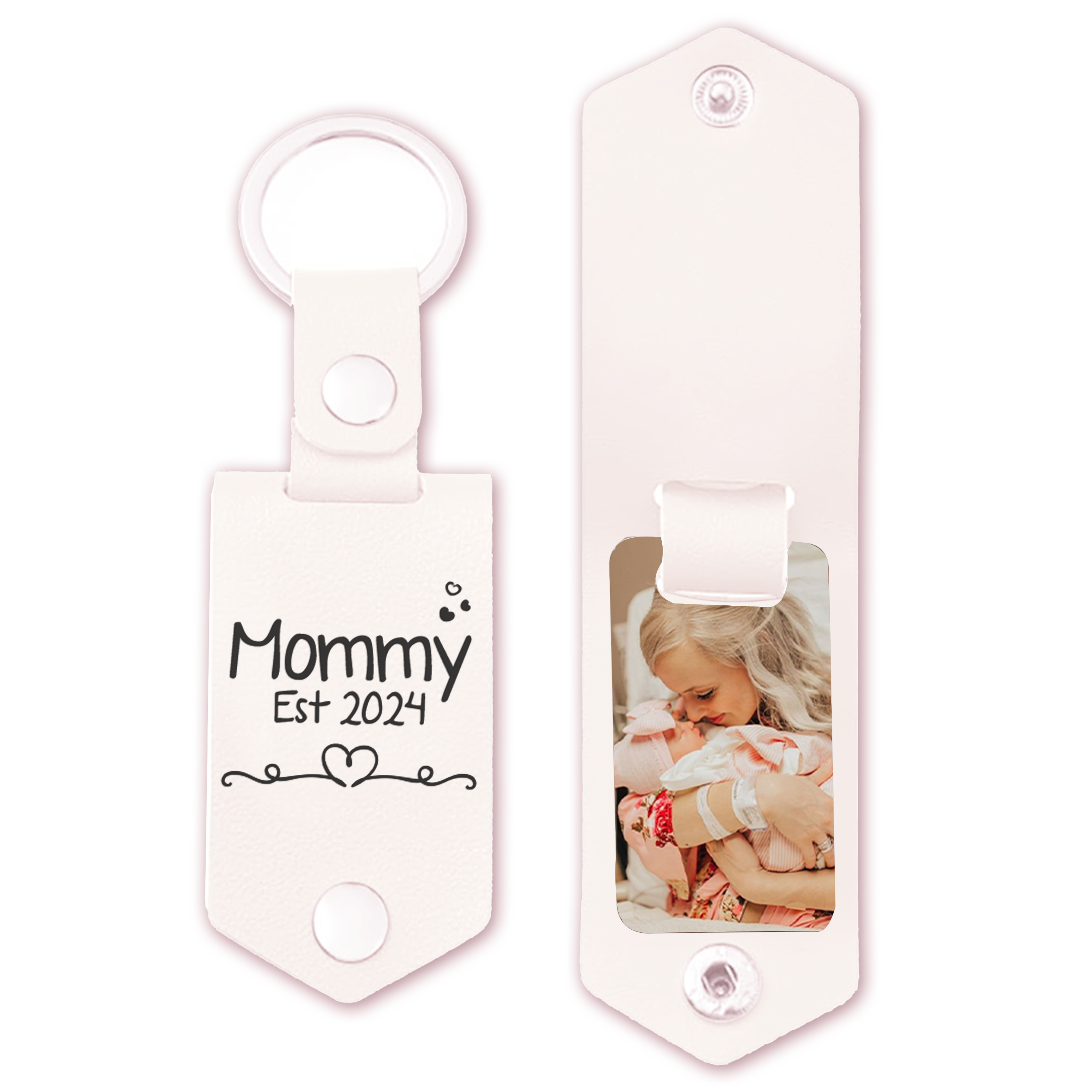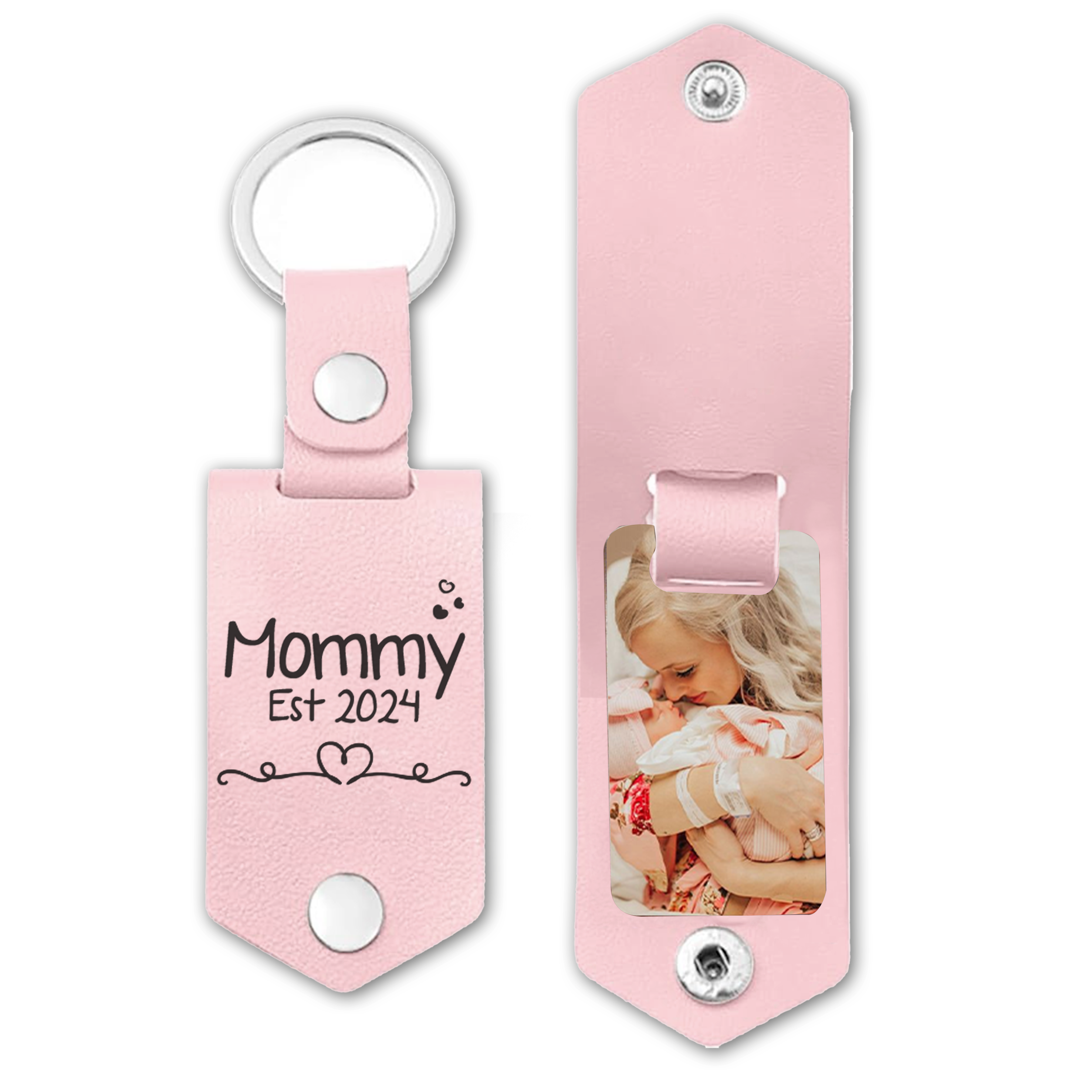 Don't miss the chance to celebrate the joy, love, and strength of first-time motherhood. Shop now and give her first mothers day gift | mommy est photo leather keychain that encapsulates the beautiful essence of being a new mom.