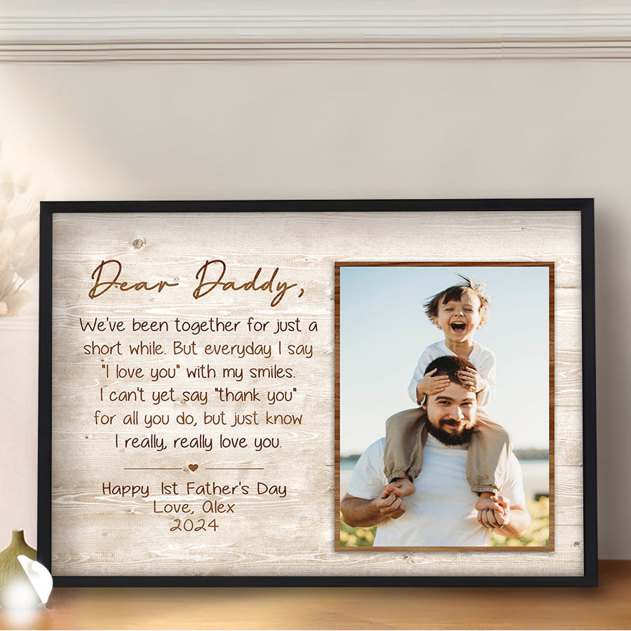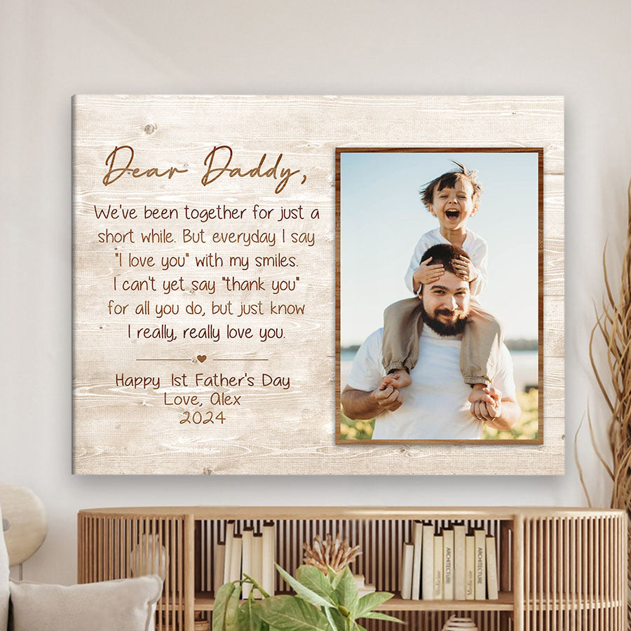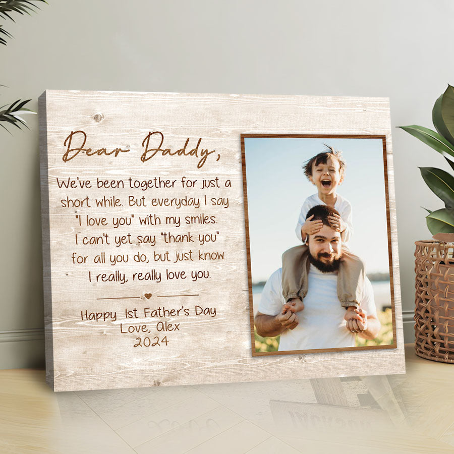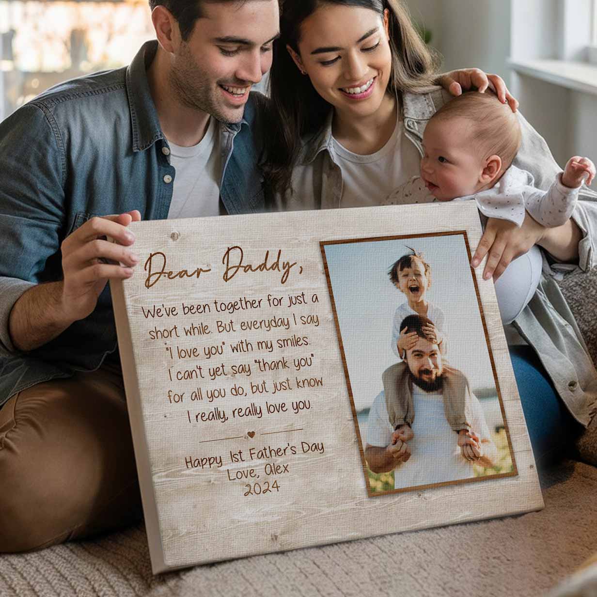 Treat the new dad in your life to first time fathers day gift | first daddy day gift | gifts for first fathers day that commemorates the baby's arrival and his first Father's Day. Our personalized photo canvas is sure to bring a smile seeing little ones grow up before their eyes. Customize it FREE now - he will love displaying this treasured memory for many years to come.