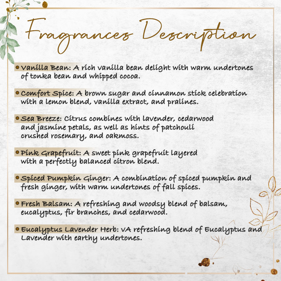 ♥️ Styles: The candle is available in a range of fragrances such as ♥️ Vanilla Bean, Sea Breeze, Comfort Spice, Pink Grapefruit, Spiced Pumpkin Ginger, Fresh Balsam, and Eucalyptus Lavender Herb.