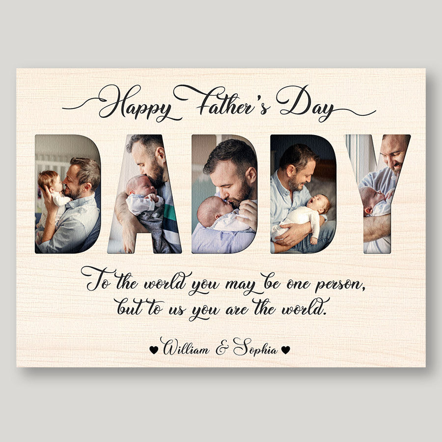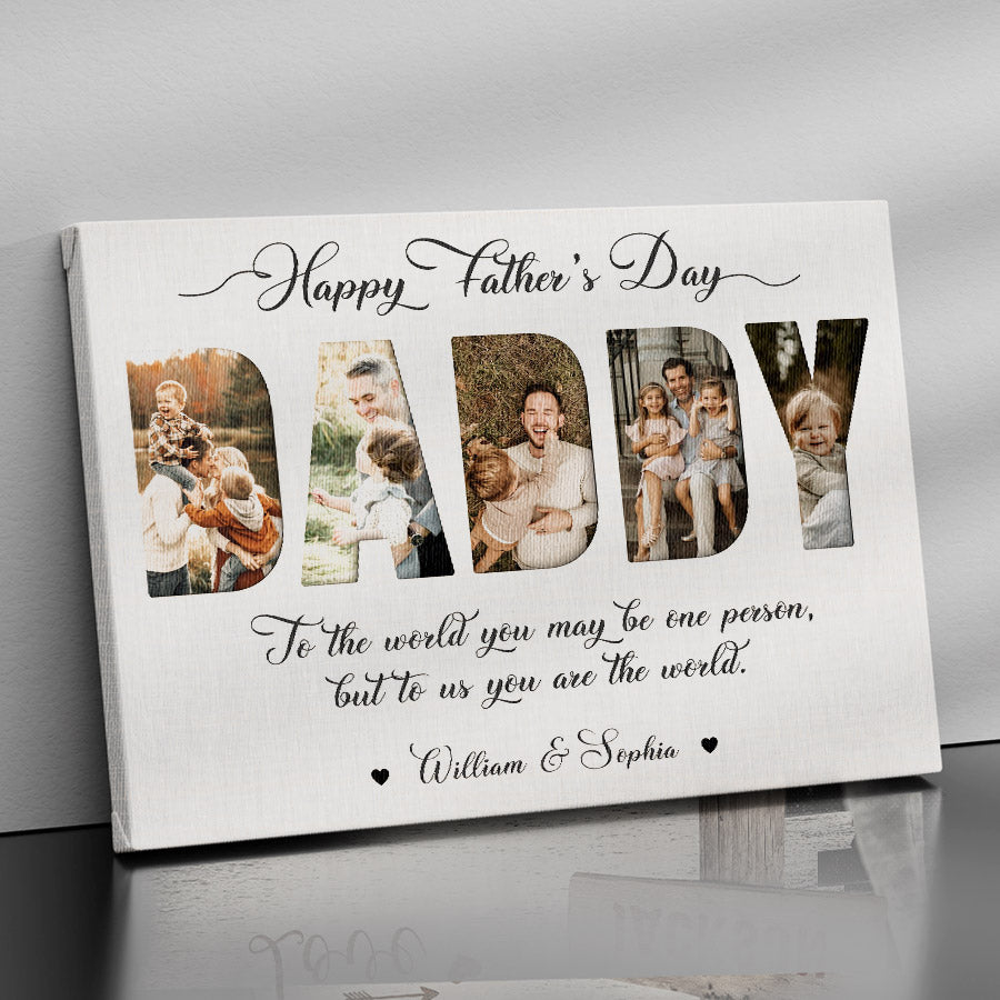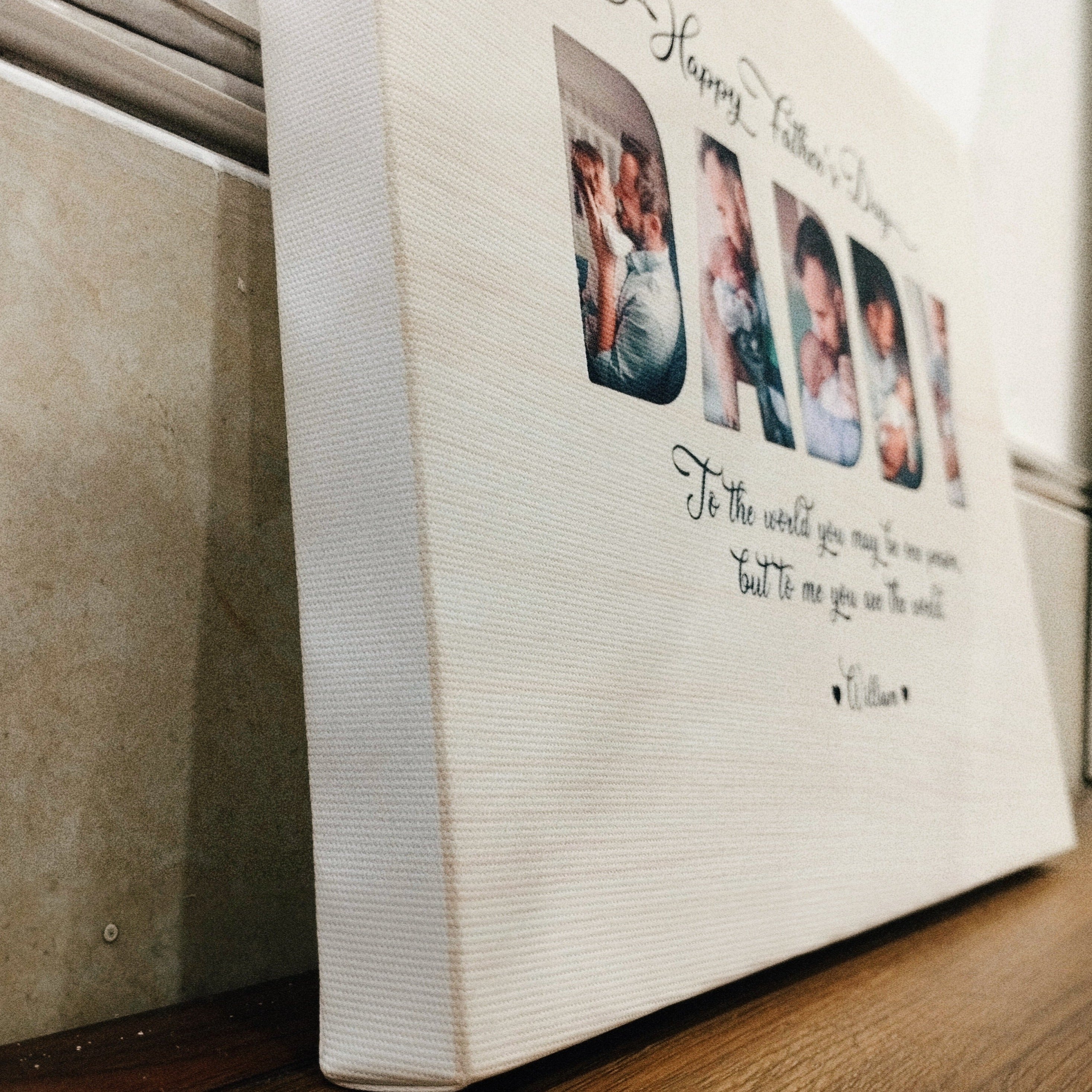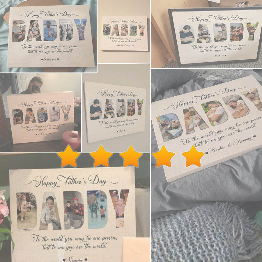 This DADDY design is the most trending this year, add your beautiful photos to DADDY to create a unique gift for him this Father's Day! Creating a Father's day canvas for the man who has given you so much can be challenging to find the perfect gesture. A gift for dad from his cherished memories or inside jokes you share is a meaningful gift that lets Dad know how much you care.