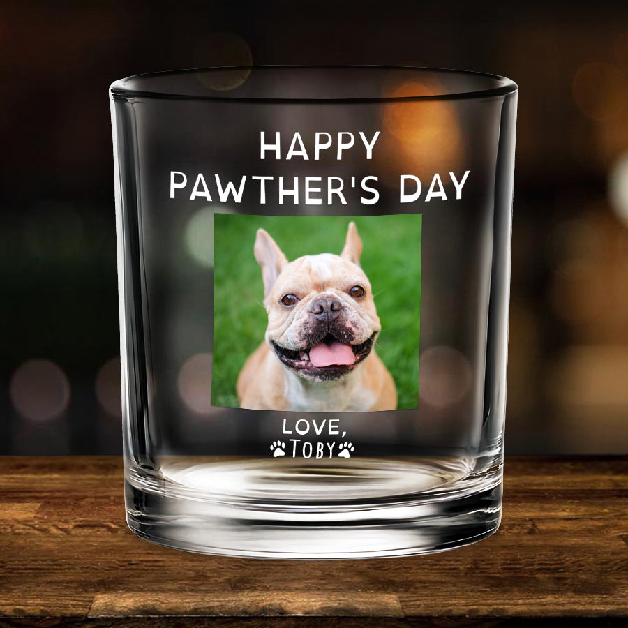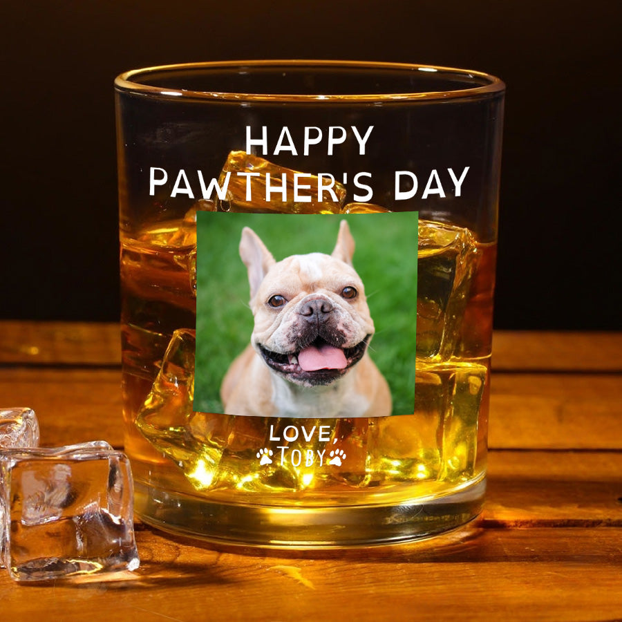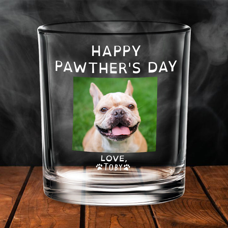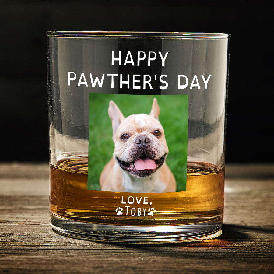 Fathers will smile when they see their face looking back at them from this one-of-a kind whiskey glass, surrounded by paw prints and images of their loyal dog companions.