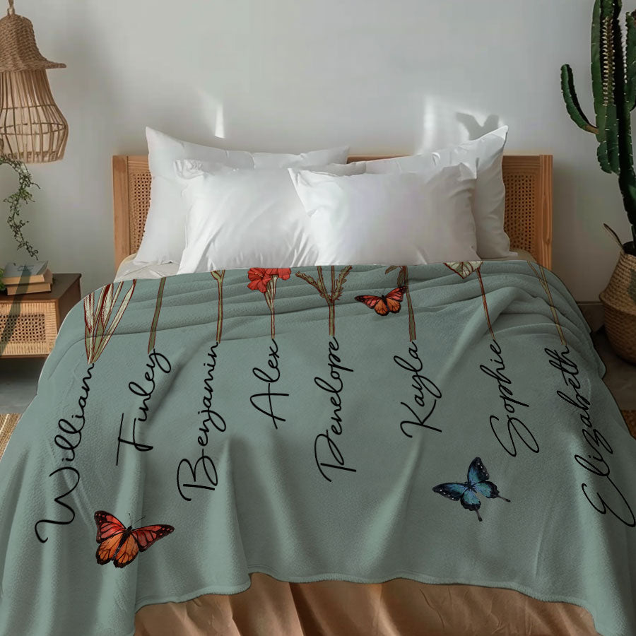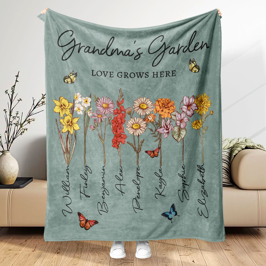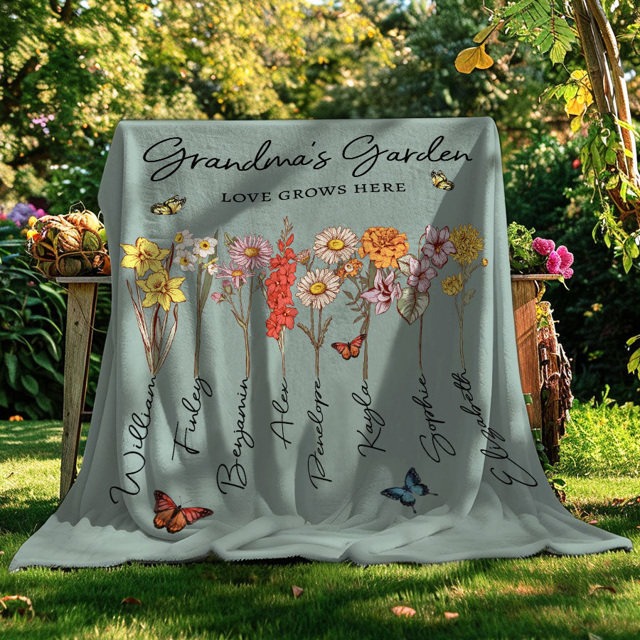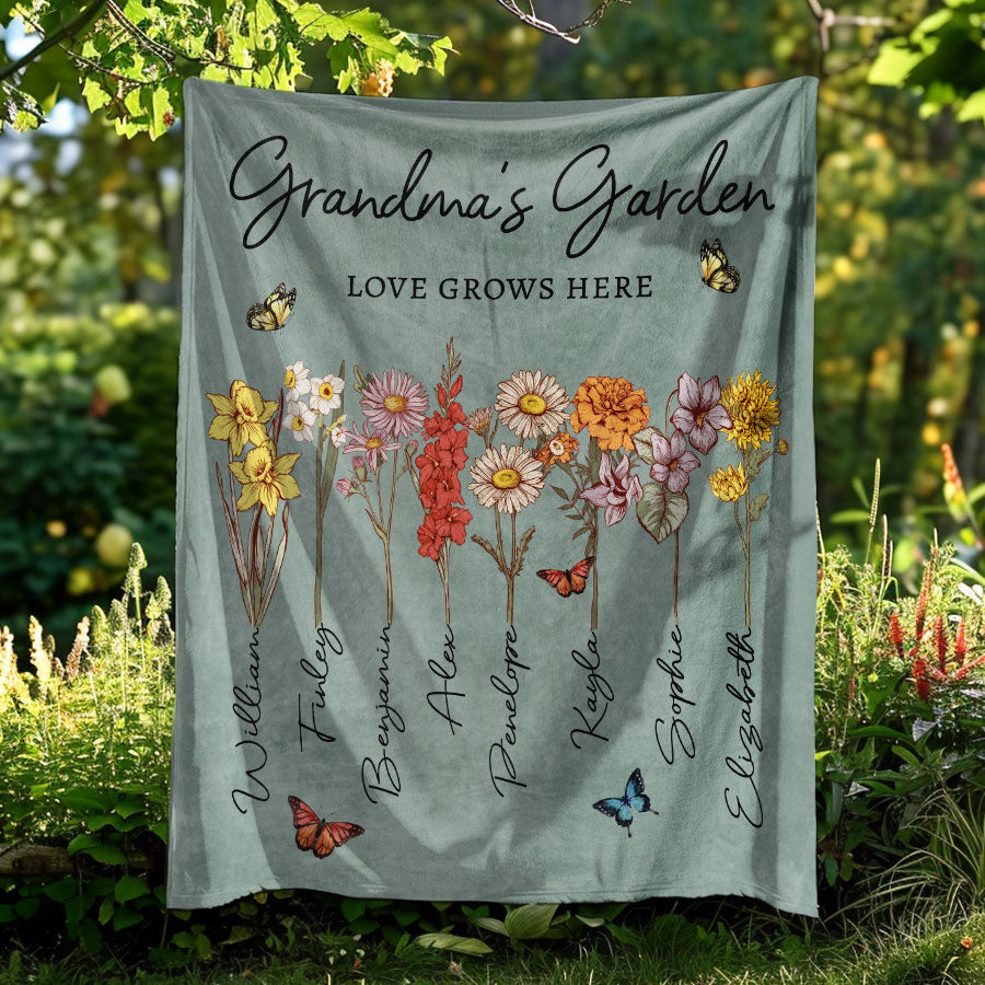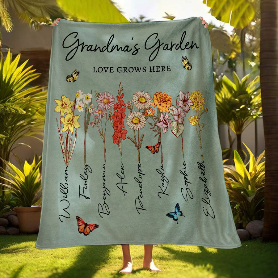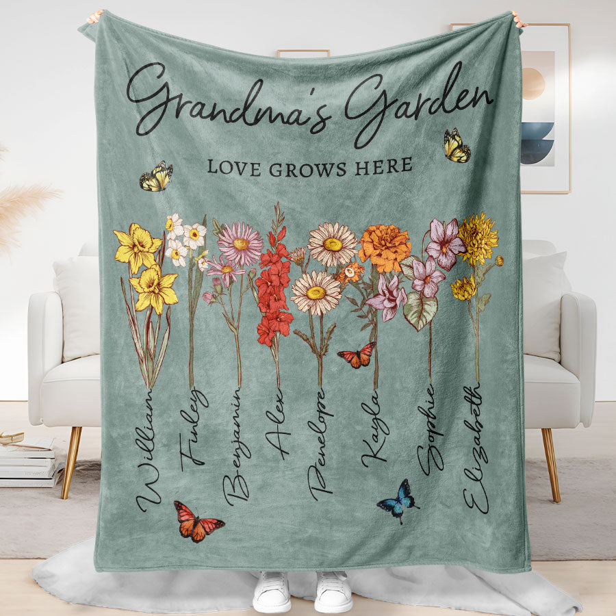 Shop now and create grandma’s garden blanket | custom grandma’s garden birth flowers gift that will bring a smile to her face and warmth to her heart. Give her a gift she'll treasure for years to come. Order your gift today and let your grandma know she holds a special place in your heart.