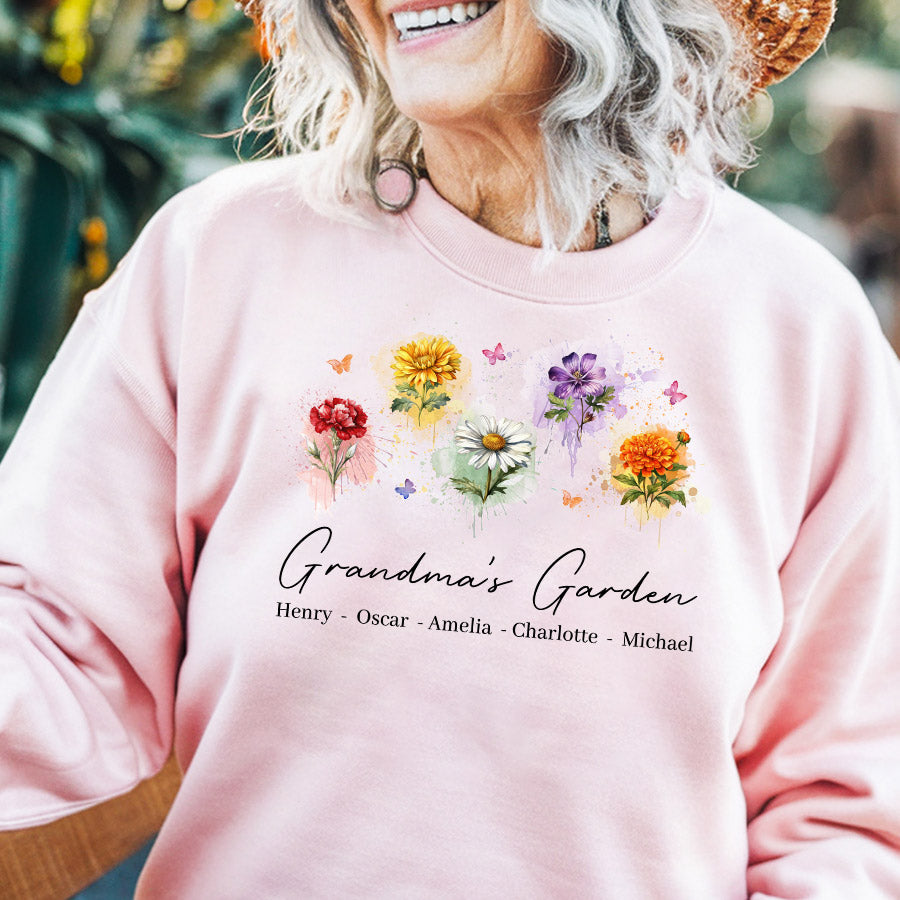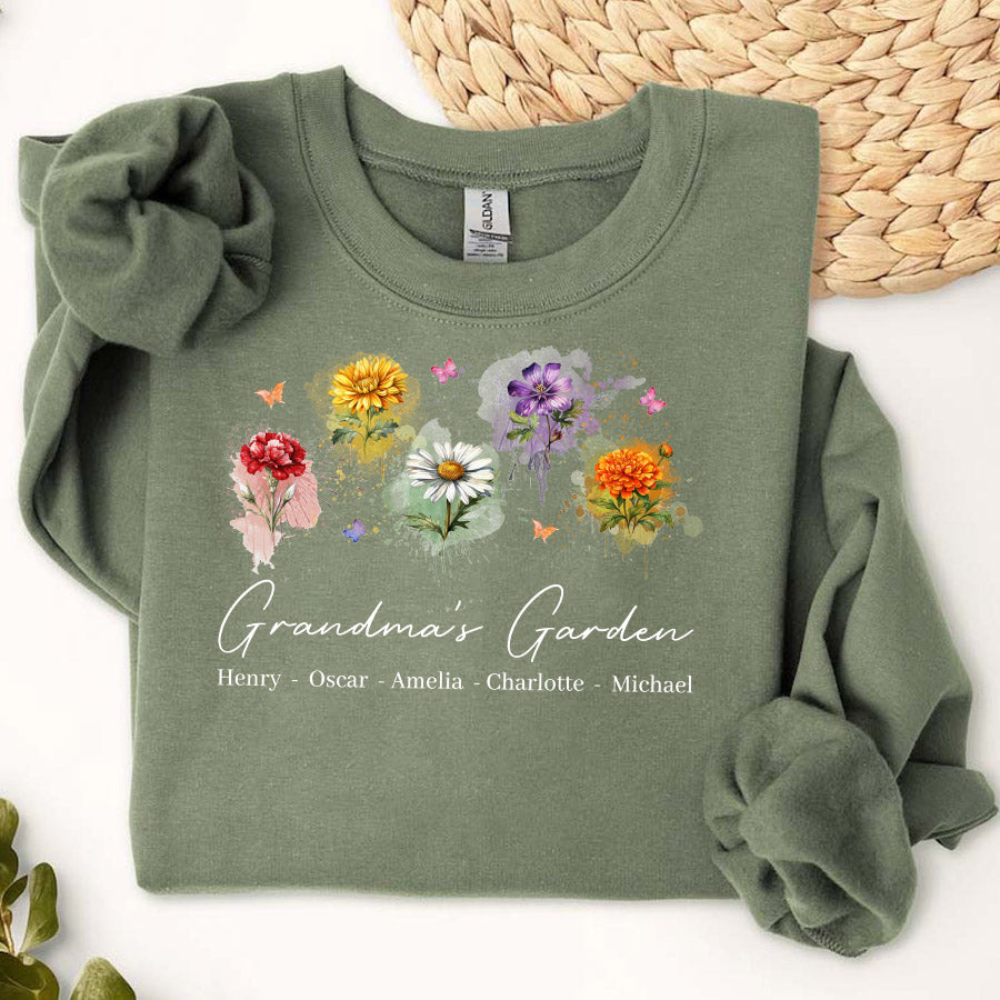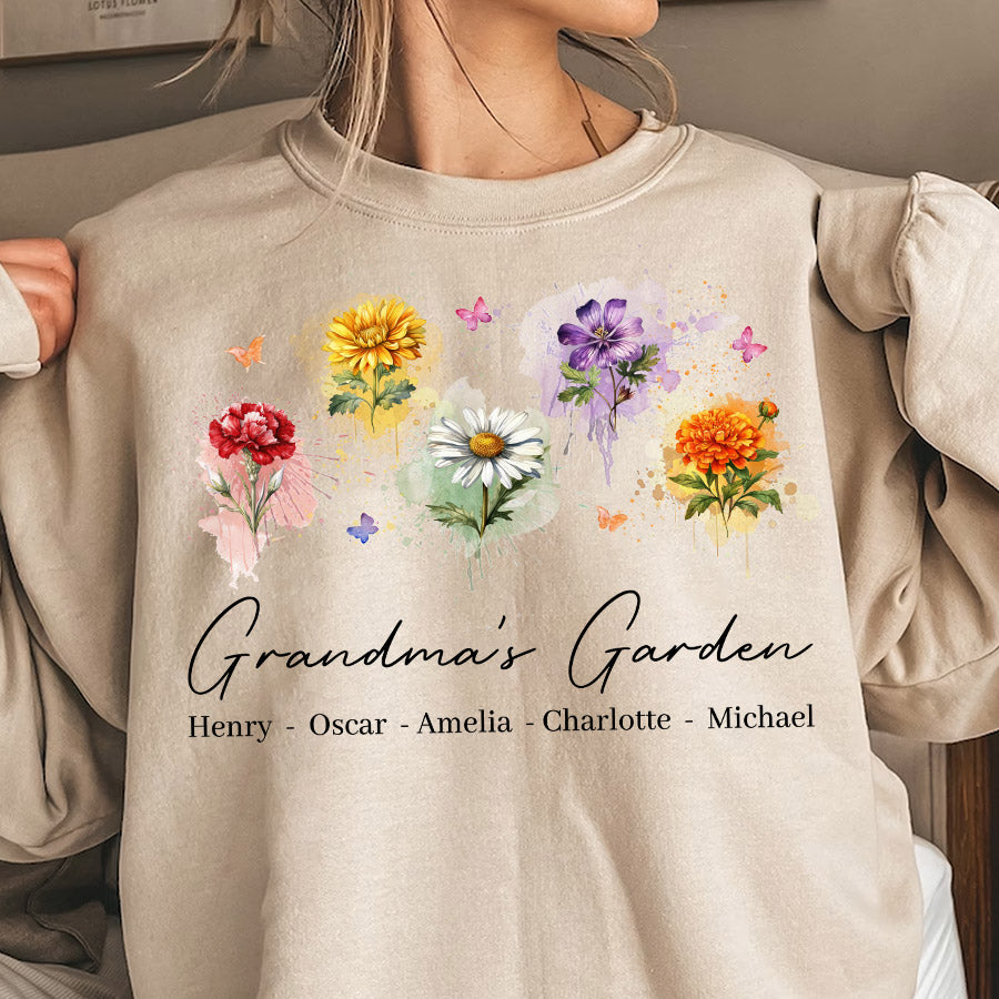 Keep grandma cozy in her garden oasis with the sweatshirt grandma’s garden gift | custom mother's day gifts for grandma featuring her grandchildren's birth month flowers. This extraordinary grandma garden gift is more than just a piece of art; it's a heartfelt tribute to the incredible woman who has made a lasting impact on your life. Whether she's potting petite pansies or pruning her prize-winning petunias, Grandma's garden is where family bonds take root. It's her peaceful place to nurture nature's beauty and cherish moments with those who fill her world with joy.
