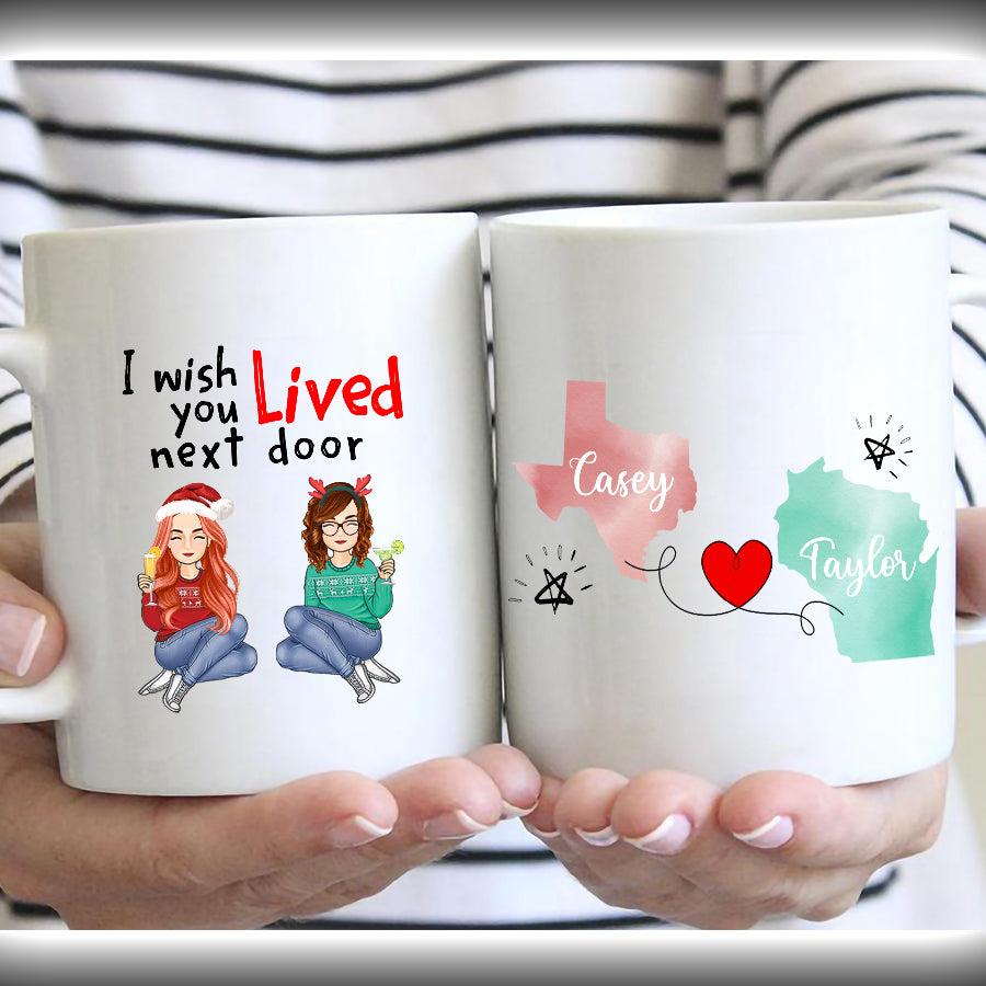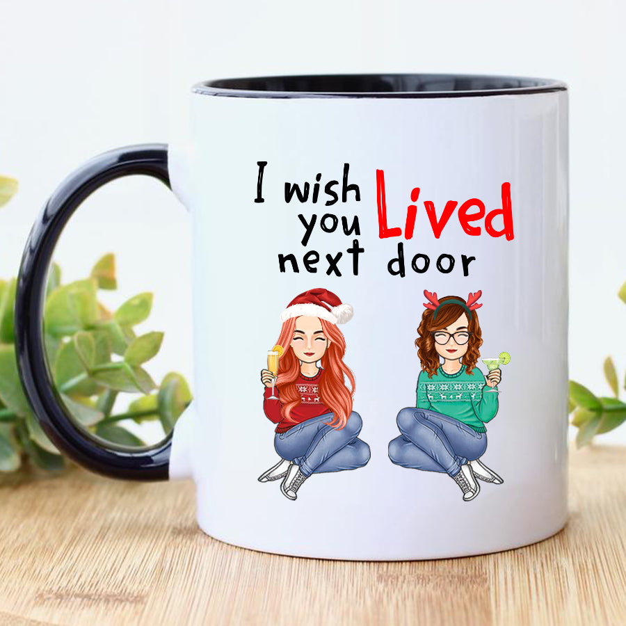 Start each day with the warmth of friendship by gifting i wish you lived next door mug. In our fast-paced world, losing touch with busy schedules is easy. However, strong social bonds are vital for physical and mental well-being. This personalized mug makes the perfect pick-me-up to let someone special know you're thinking of them. This mug is one of the perfect Best Friends Christmas Ornaments and Christmas Gifts to show your best friend how much they mean to you. Give them this mug like one of the Personalized Christmas Ornaments will definitely brighten their whole holiday with more love than ever.