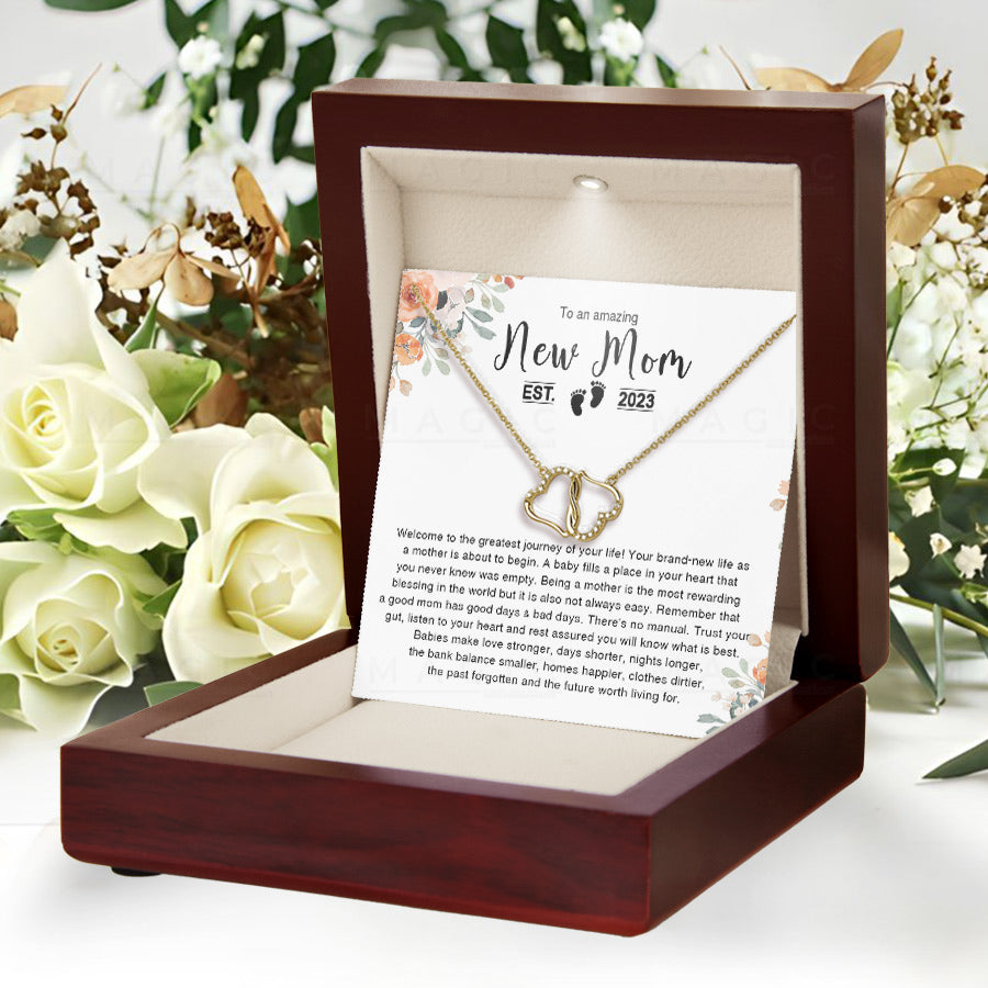 Crafted from high-quality materials like sterling silver, gold, or rose gold, this material of mom to be gifts will make it easy for her to show off a little bit of your care for her. The adjustable chain length provides a comfortable and customizable fit, making it a versatile accessory that can be worn on any occasion.